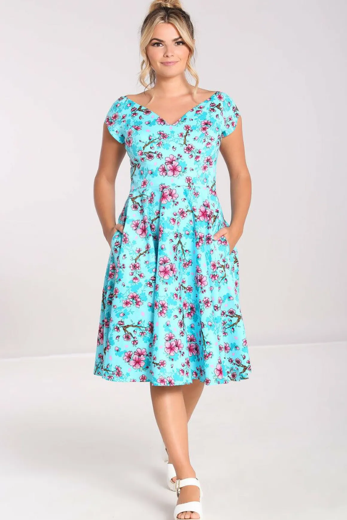 Printed Midi Printed DressPrint Is Of Pink Blossom Flowers On A Blue Background Fitted Bodice With Sweetheart Neckline W…