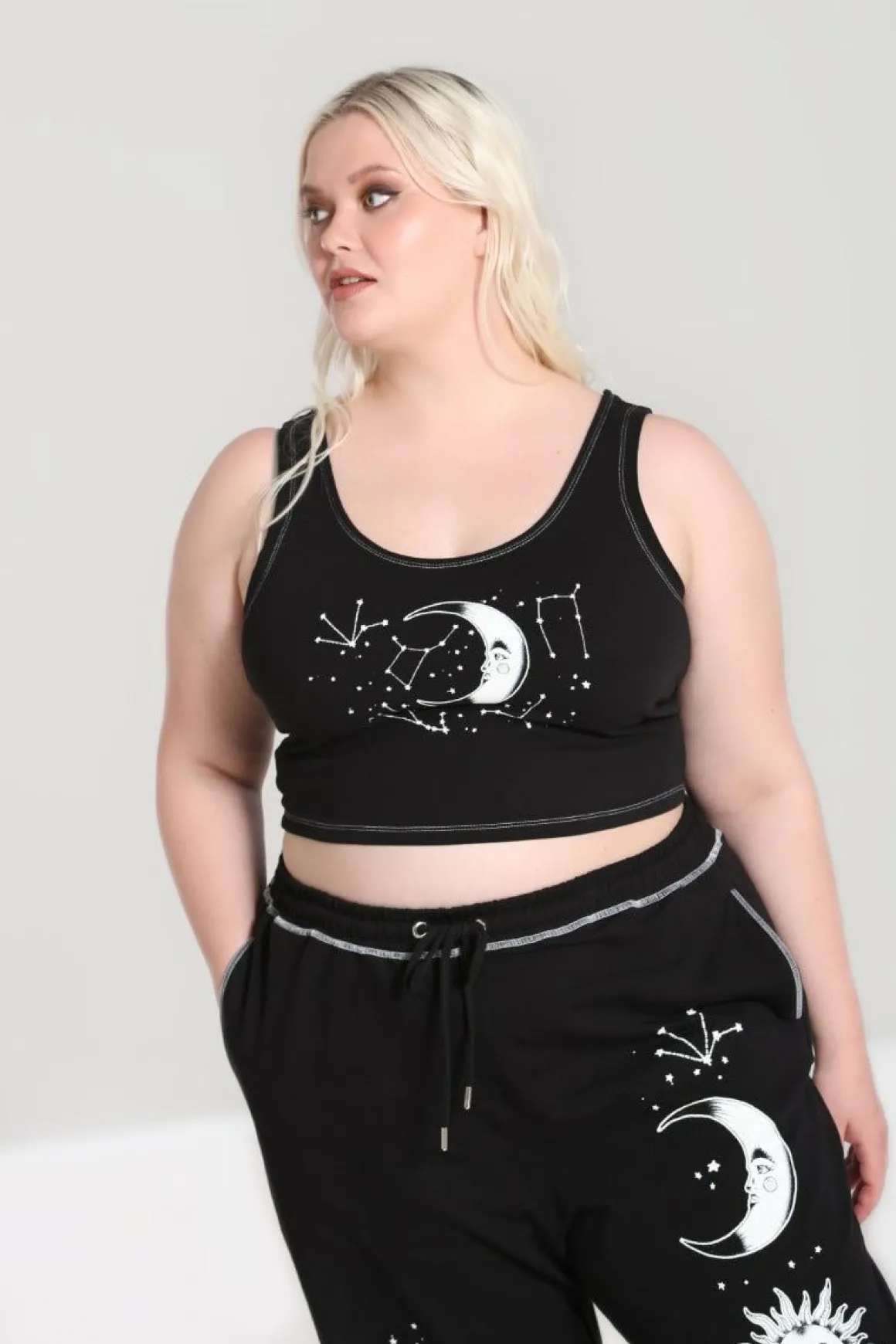 - Black Fitted Cropped Top Decorated With A Starry Sky And Crescent Moon Artwork On The Front