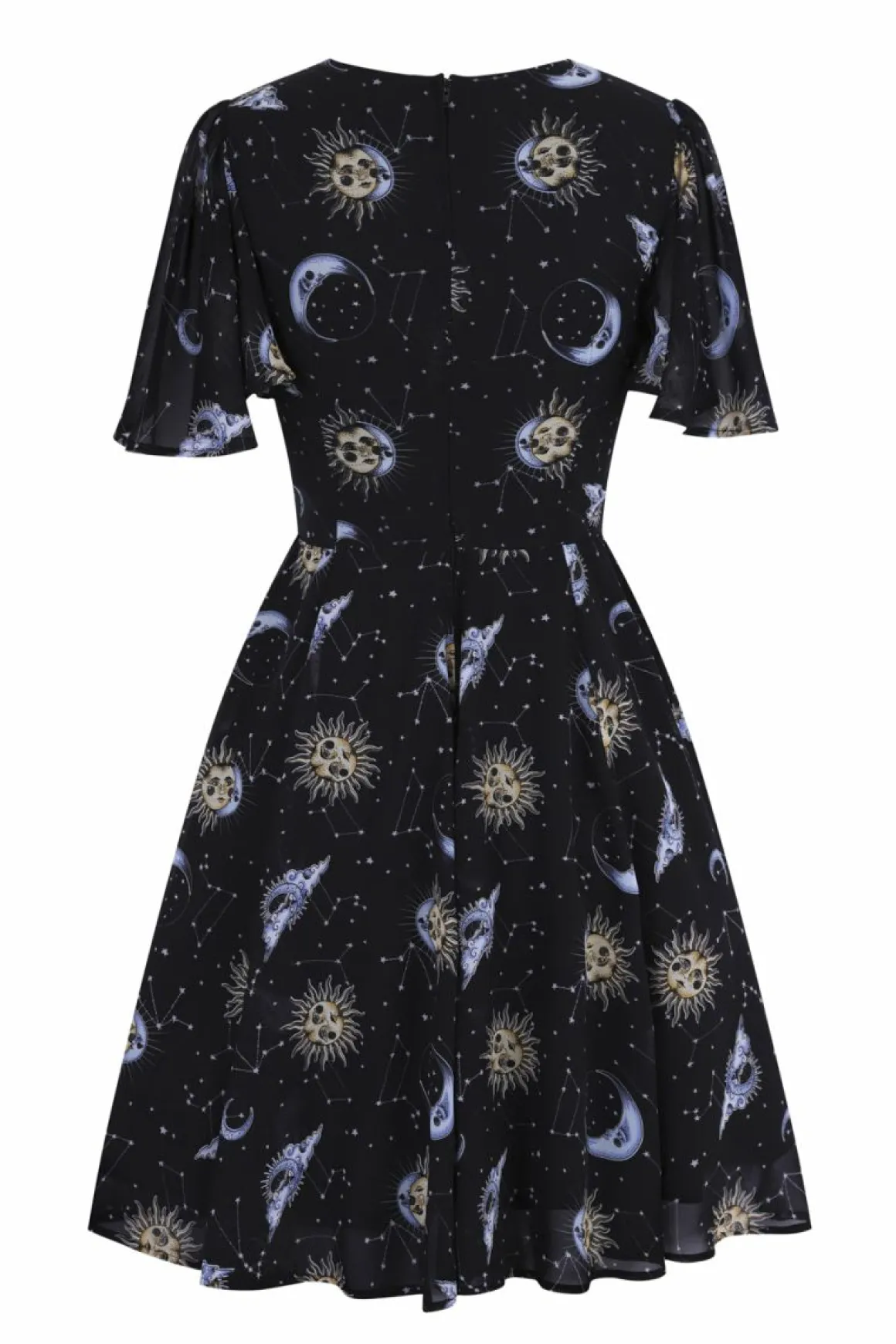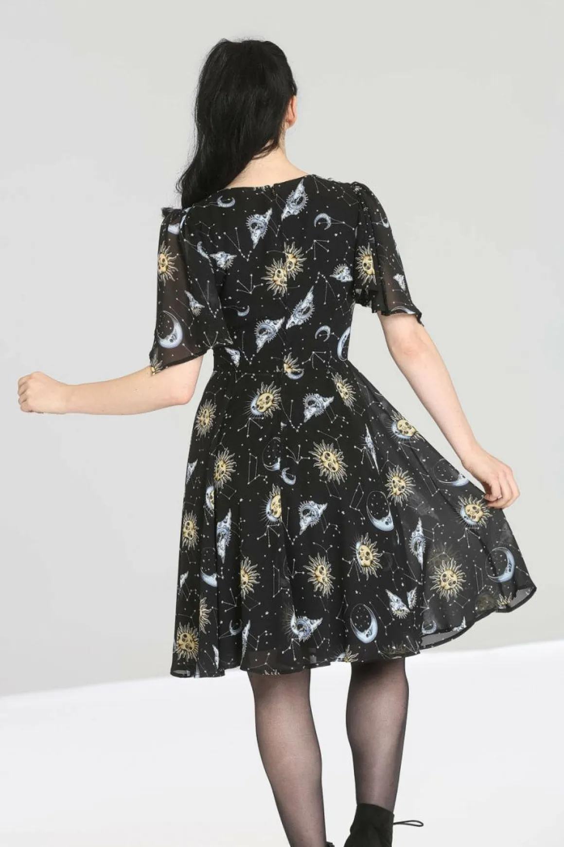 Printed Chiffon Dress.Sun And Moon Print On A Black BackgroundDraped SleevesV NecklineBlack Jersey Lining IncludedZip In…