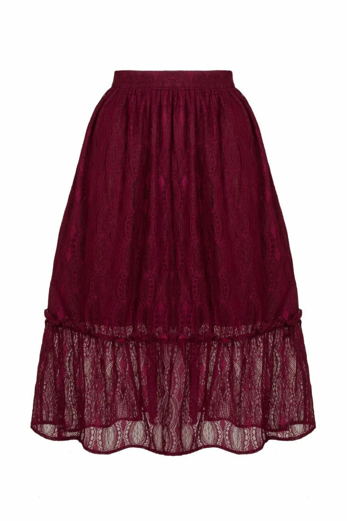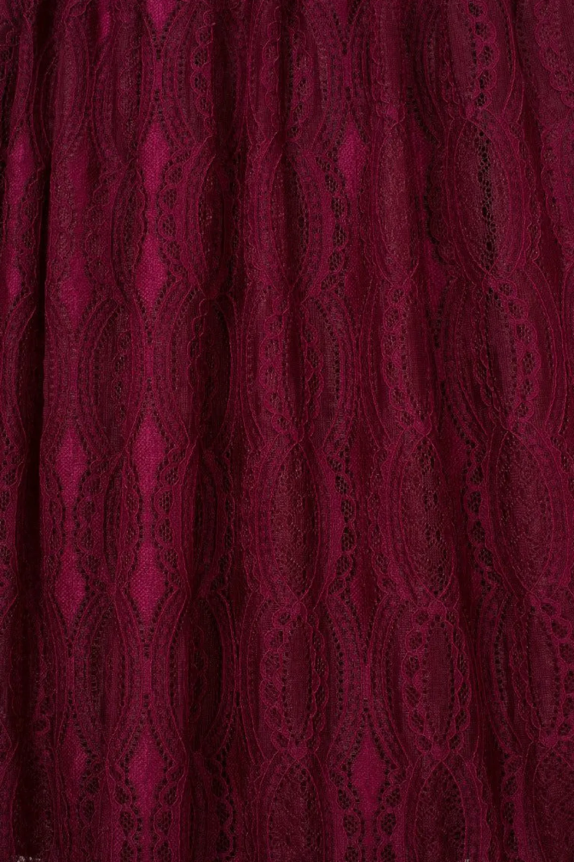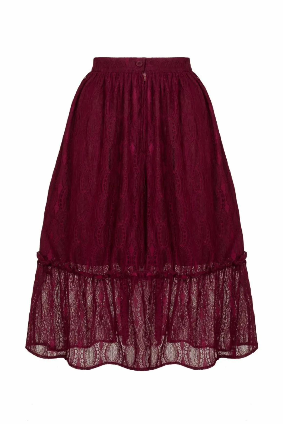 Burgundy Lace Midi SkirtWaistband In Self Fabric Gathering Around Waistline Into SkirtSeam On Skirt With Gathering And F…
