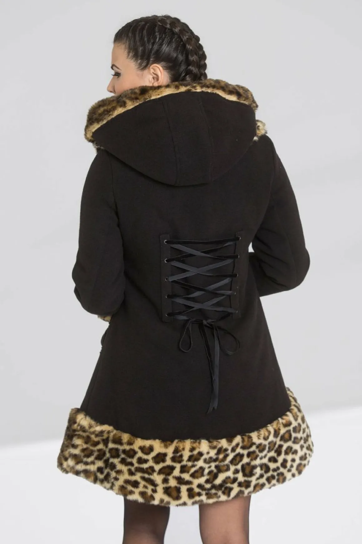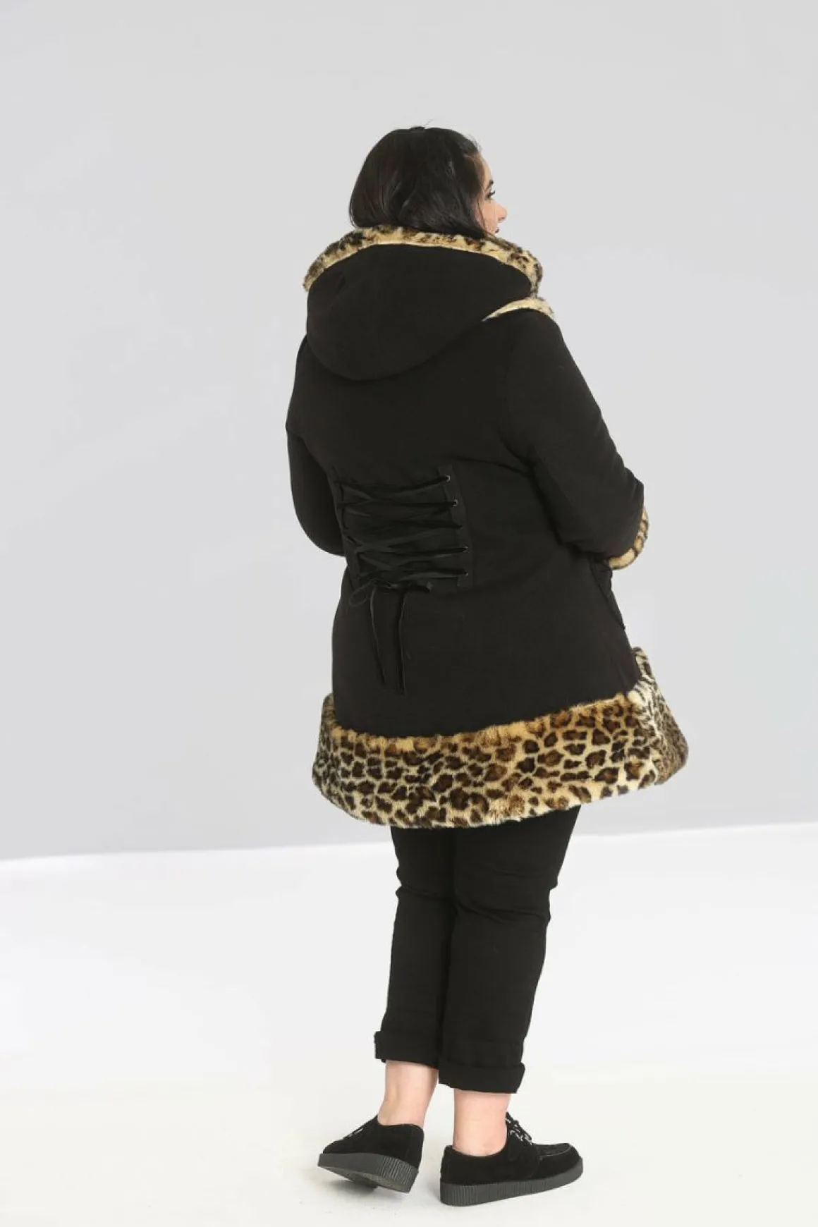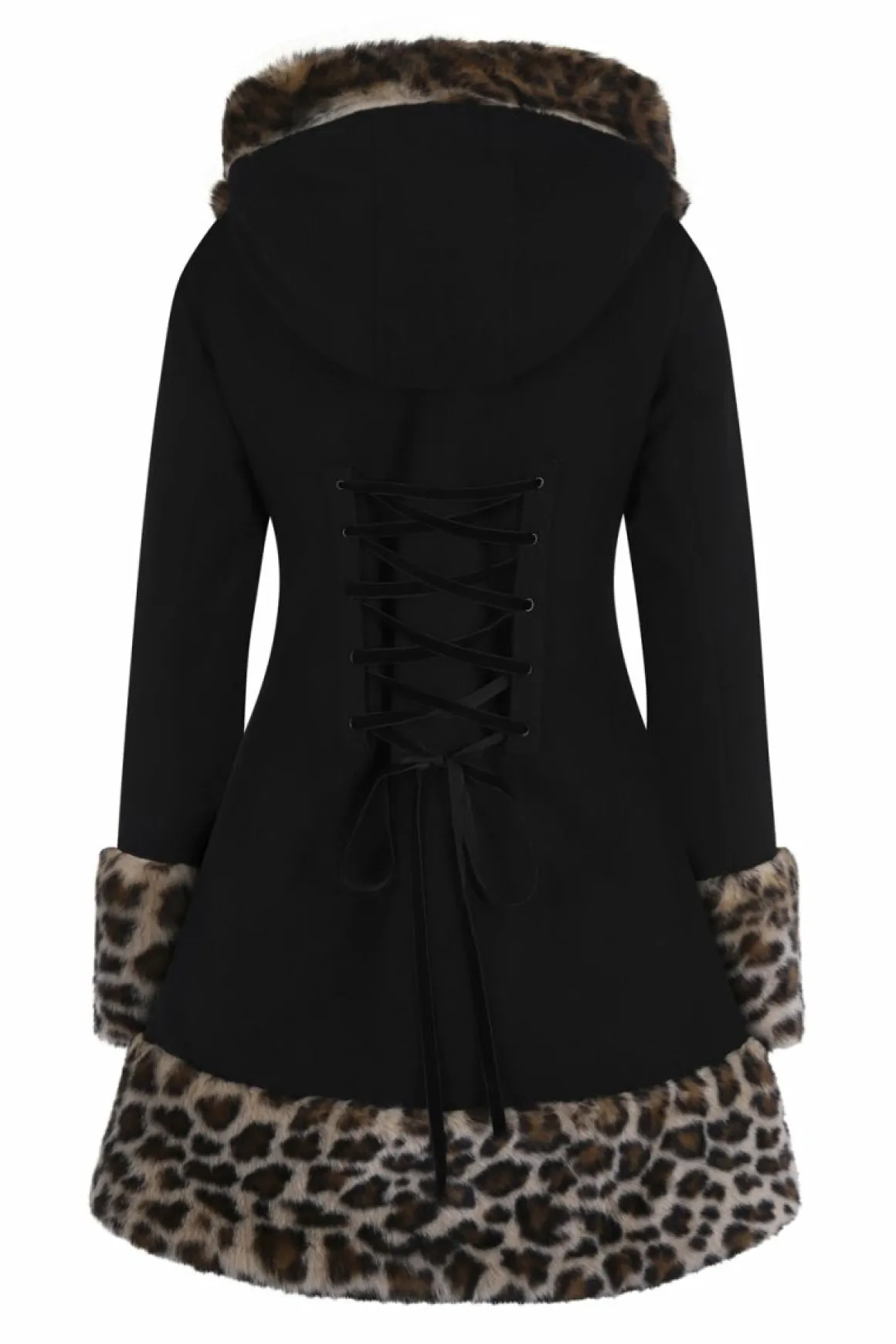 Black Lolita Style CoatLeopard Faux Fur Collar, Cuffs And HemPockets In Self Fabric Featuring A Bow And Black TrimRemova…