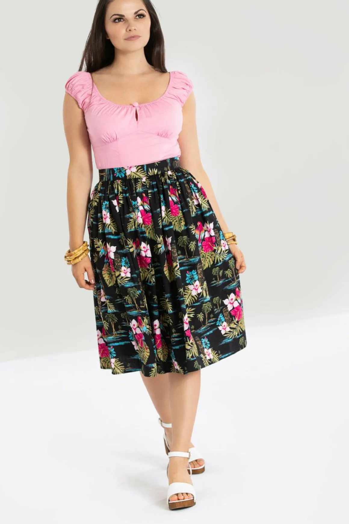Printed 50’S SkirtPrint Is Of Tiki And Parrots On A Black BackgroundGathering At WaistbandPockets In Side SeamsBack Zip …