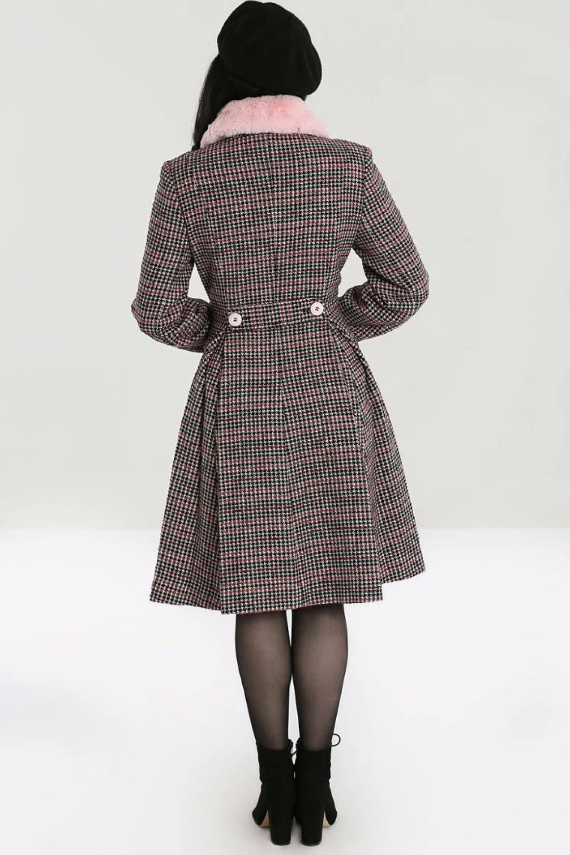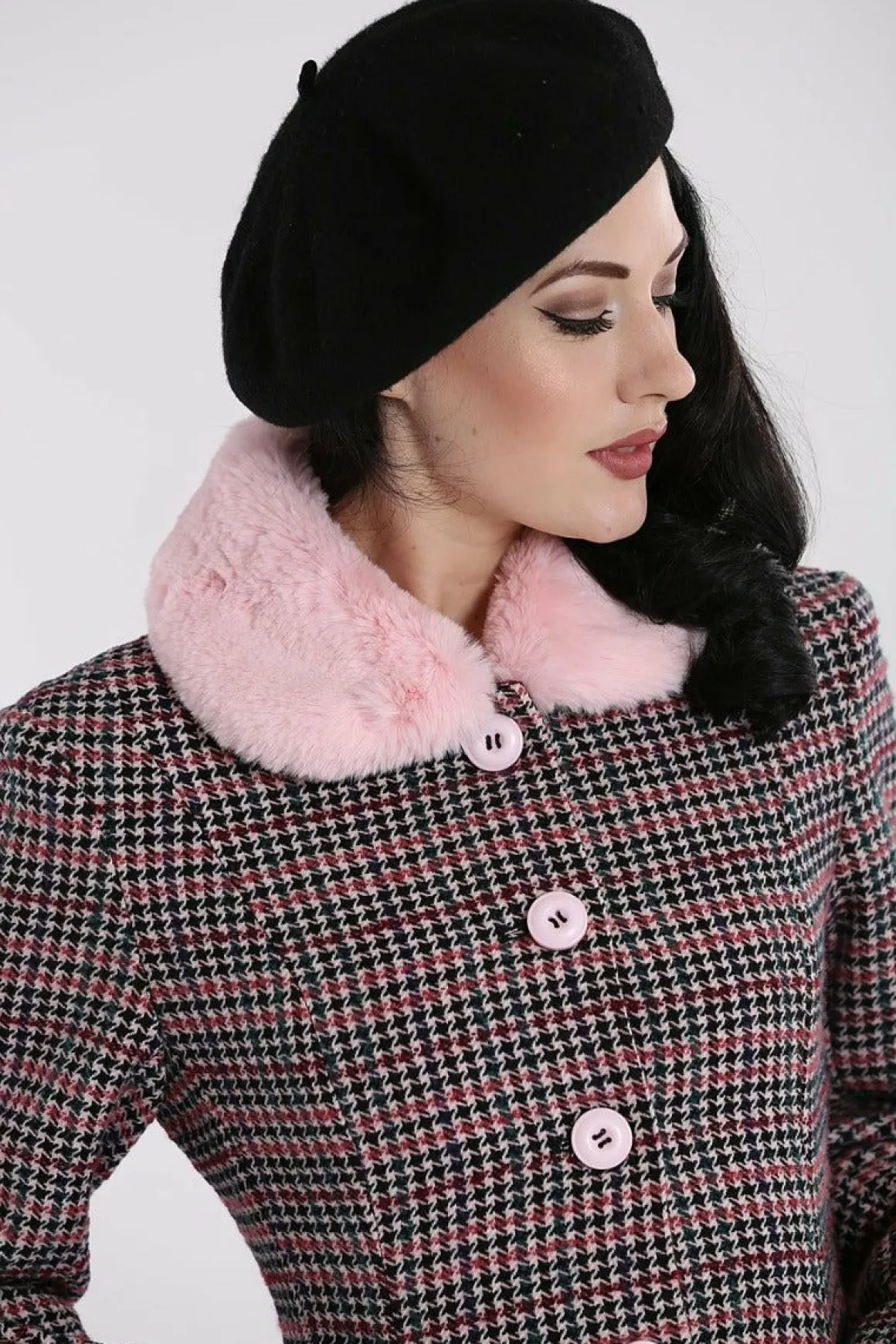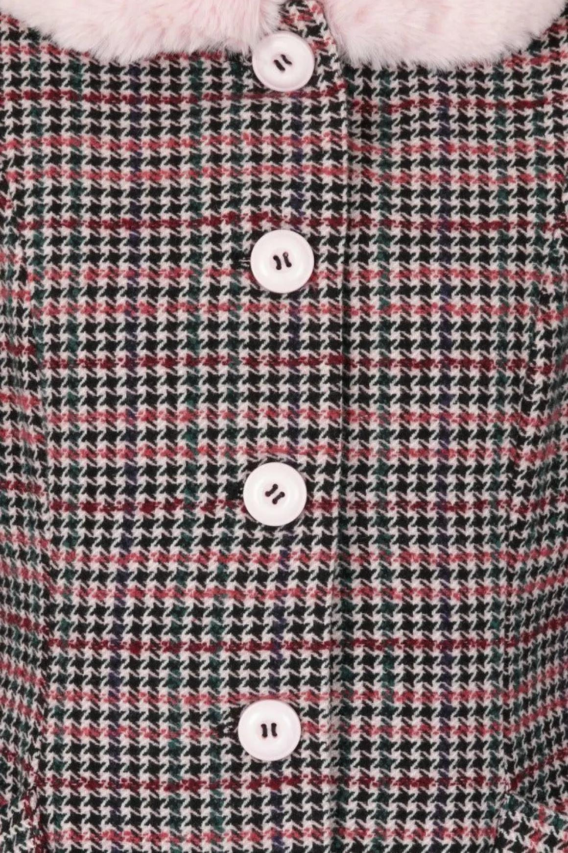 - Pink And Black Dogtooth Coat With Pastel Pink Faux Fur Collar