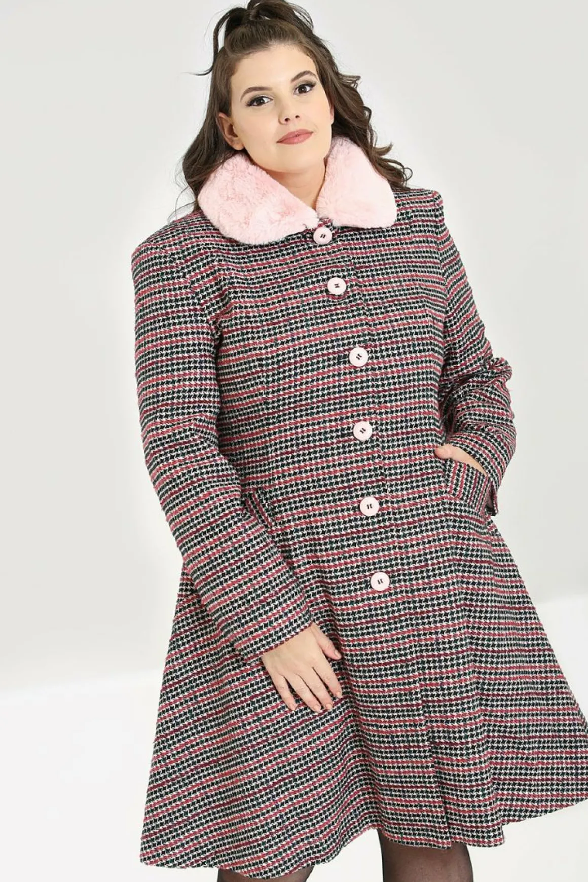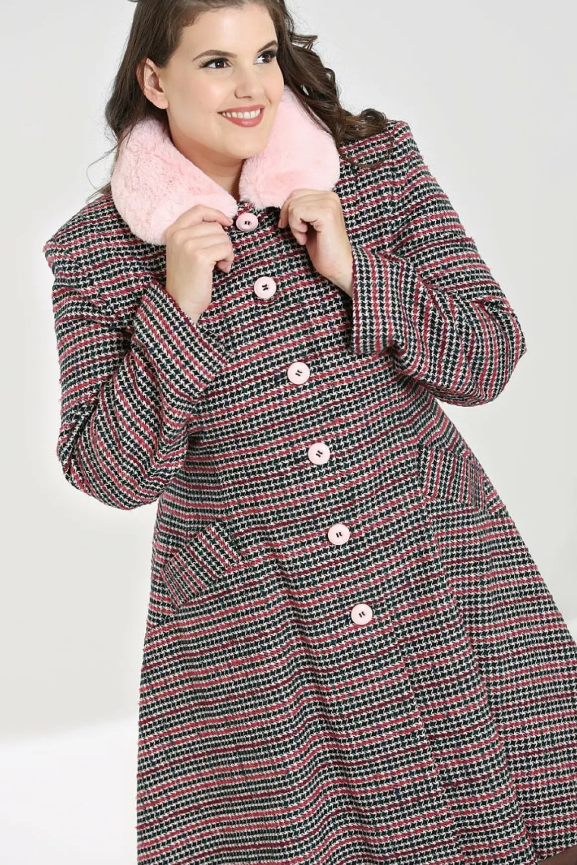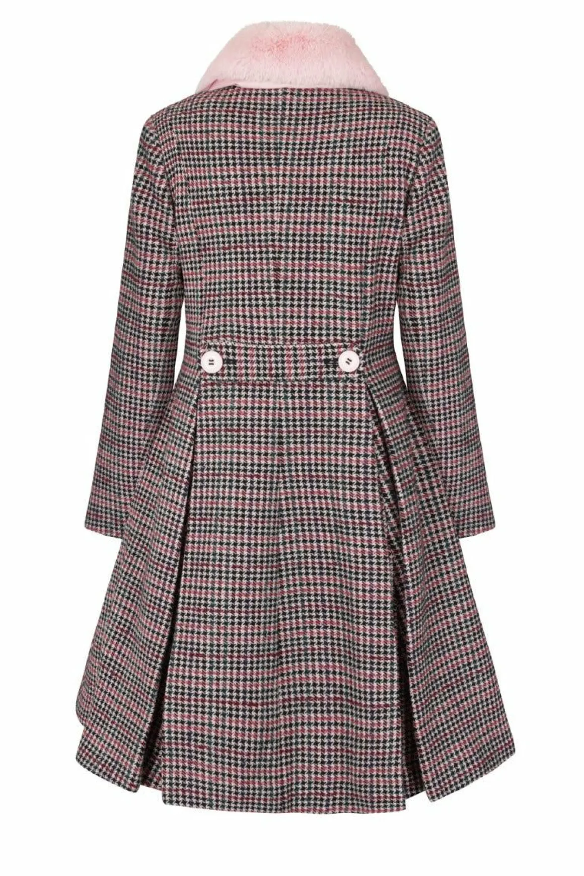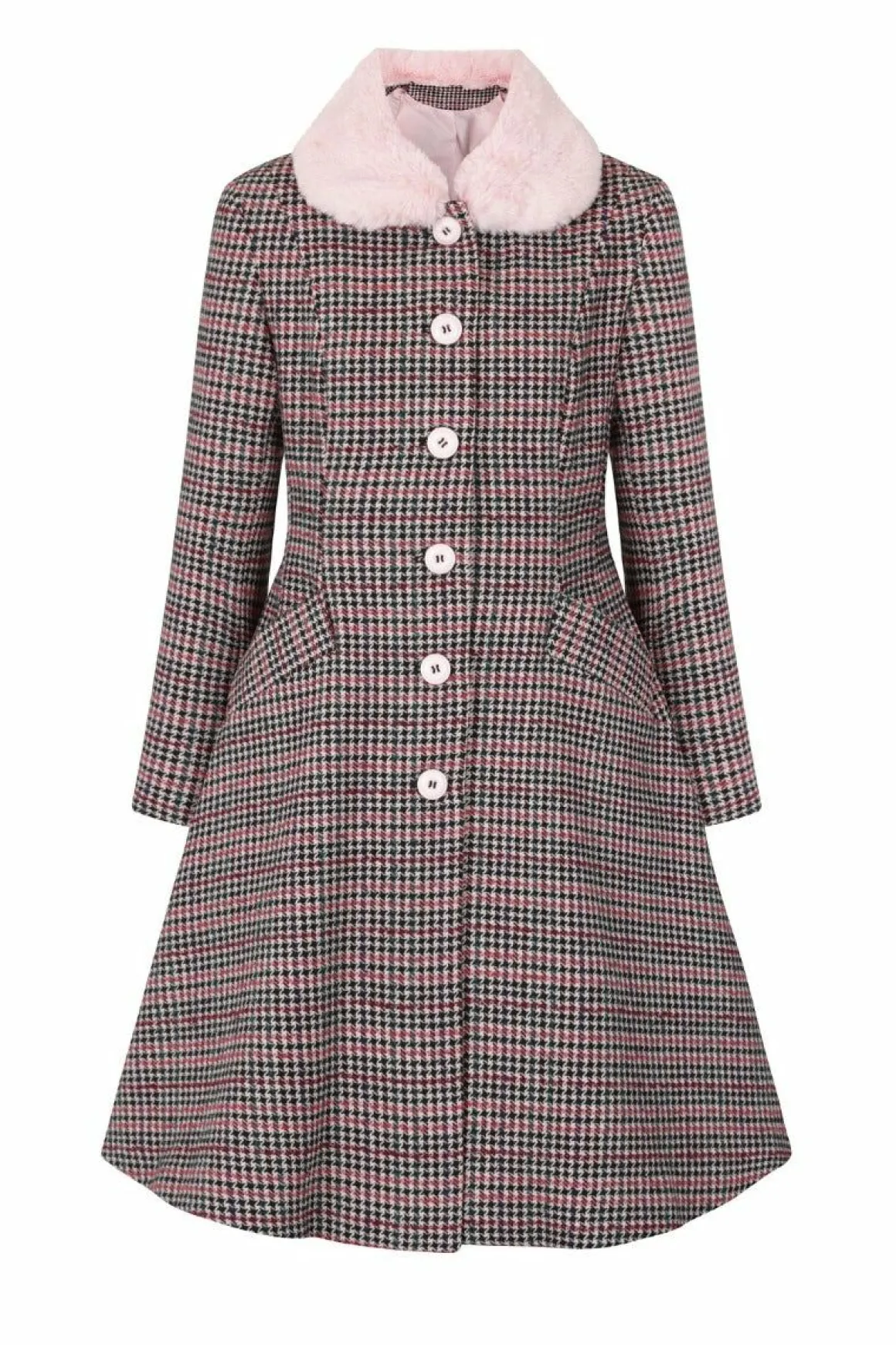 - Pink And Black Dogtooth Coat With Pastel Pink Faux Fur Collar