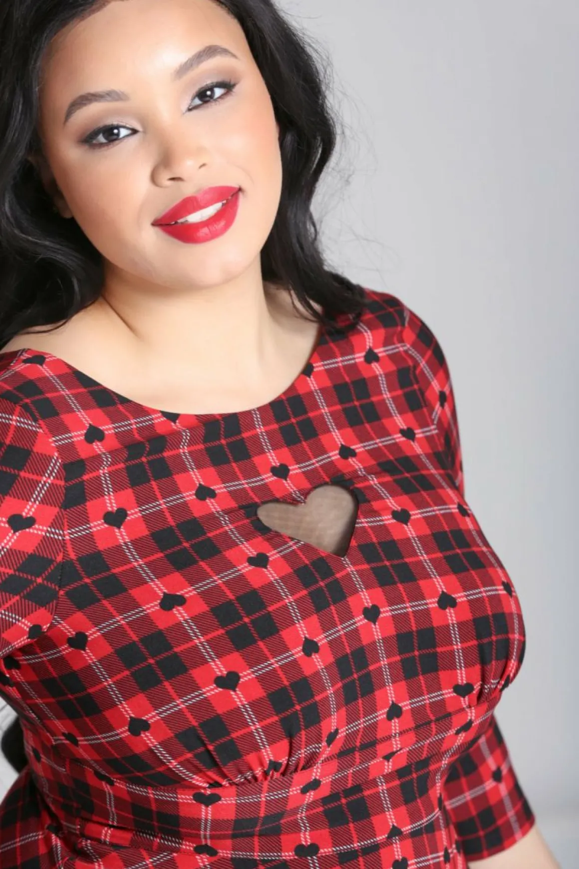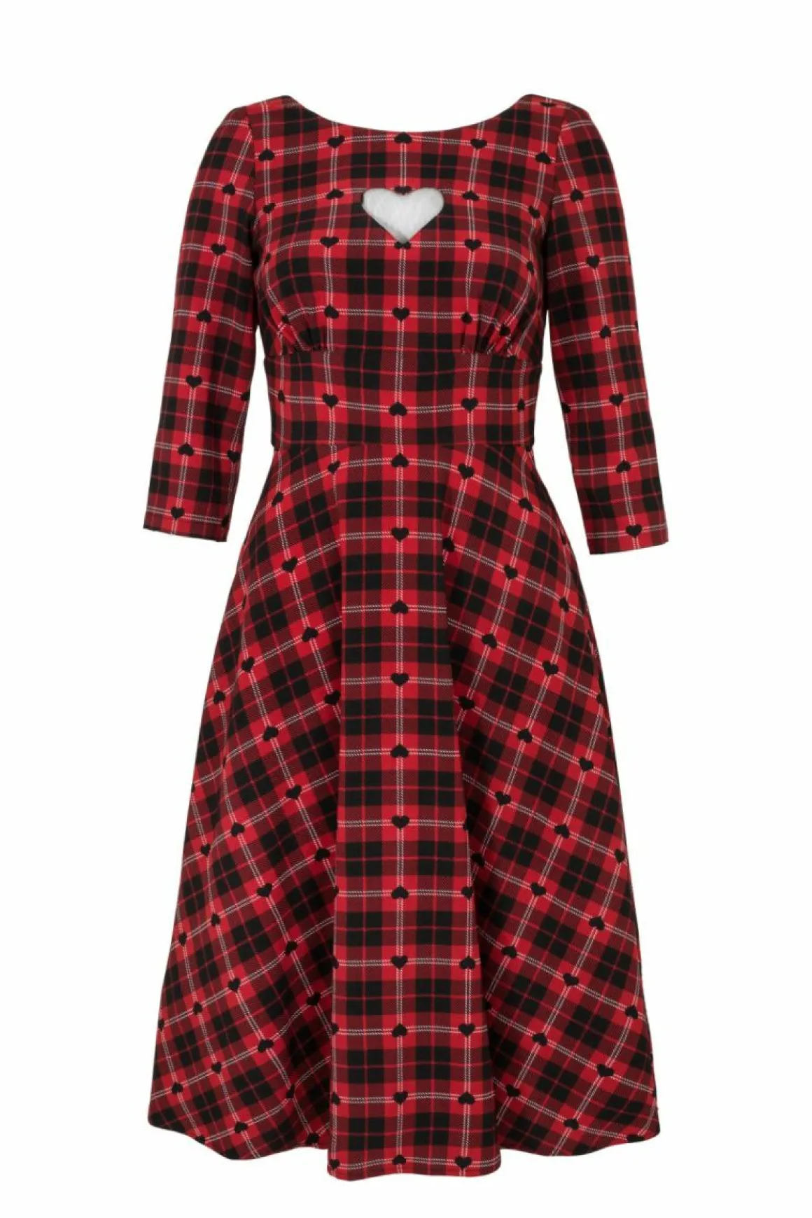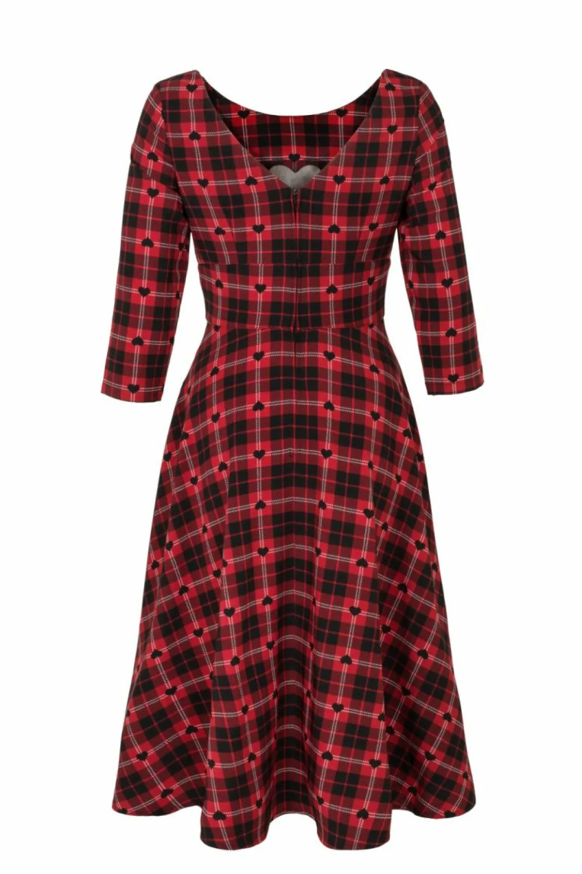50S Style DressRed And Black Printed Tartan With Little Black Hearts3/4 Length SleevesWide Scoop Kneck Heart Cut Out On …