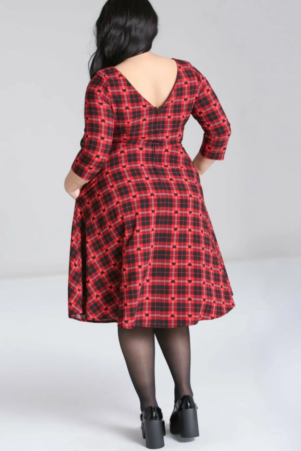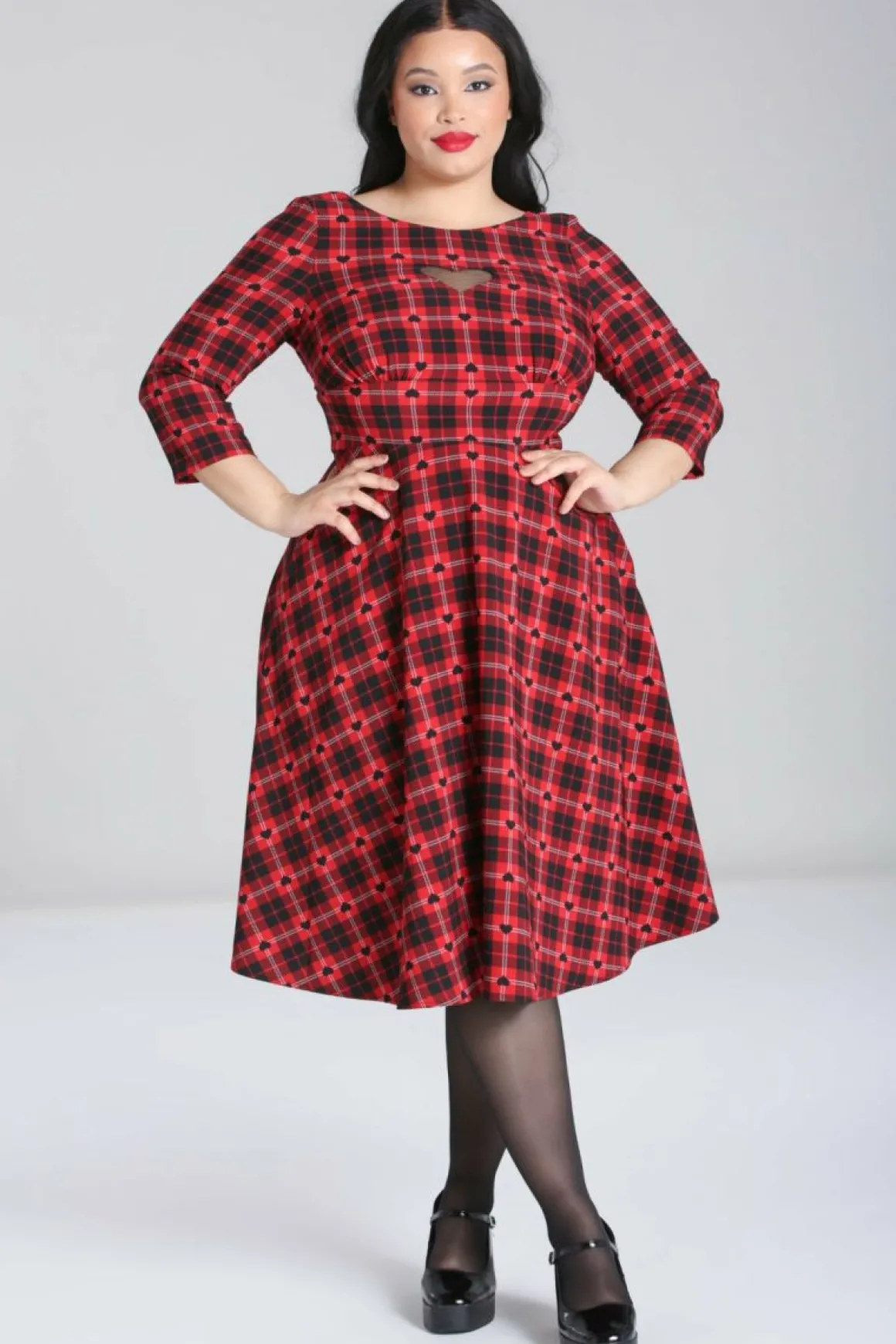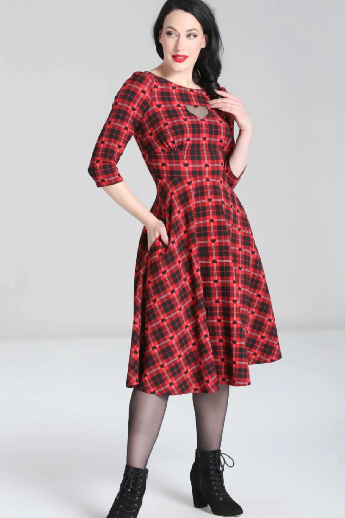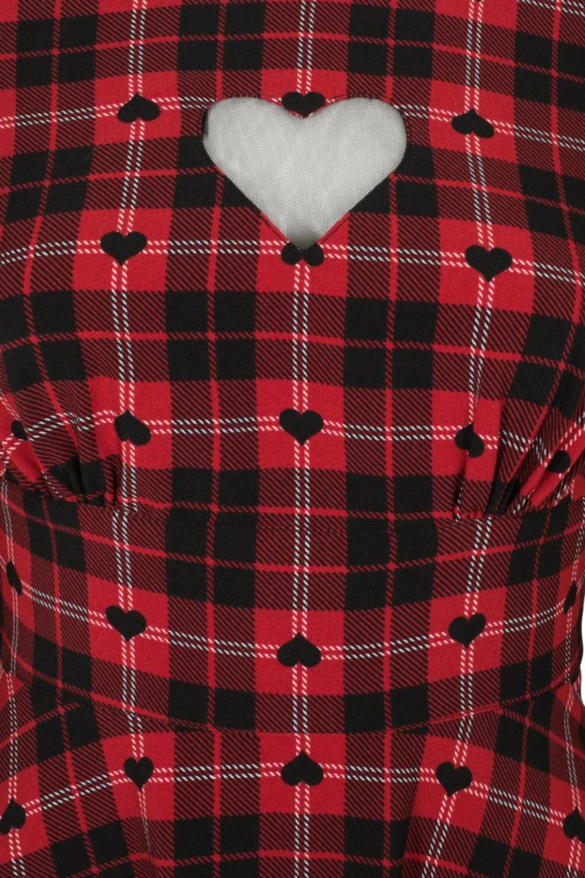 50S Style DressRed And Black Printed Tartan With Little Black Hearts3/4 Length SleevesWide Scoop Kneck Heart Cut Out On …
