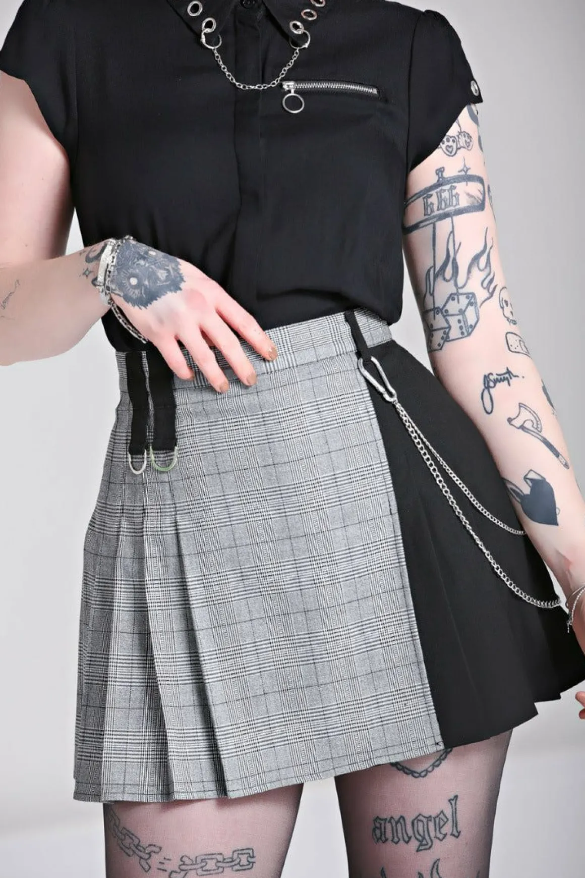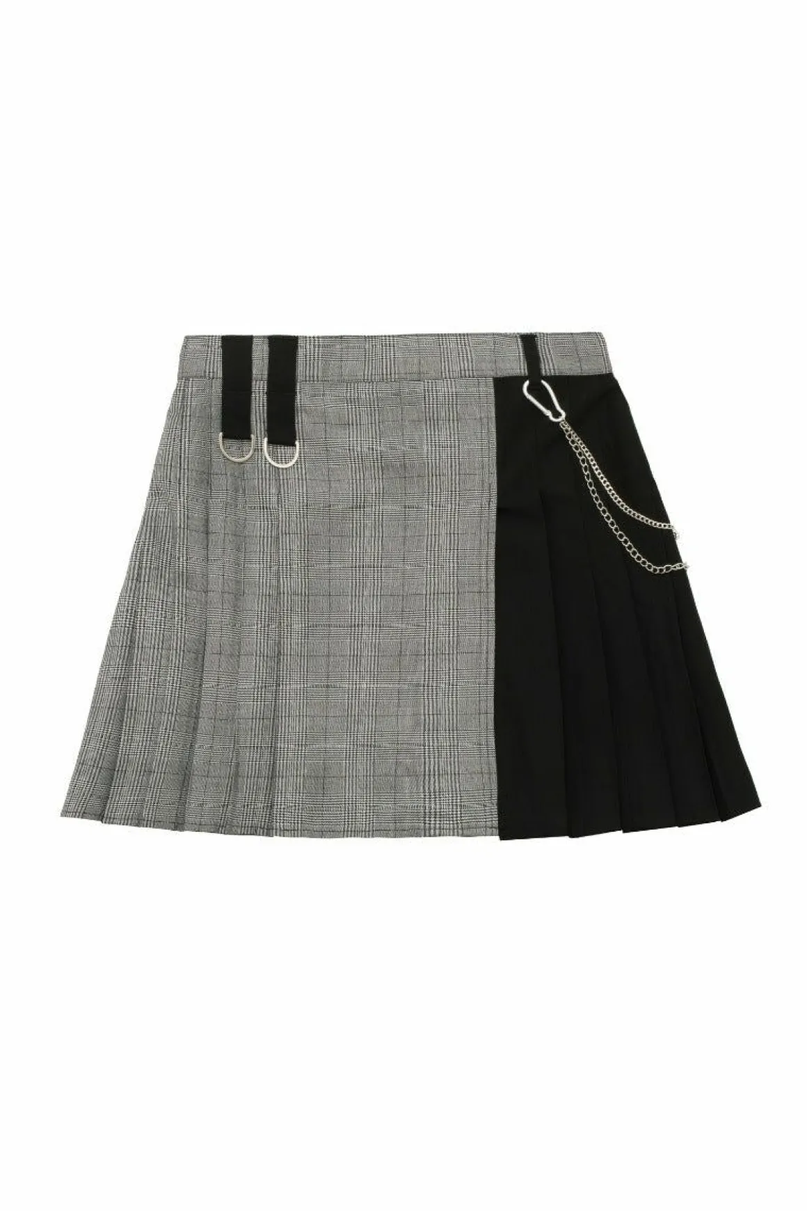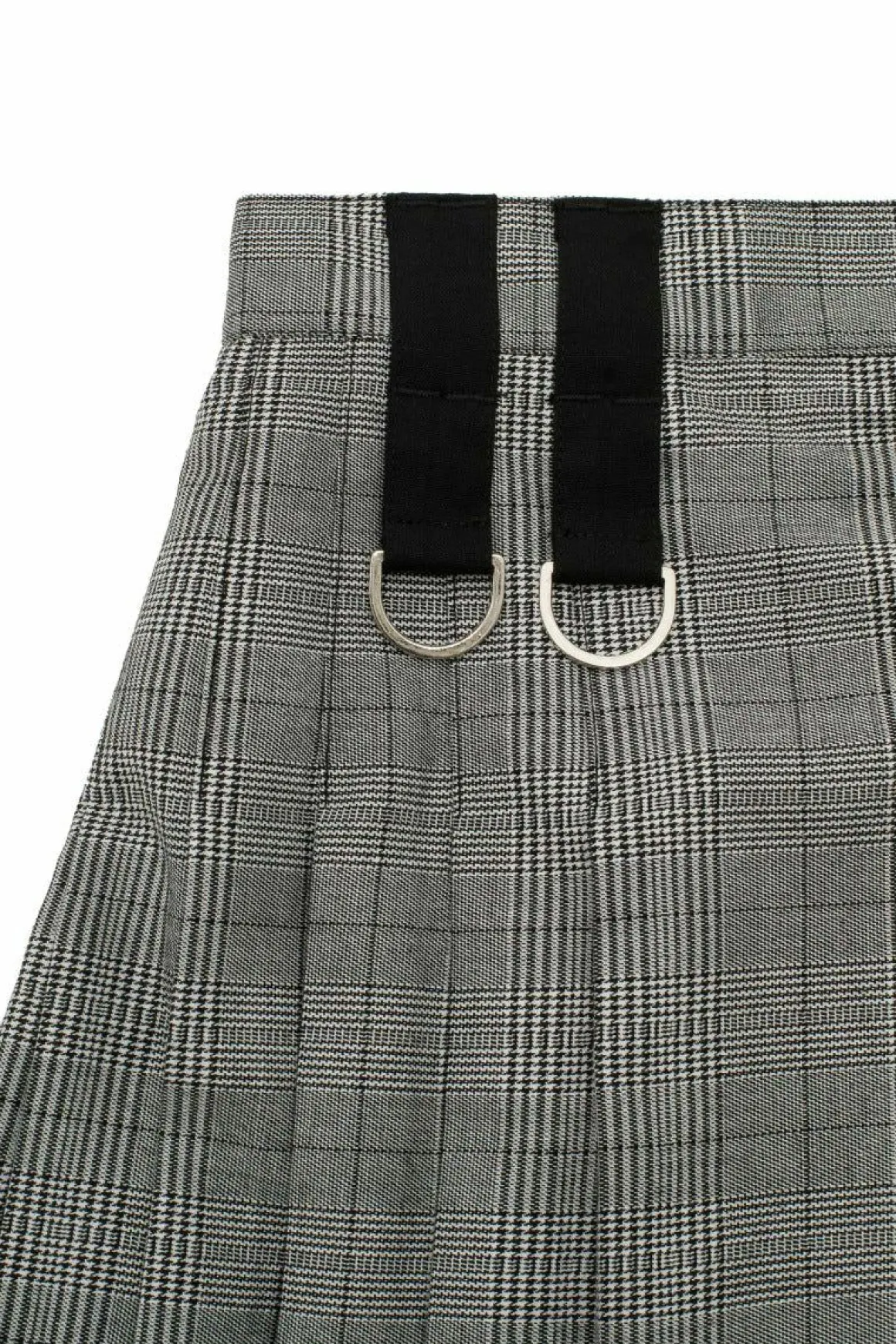 Grey Check & Black Mini SkirtBlack Plain Contrasting Fabric For Belt Loops With Large Silver D-RingsFlat Frnt Of Skirt W…
