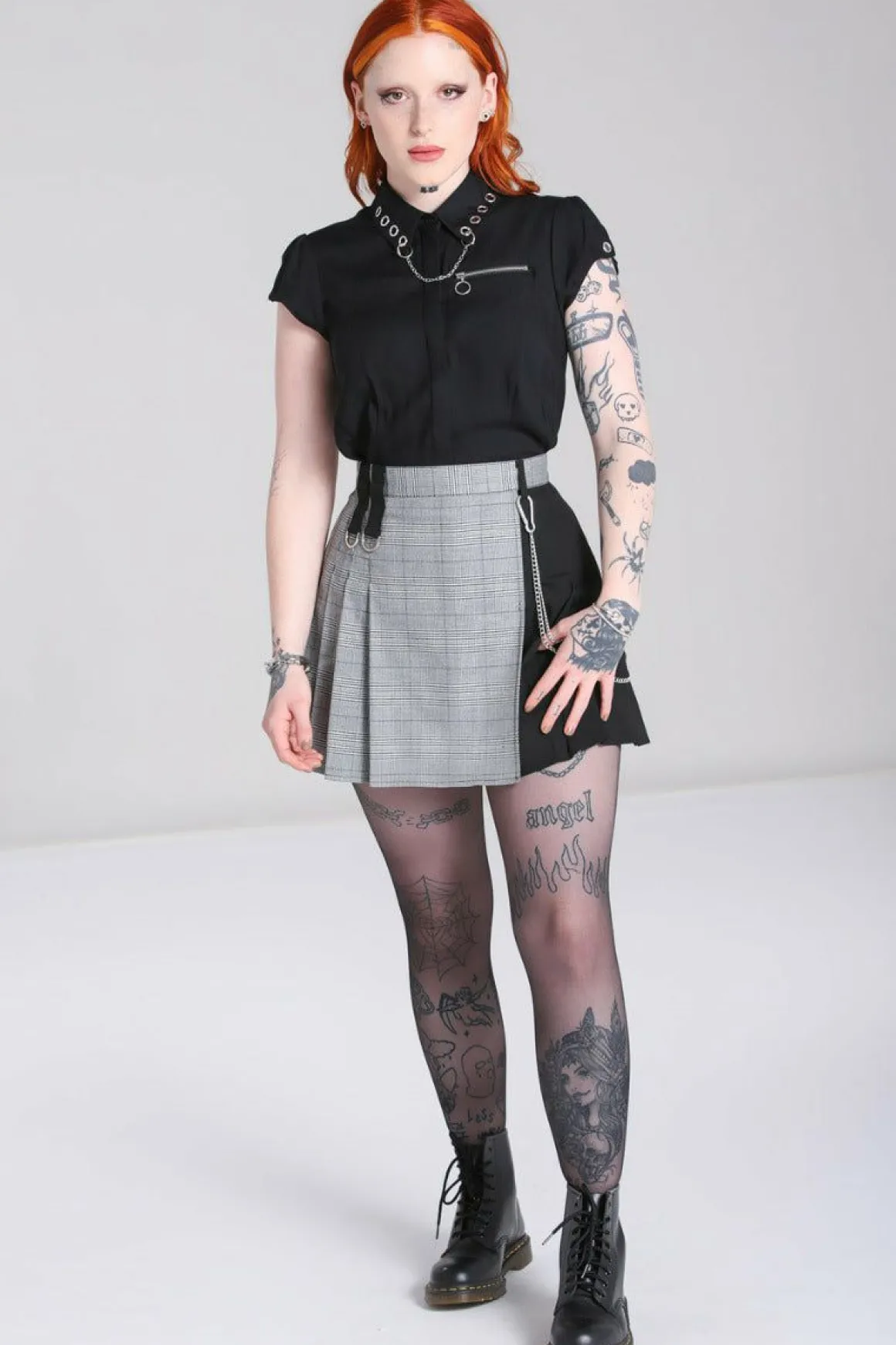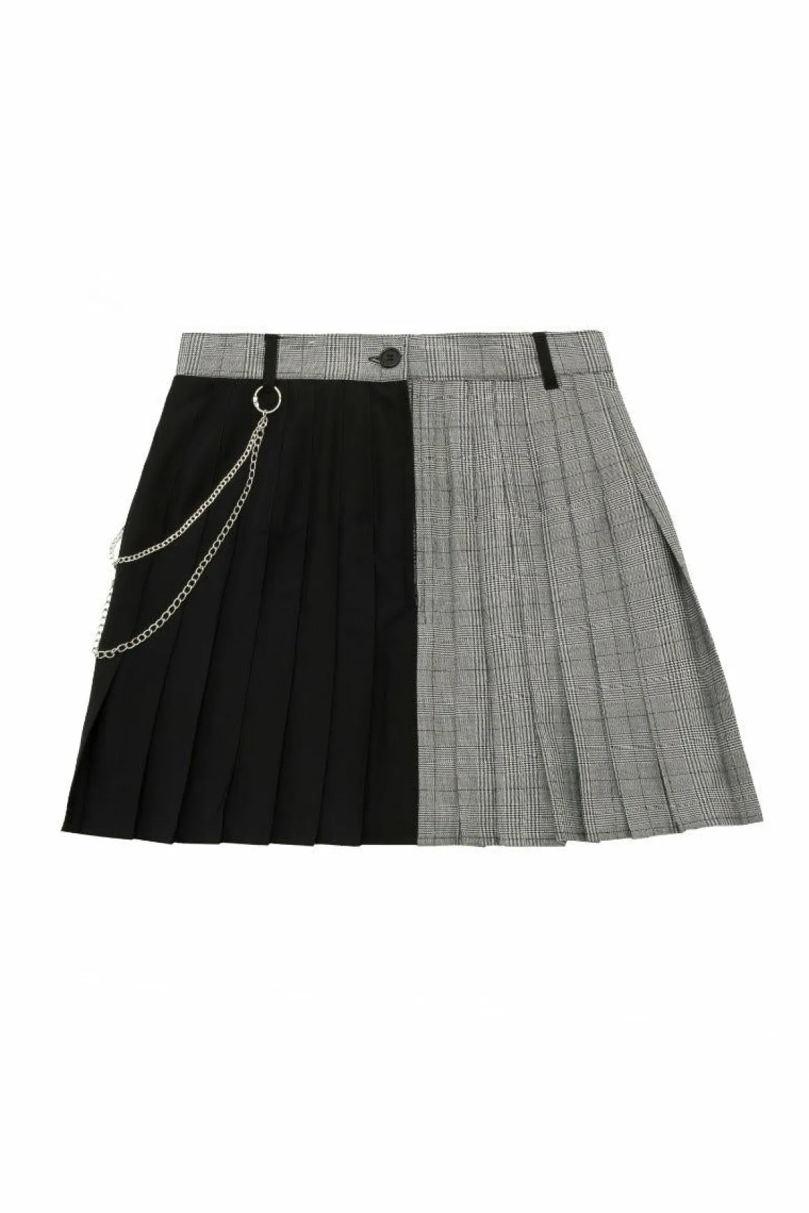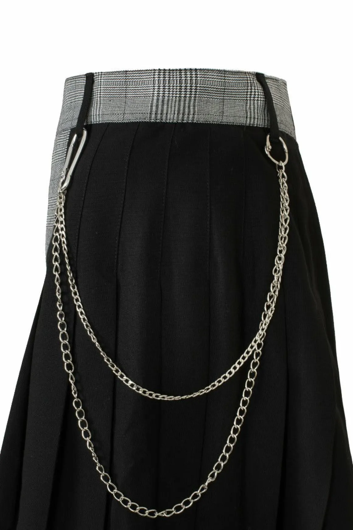 Grey Check & Black Mini SkirtBlack Plain Contrasting Fabric For Belt Loops With Large Silver D-RingsFlat Frnt Of Skirt W…