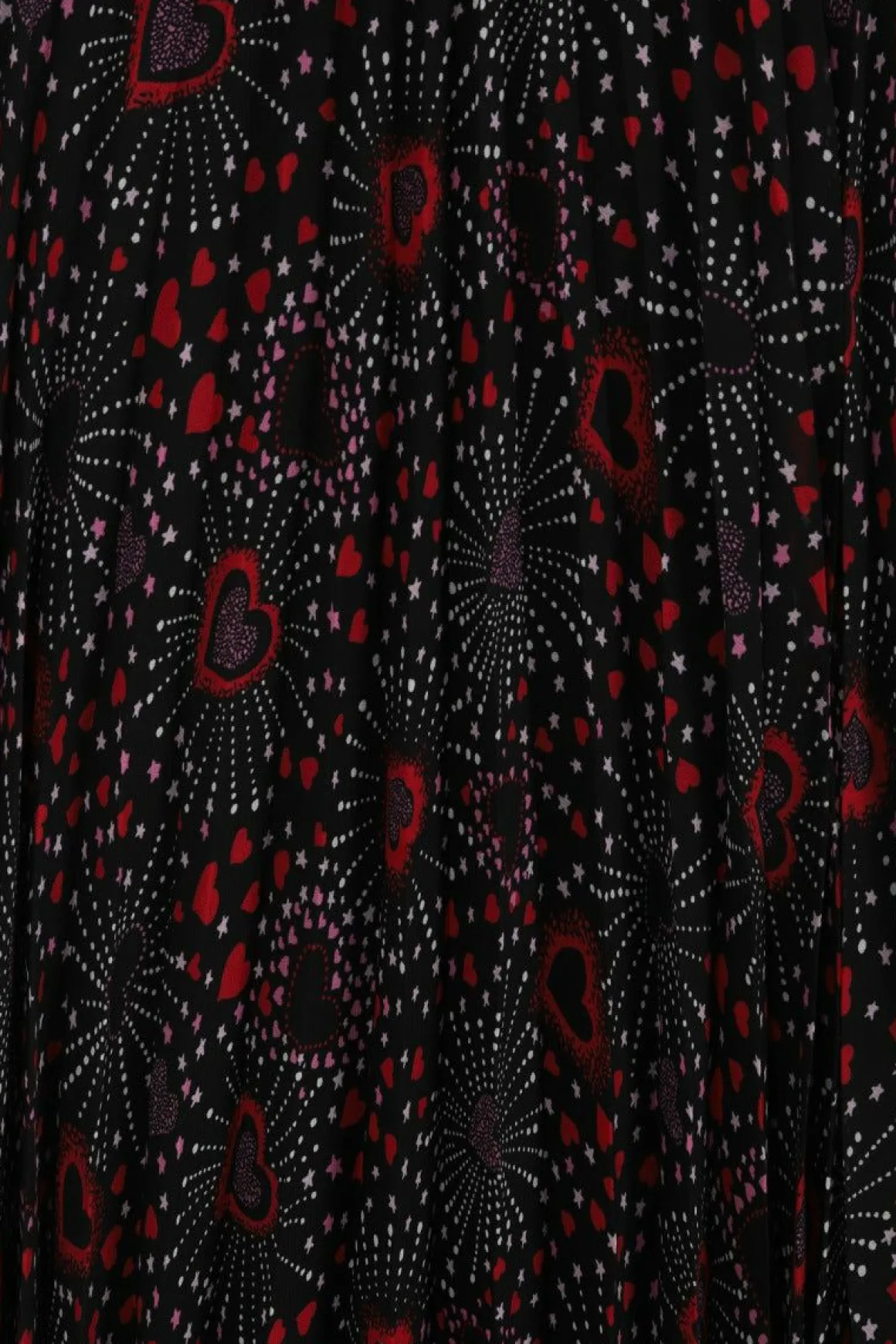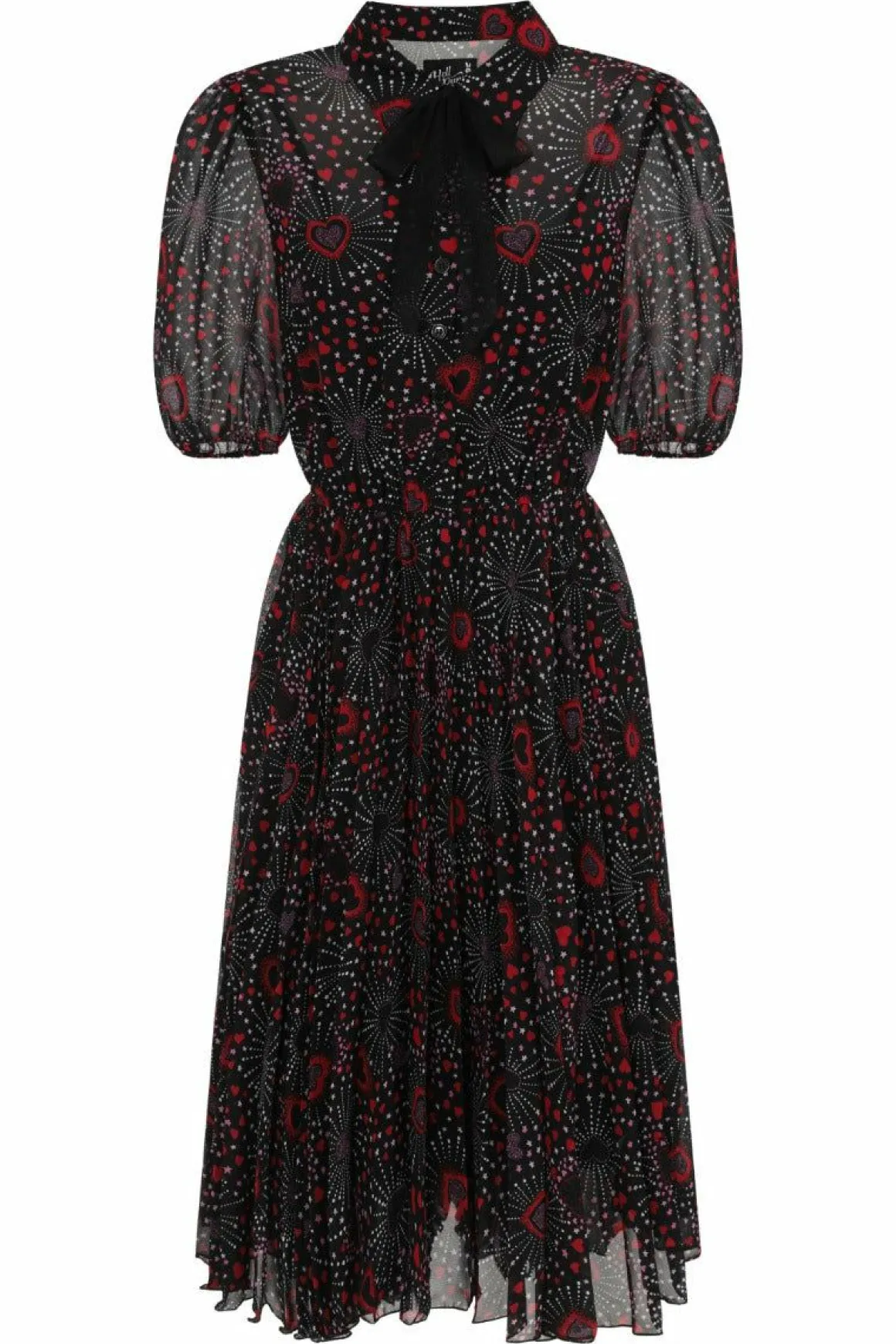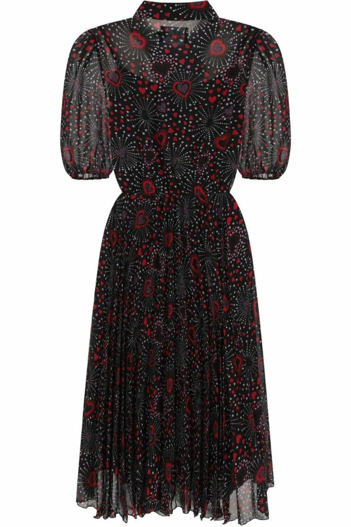 Chiffon Printed Mid DressBlack Base With Red & Pink Hearts In Firework PatternButton Up Bodice With CollarRemovable Polk…