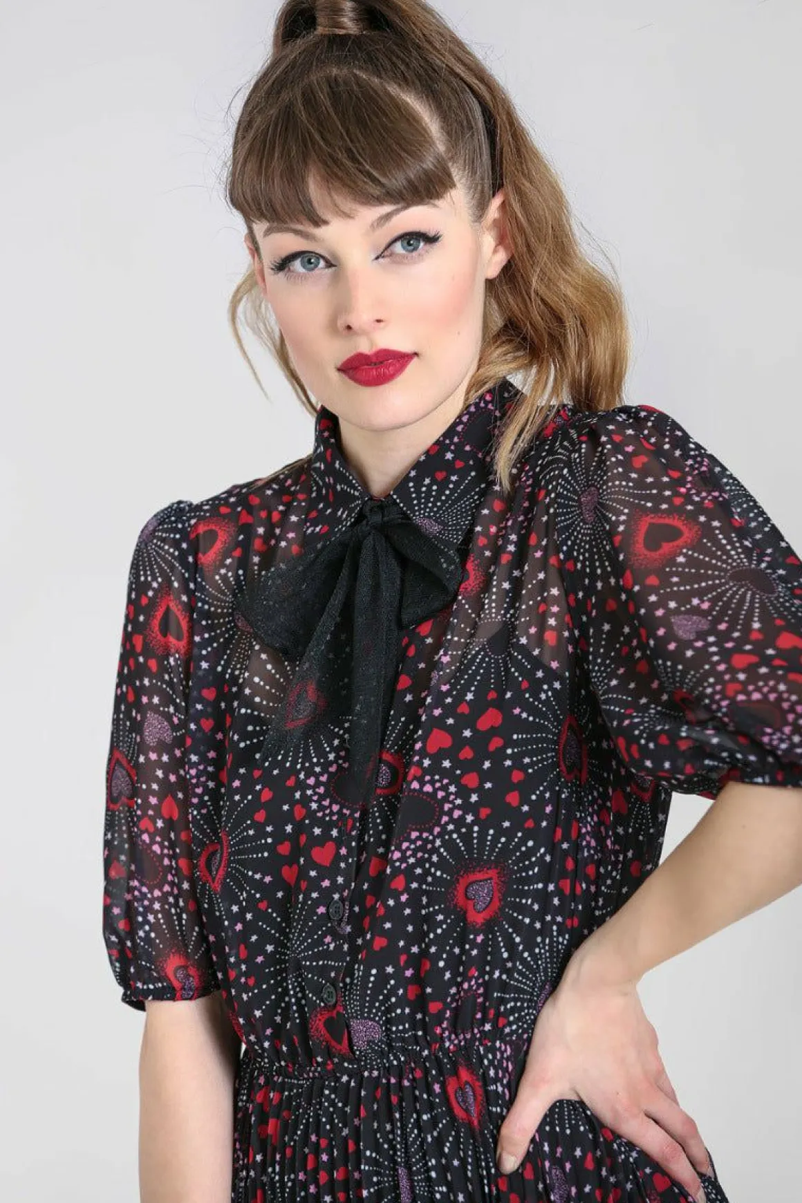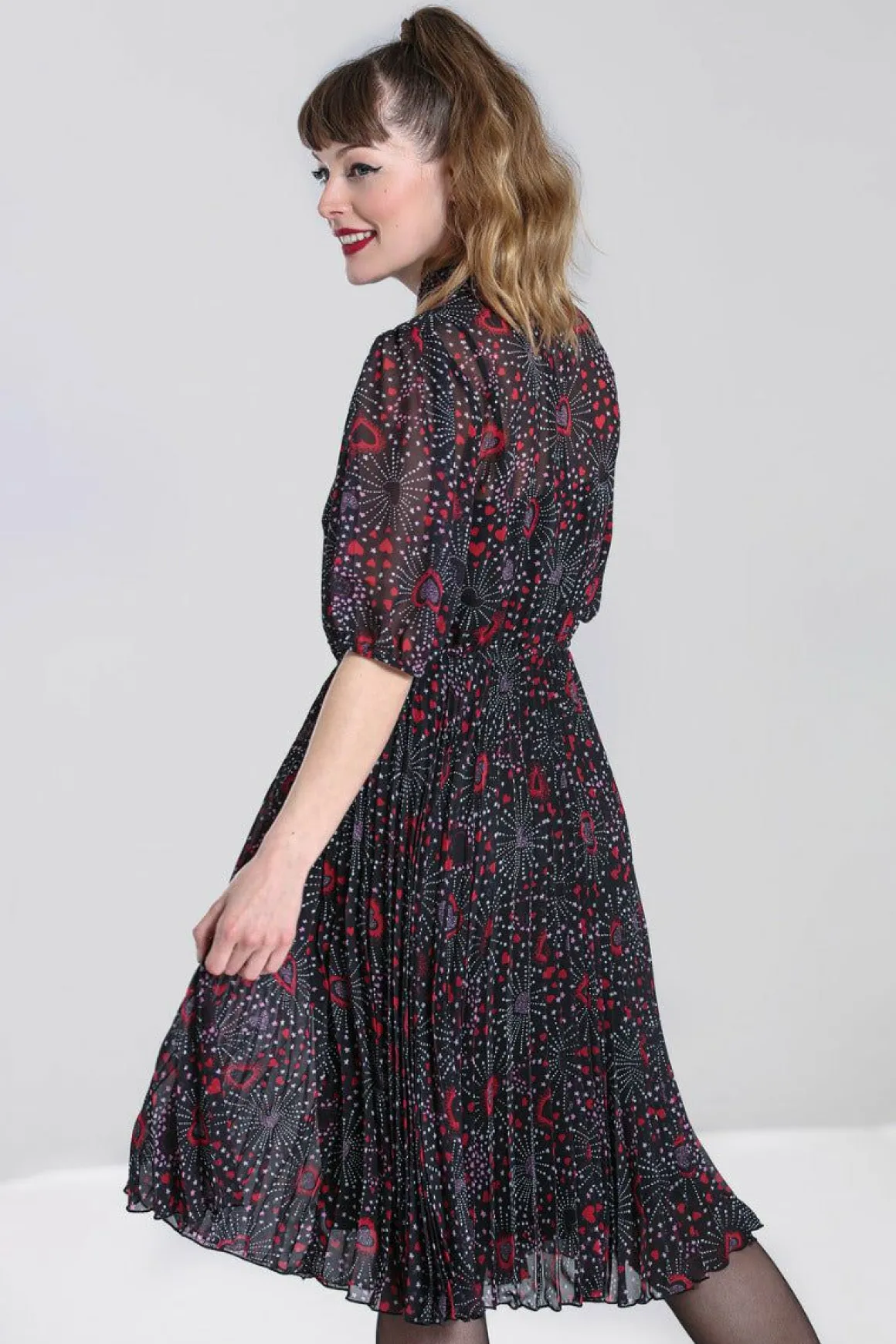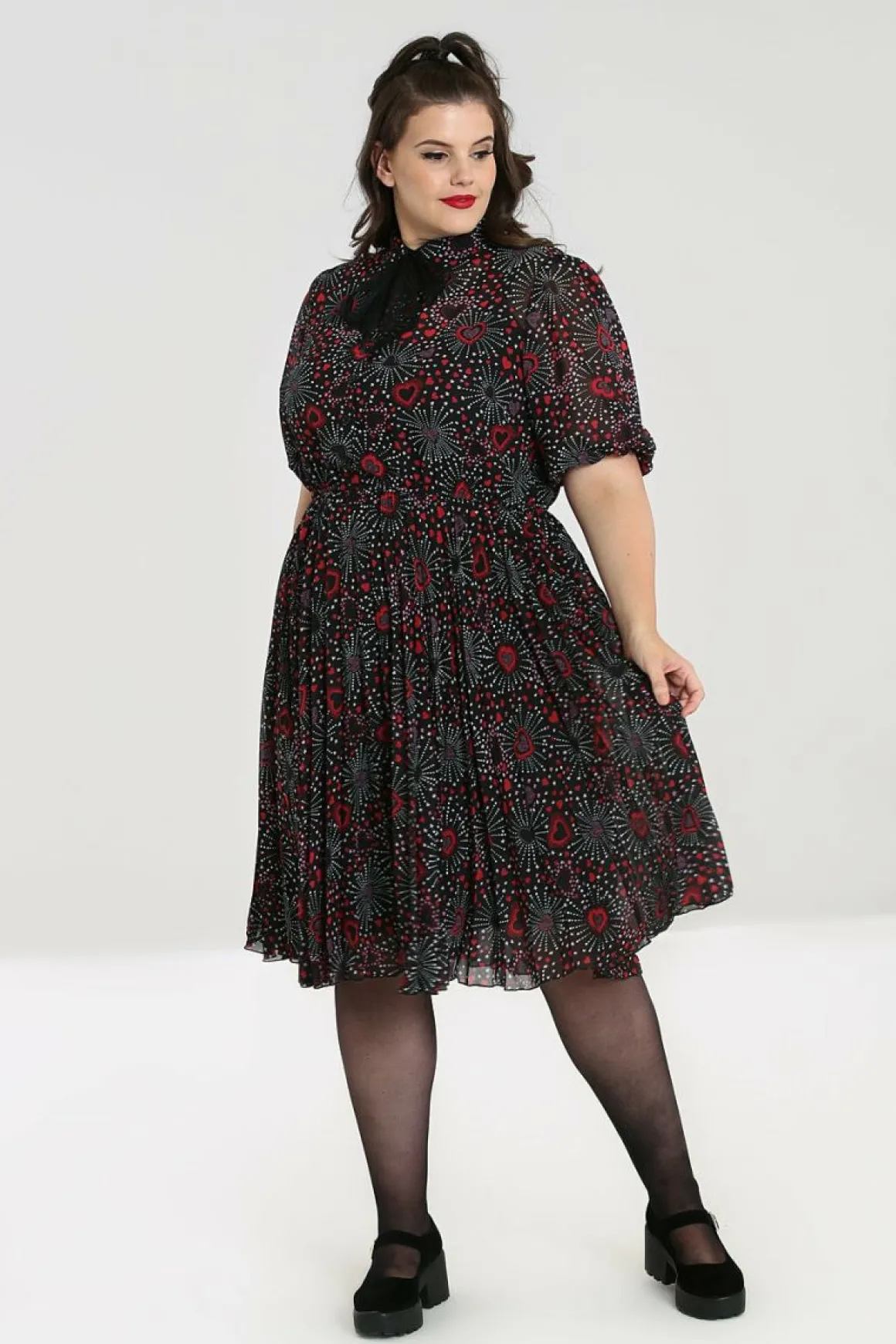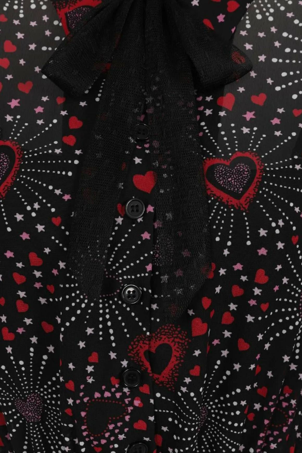 Chiffon Printed Mid DressBlack Base With Red & Pink Hearts In Firework PatternButton Up Bodice With CollarRemovable Polk…