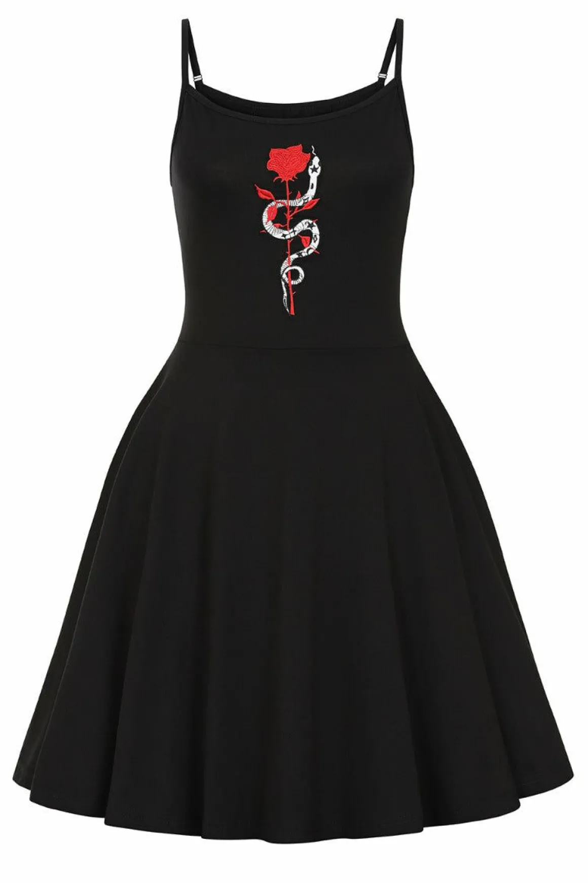 Black Mini Jersey DressPlain Dress With Large Snake & Rose Embroidery On Centre FrontHigh Neckline Adjustable Spaghetti …