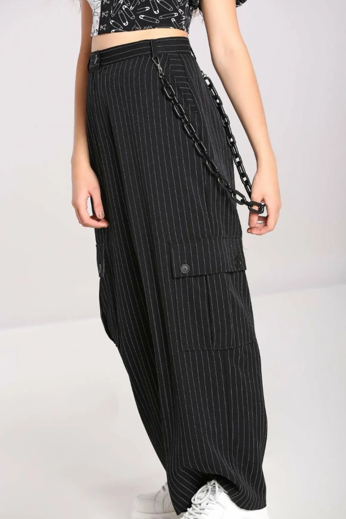 Black & White Pinstriped Full Length TrousersHorizontal Striped Waistband With Belt LoopsWide Leg Style Large Pockets On…