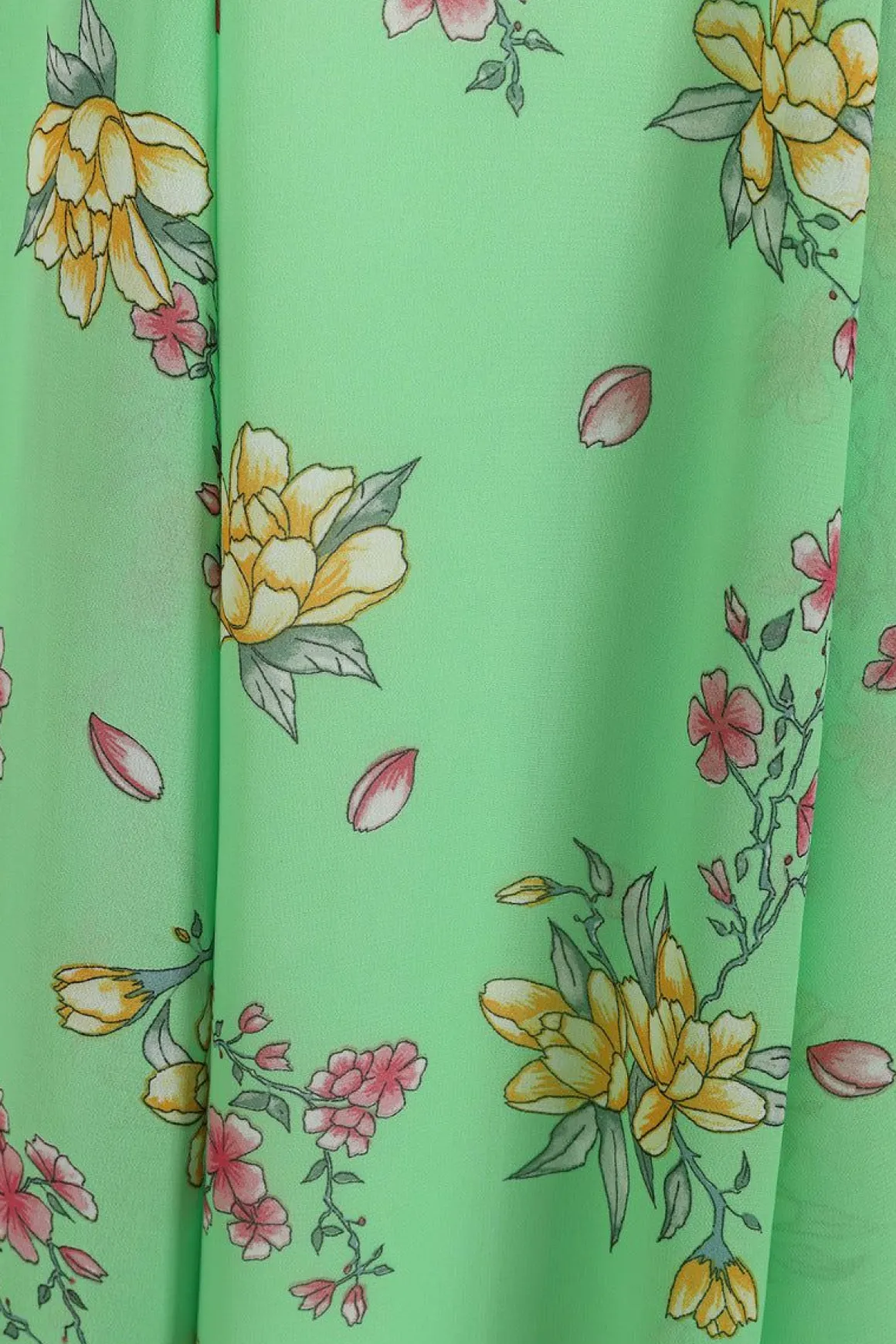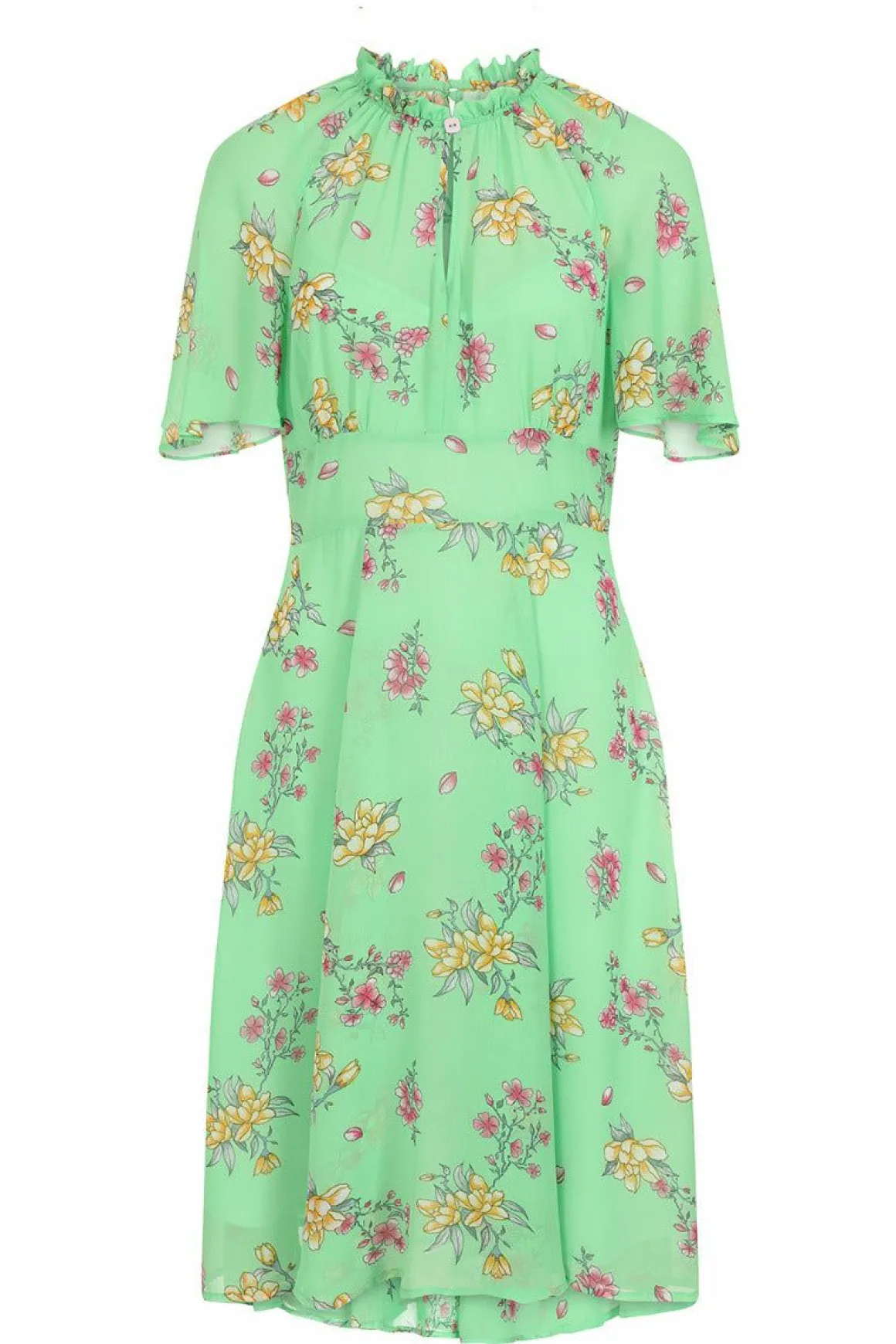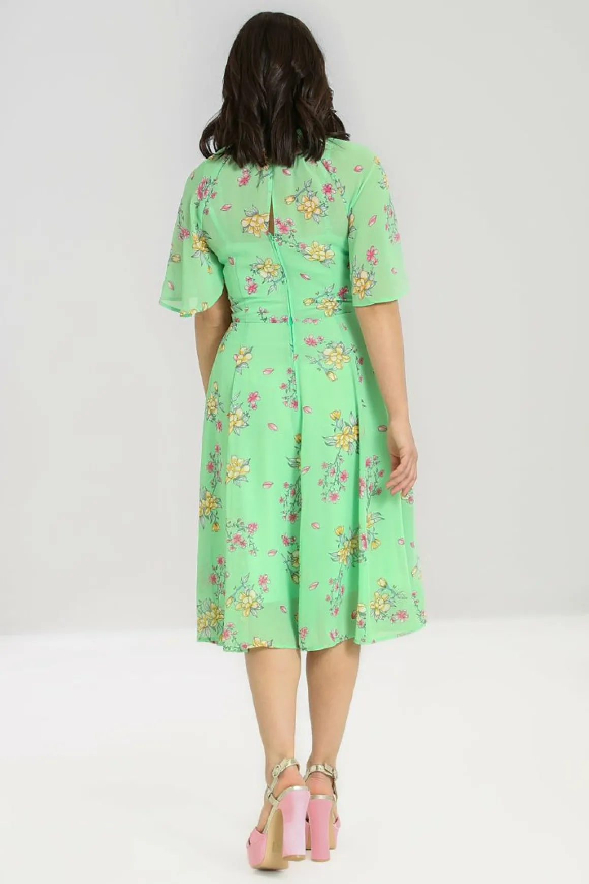 - Mint Green 70’S Style Chiffon Dress Decorated With Delicate Pink & Yellow Flowers