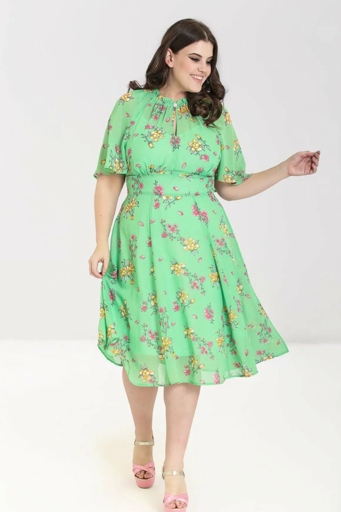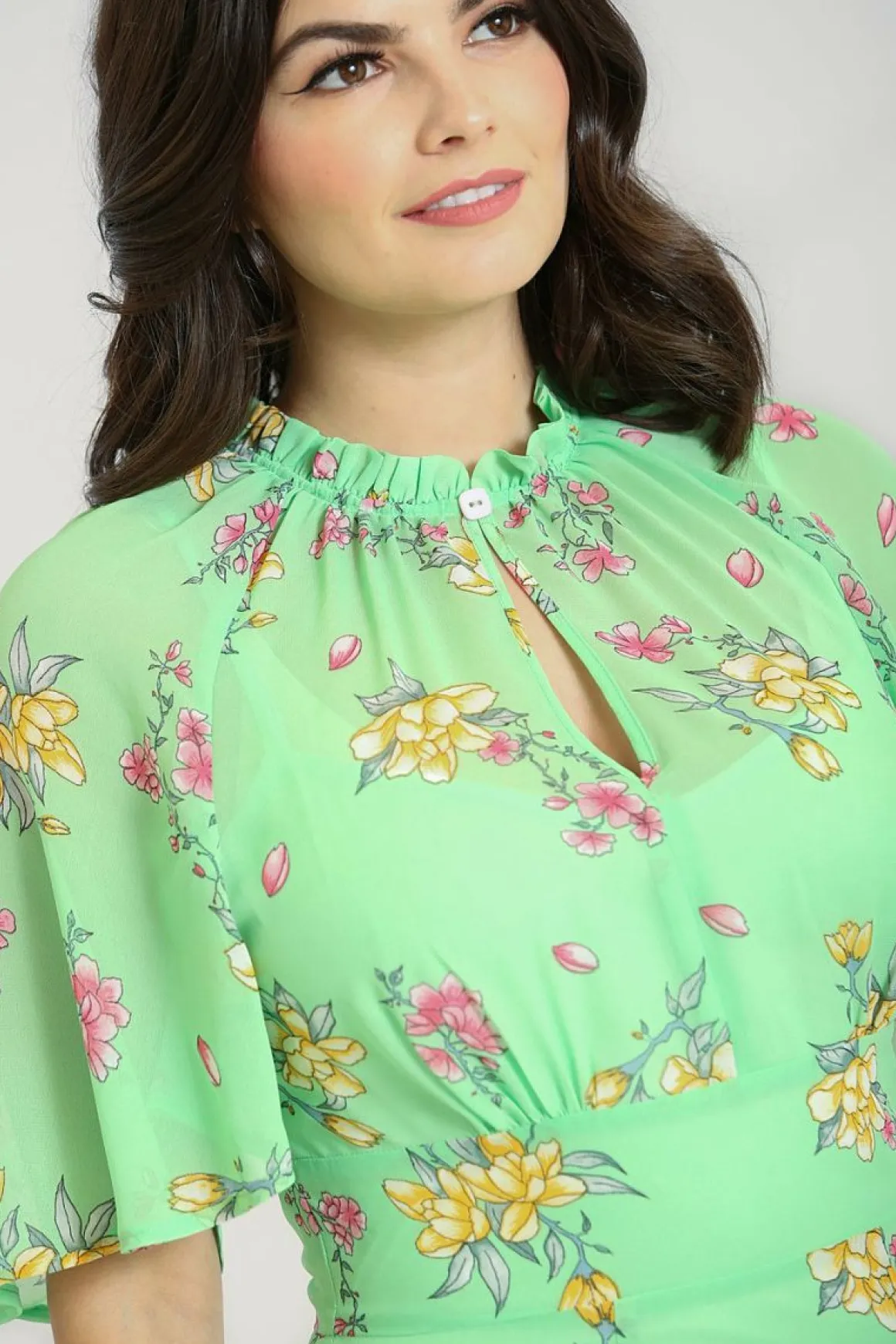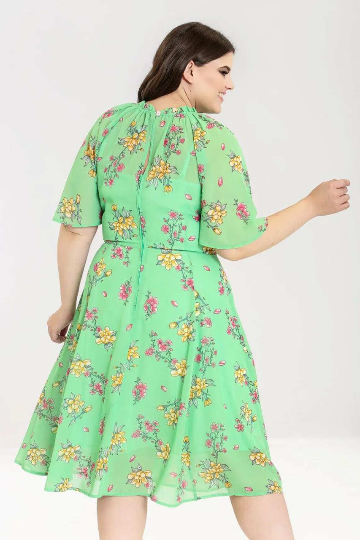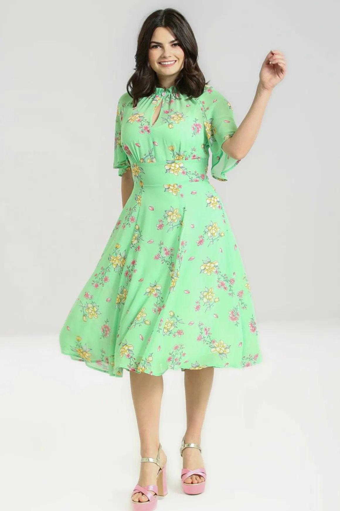 - Mint Green 70’S Style Chiffon Dress Decorated With Delicate Pink & Yellow Flowers