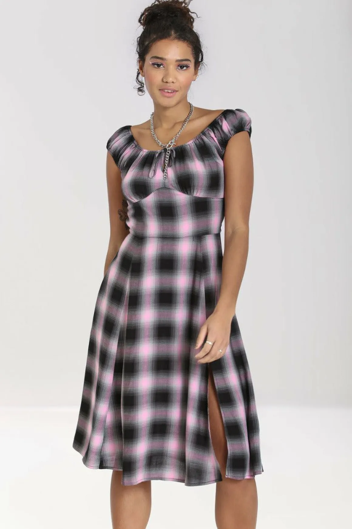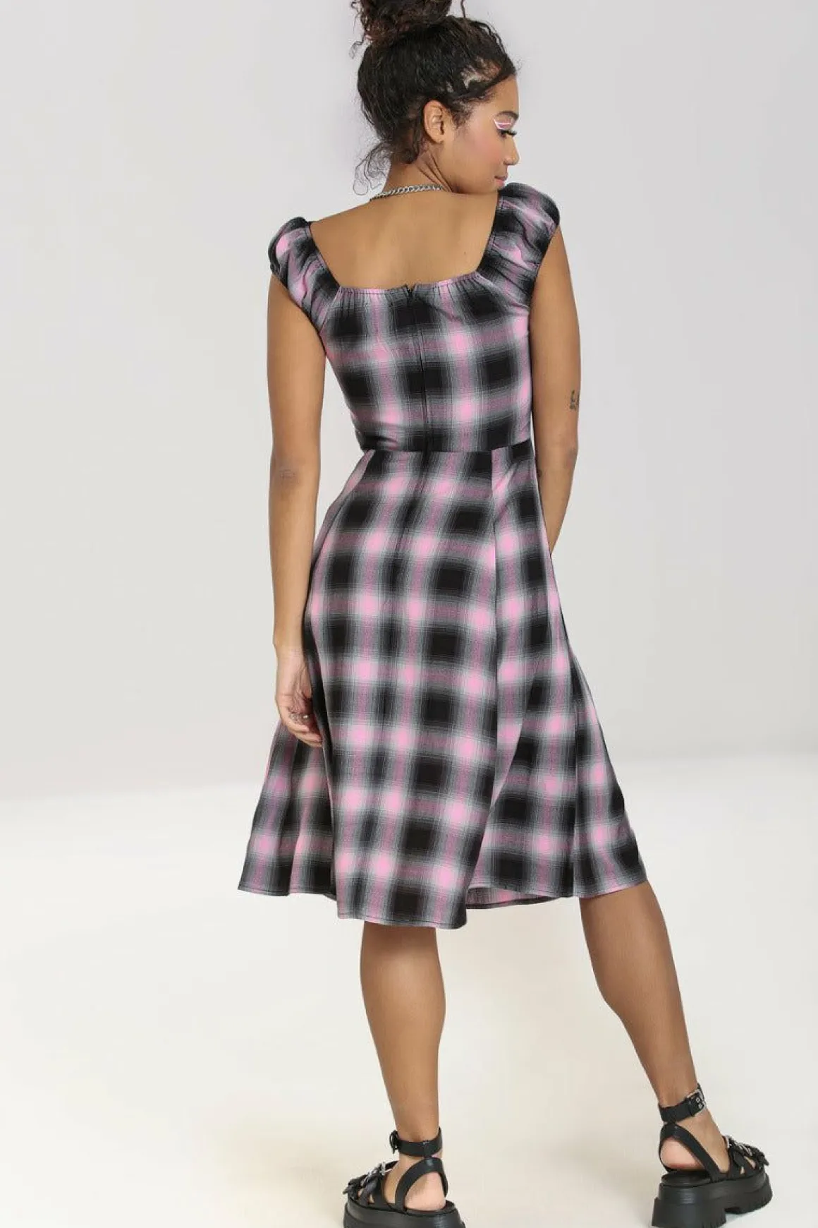 - Black, Grey & Baby Pink Tartan Fit-And-Flare Dress