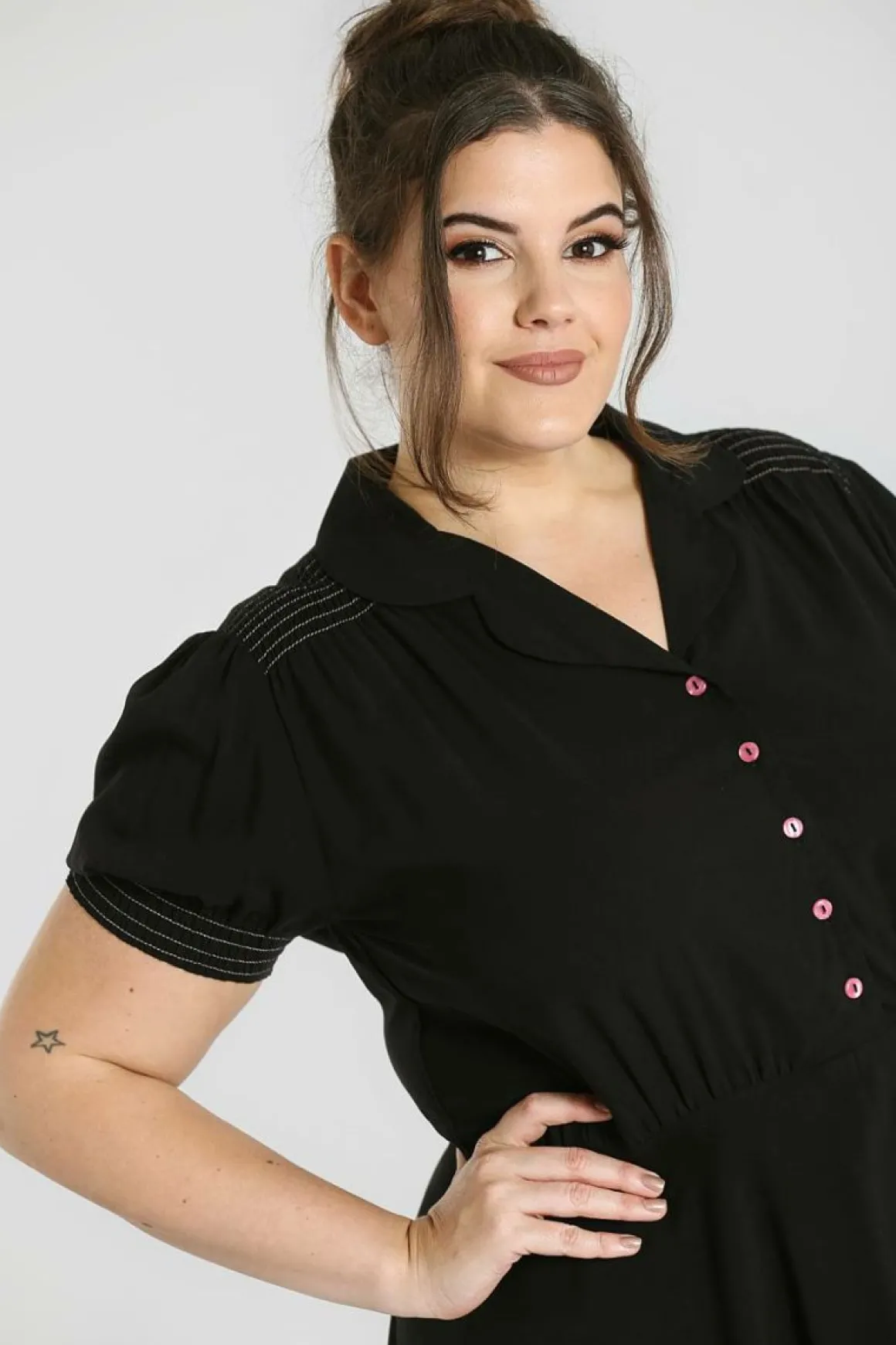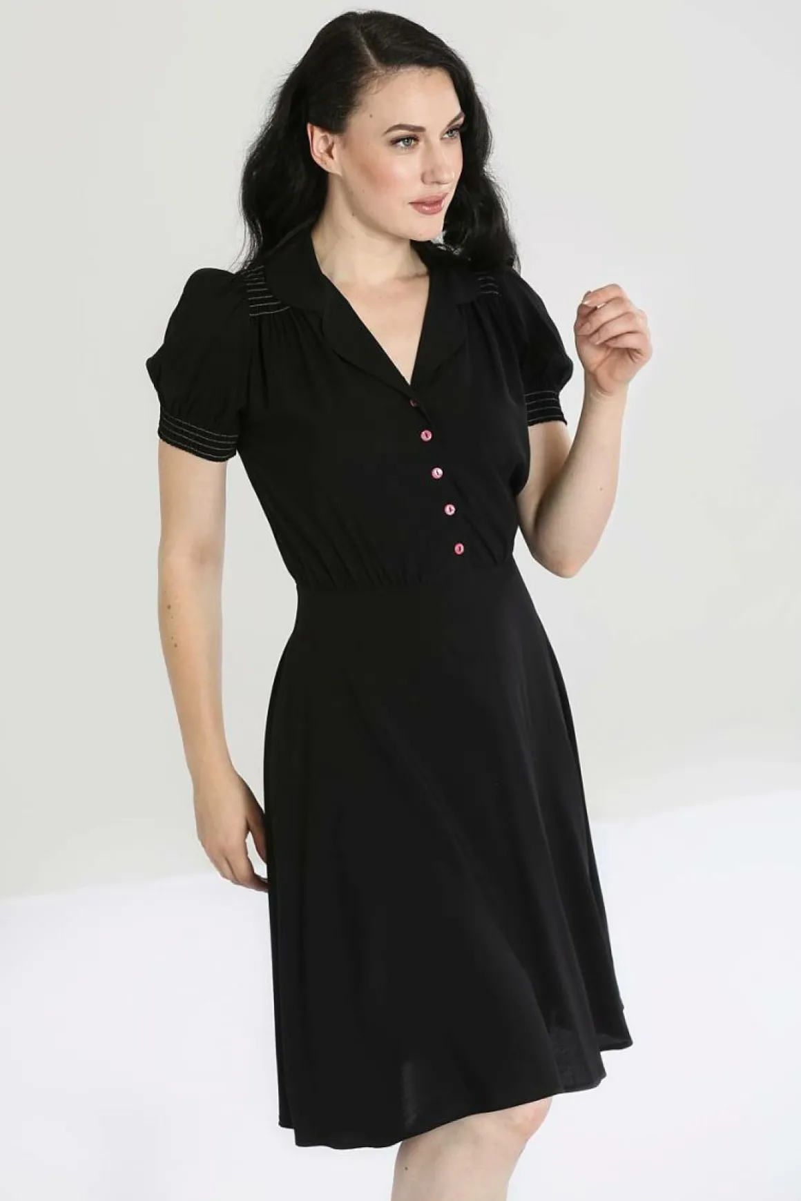 Black Dress With Short SleevesPink Buttons Down The Centre FrontGathers At ShoulderBodice Is Gathered At WaistZip In The…