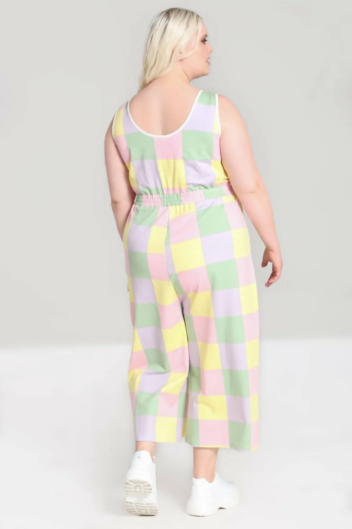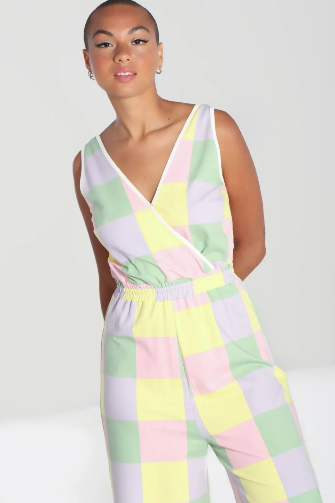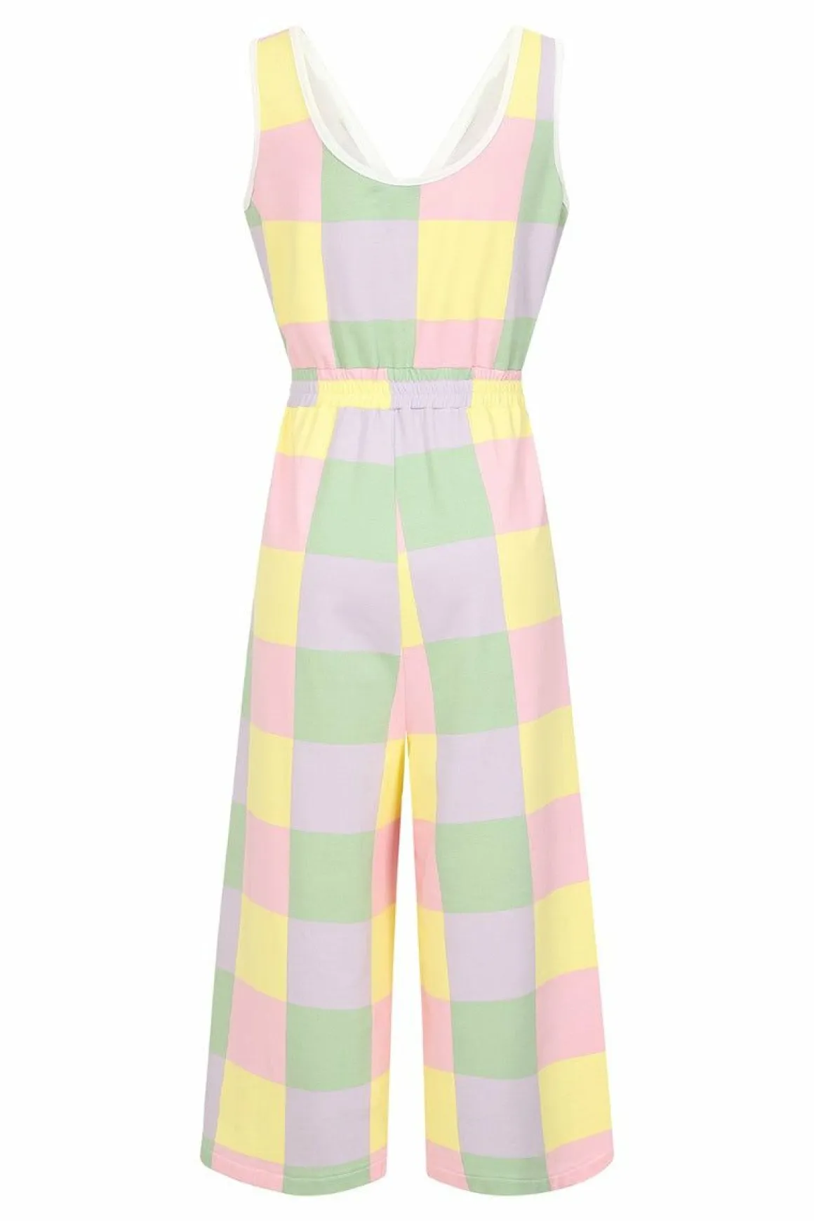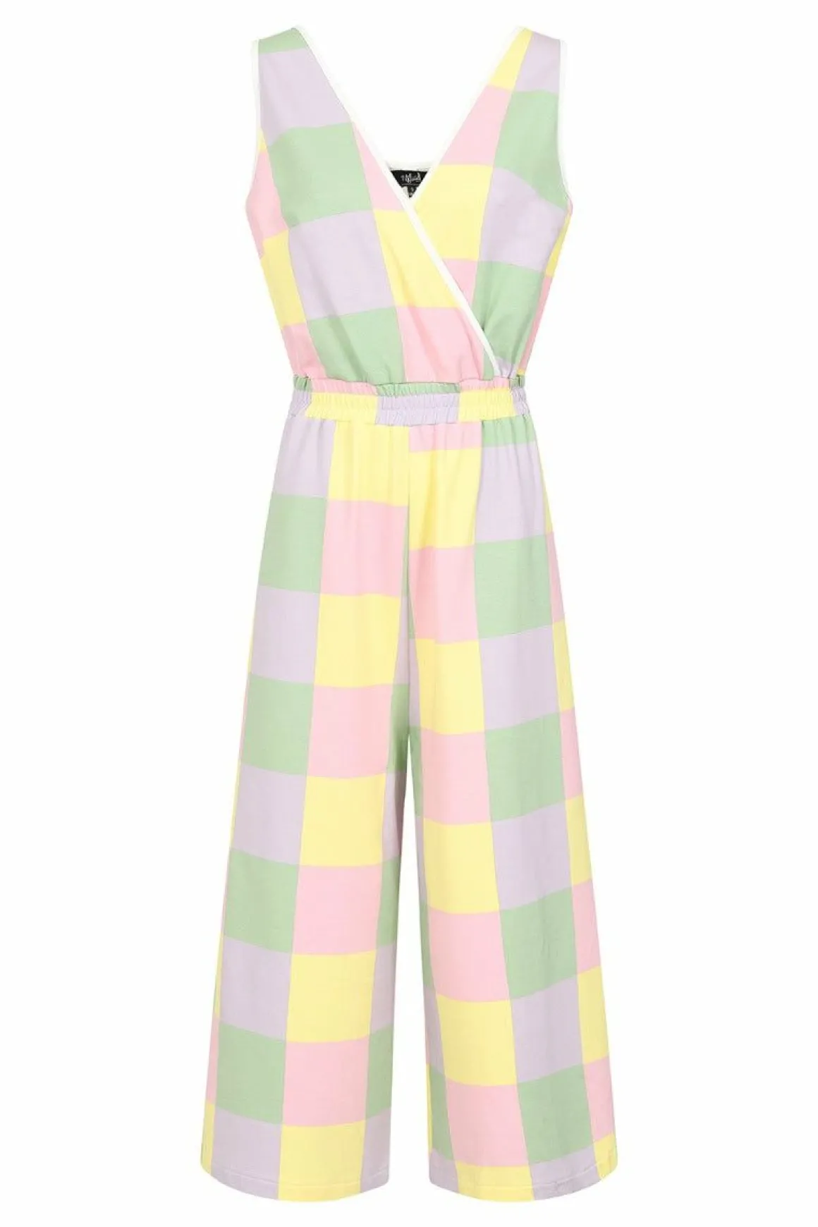 Pastel Patchwork Printed JumpsuitSleeveless Wrap Top With Gathers On Front YokeElasticated Shirring At WaistScoop BackFl…