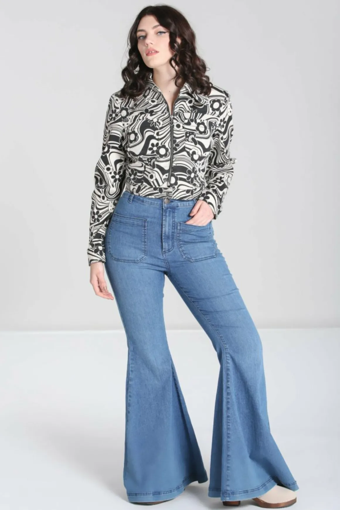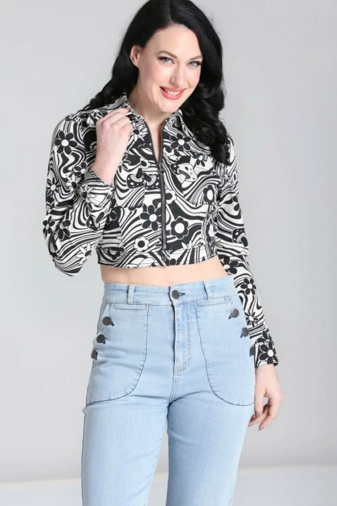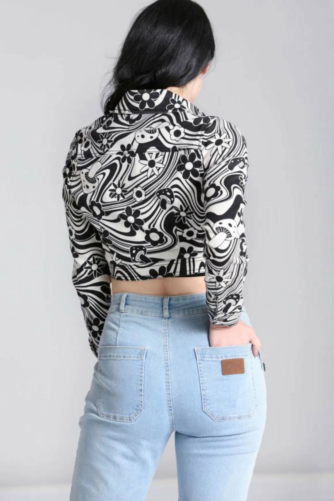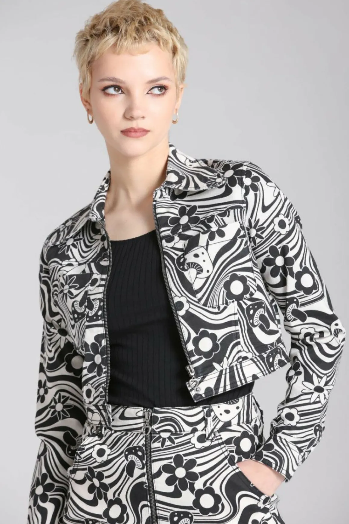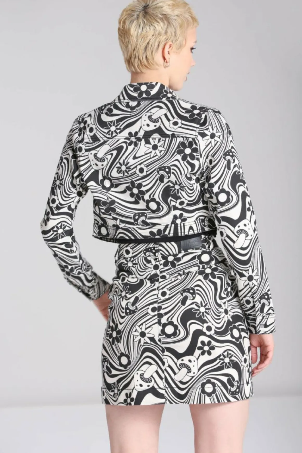 Printed Stretch JacketIvory Base With Black 70S Style Artwork Of Flowers And Mushrooms Cropped Jacket To WaistlinePointe…