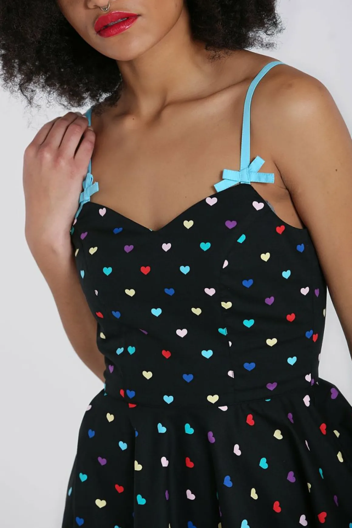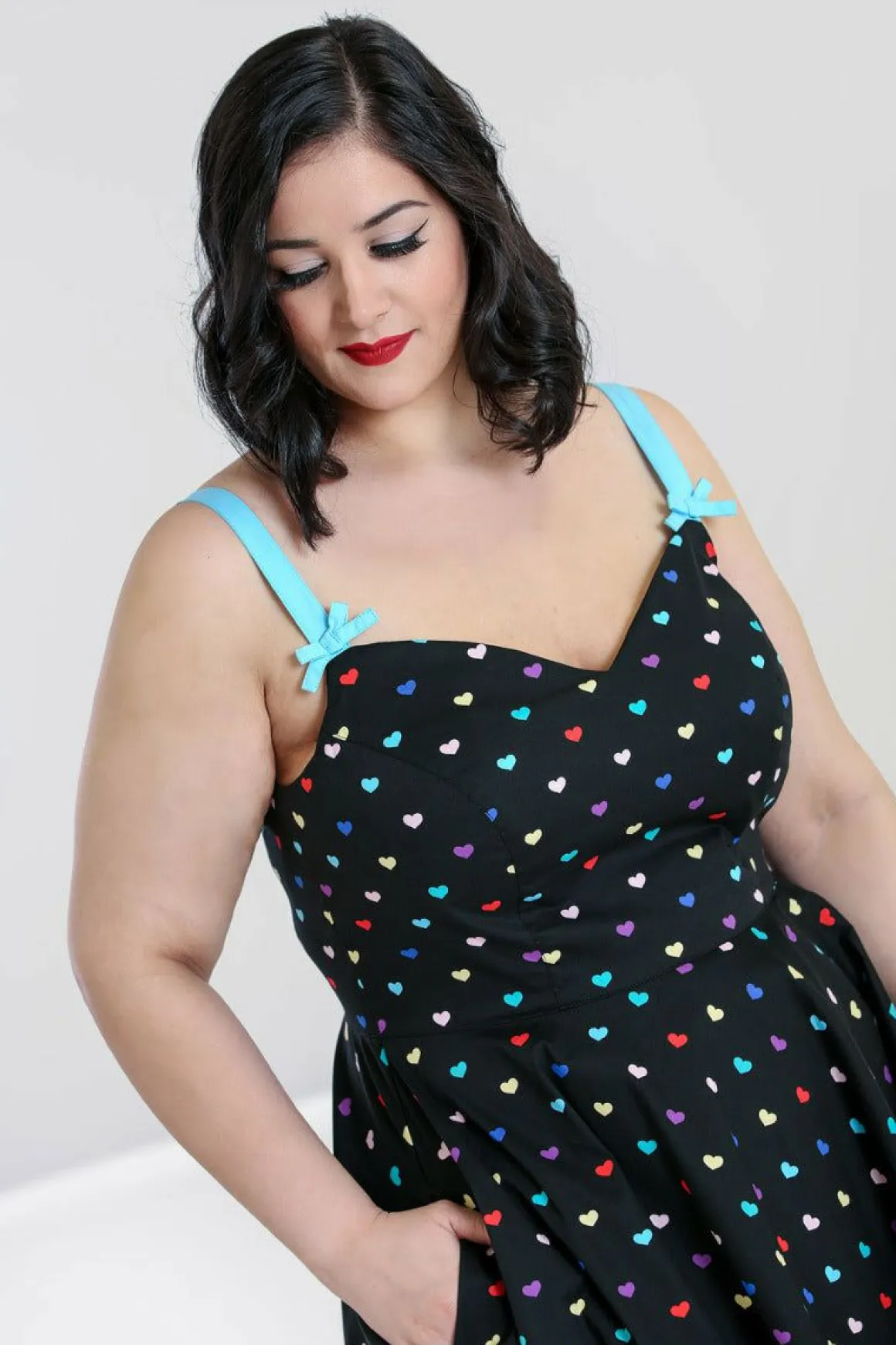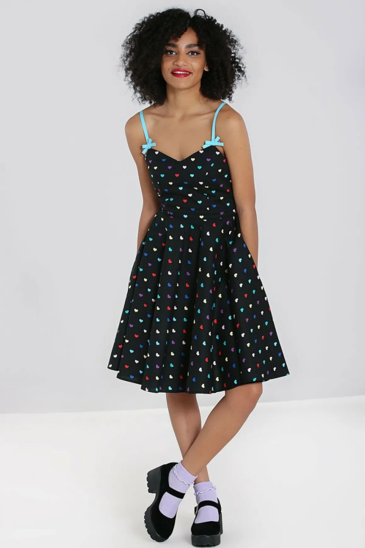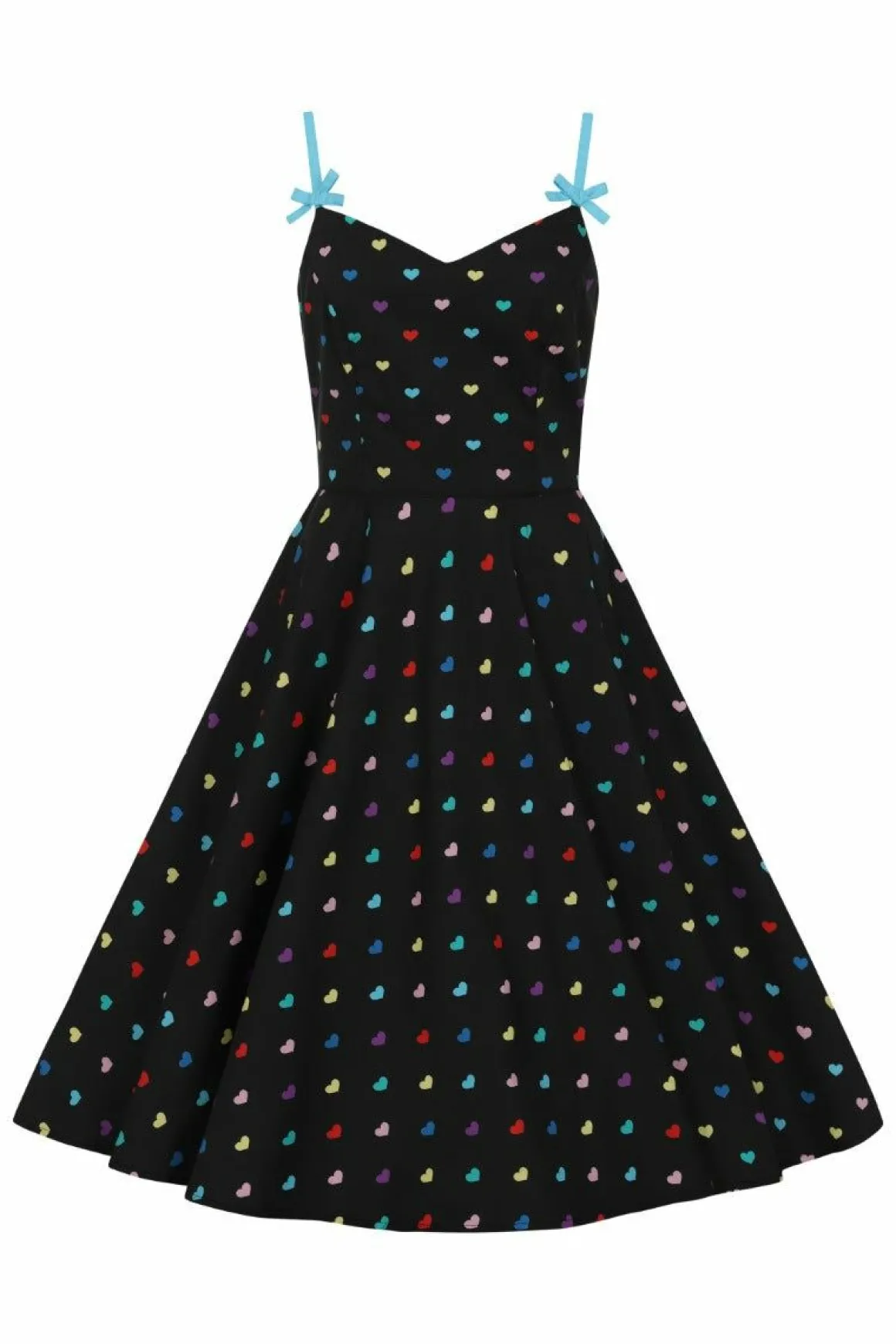 - Black, 50’S Style Dress Decorated With Rainbow Coloured Polka Hearts