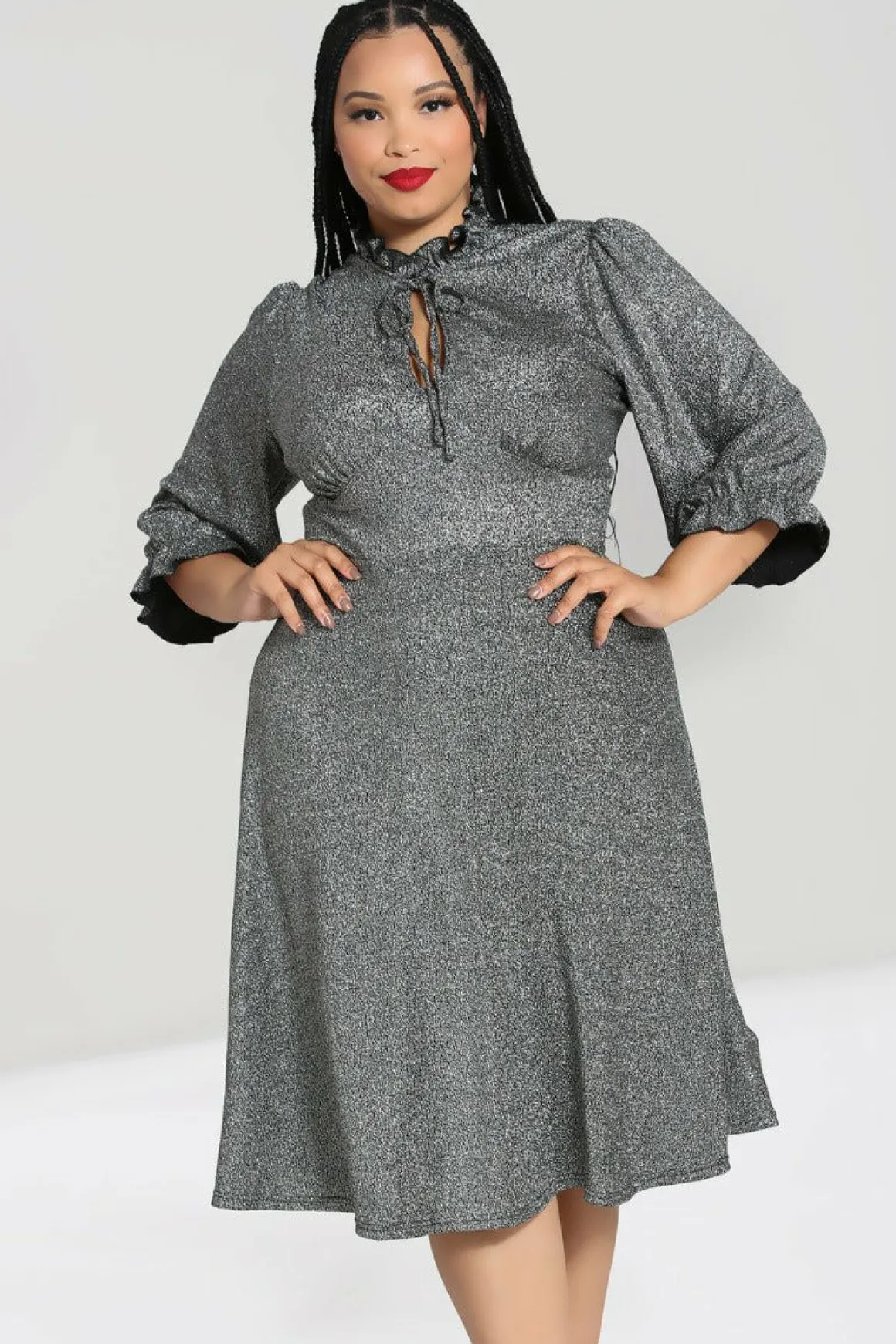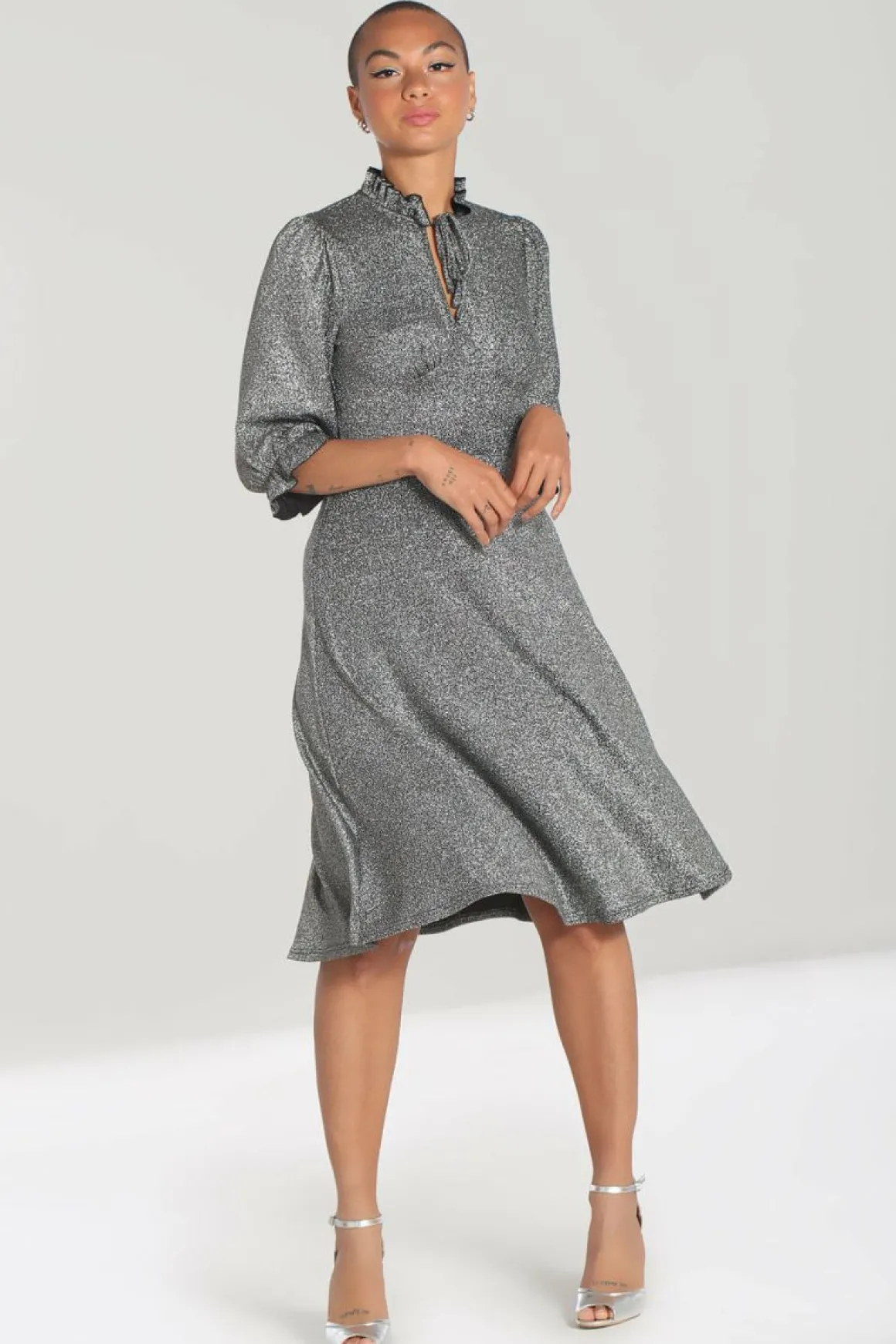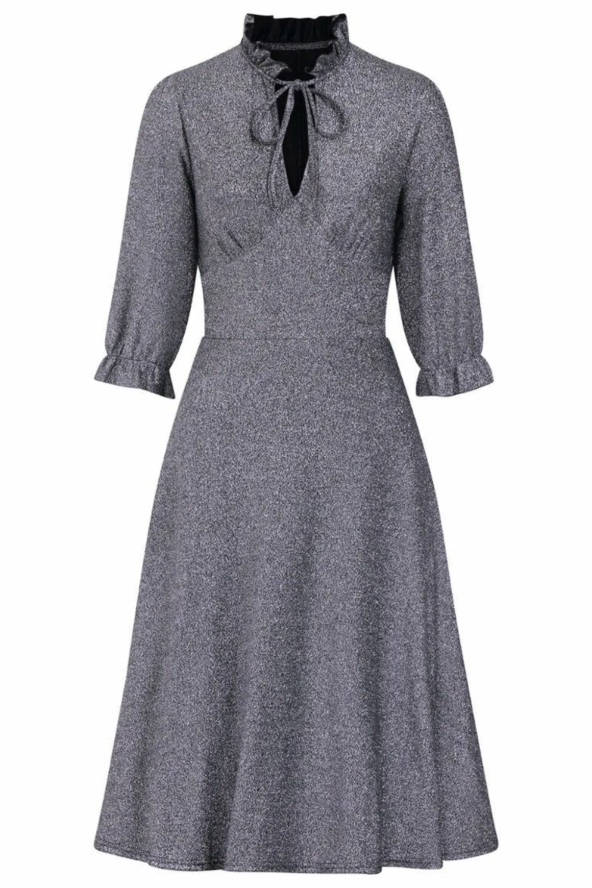 - Silver Lurex Fit-And-Flare Mid Dress With Large Chest Keyhole And Pretty Tie Detailing At The Neck