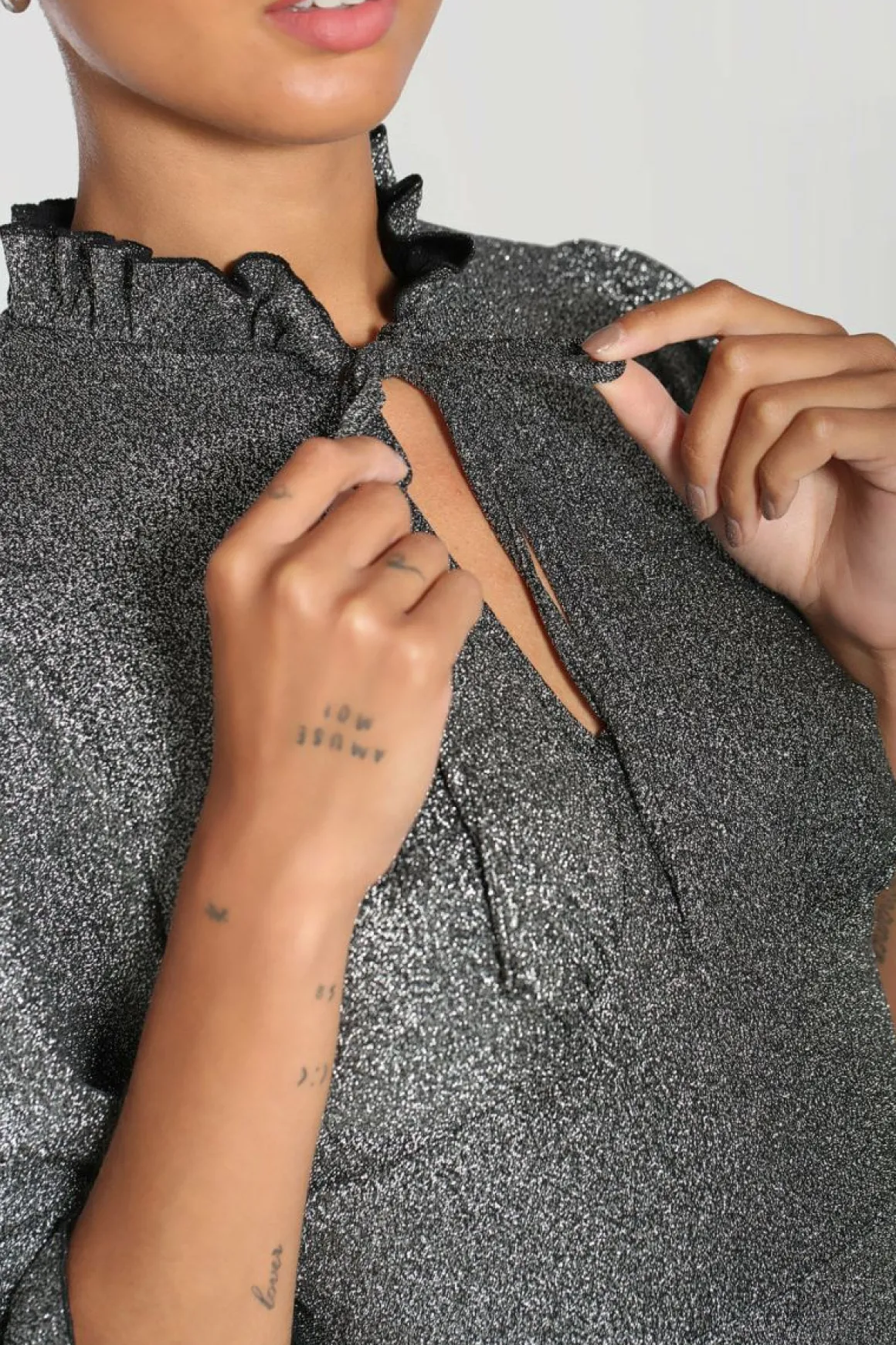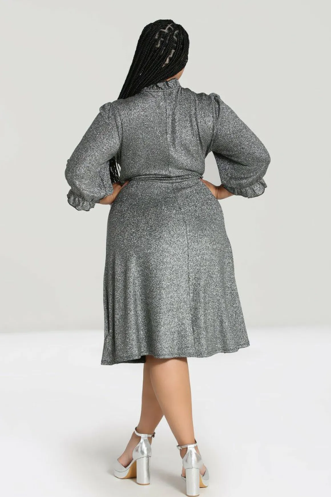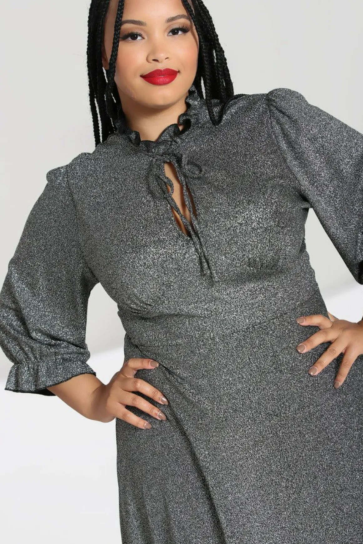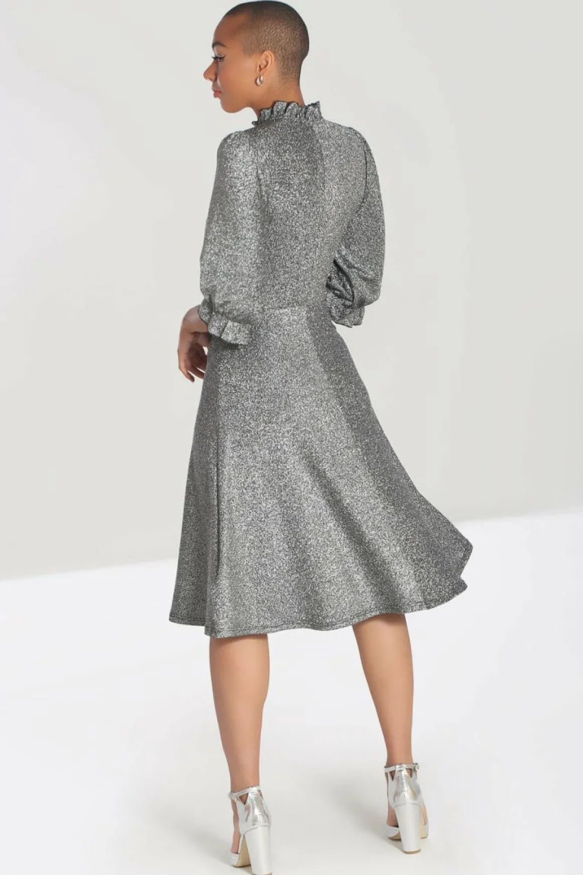 - Silver Lurex Fit-And-Flare Mid Dress With Large Chest Keyhole And Pretty Tie Detailing At The Neck