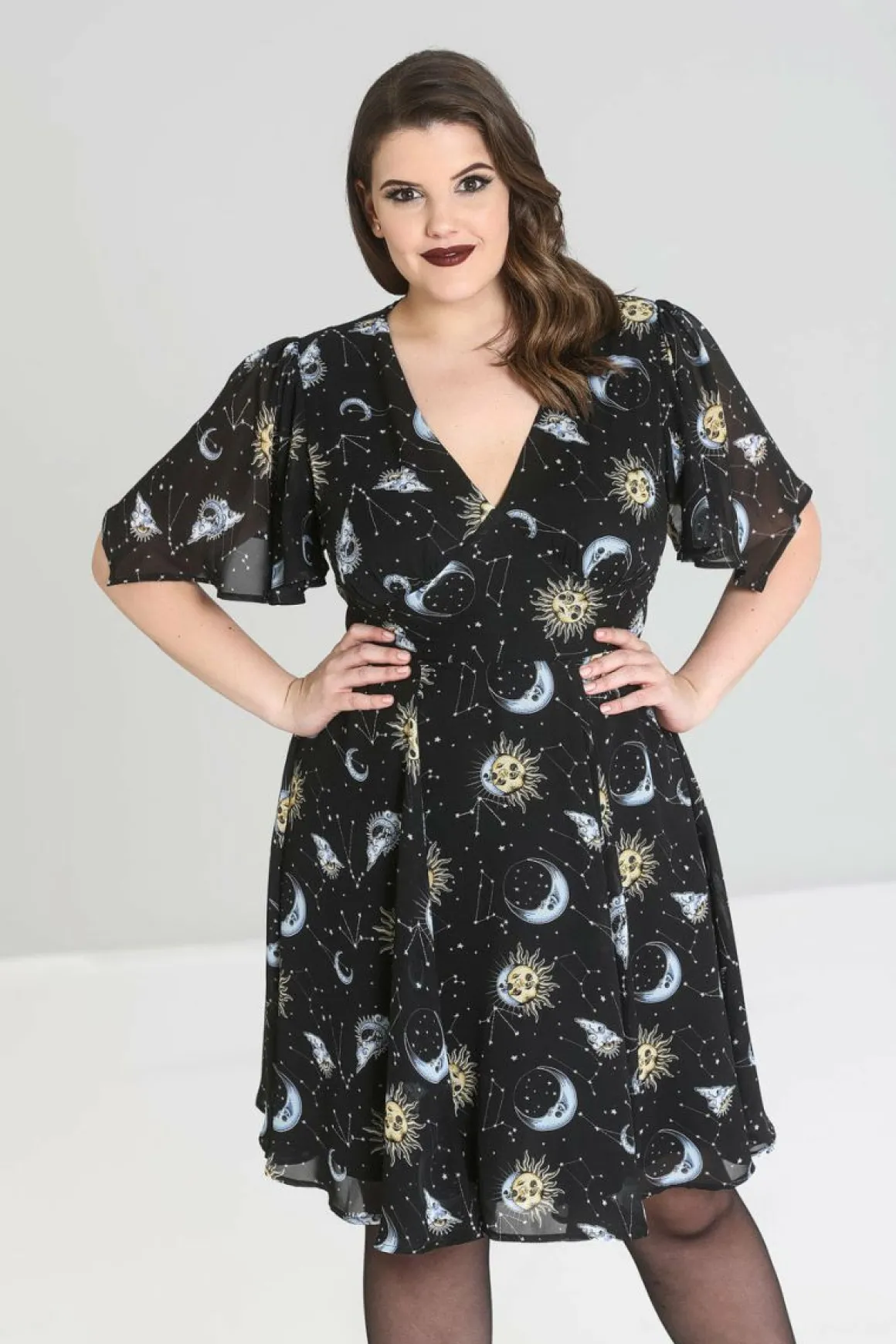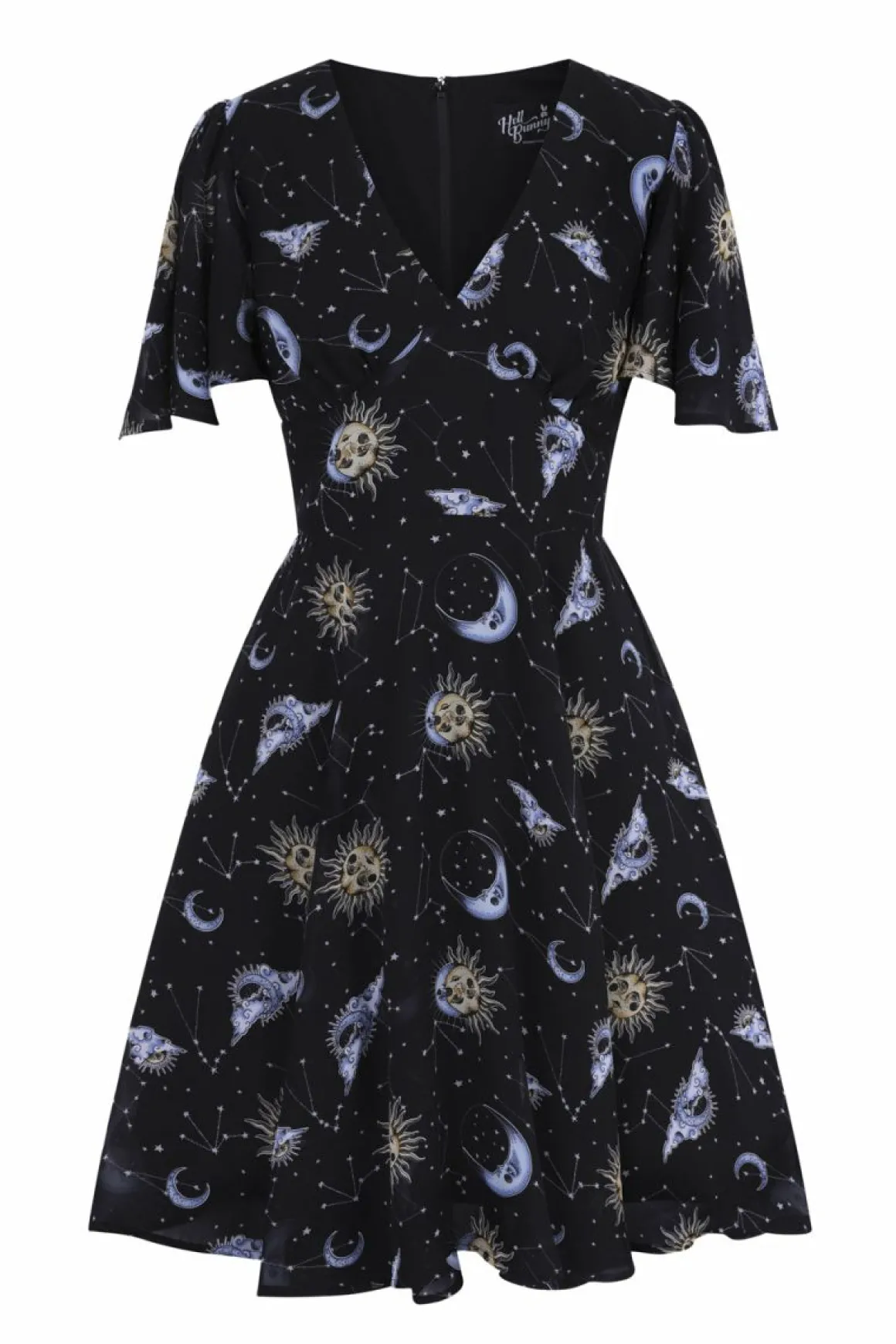 Printed Chiffon Dress.Sun And Moon Print On A Black BackgroundDraped SleevesV NecklineBlack Jersey Lining IncludedZip In…