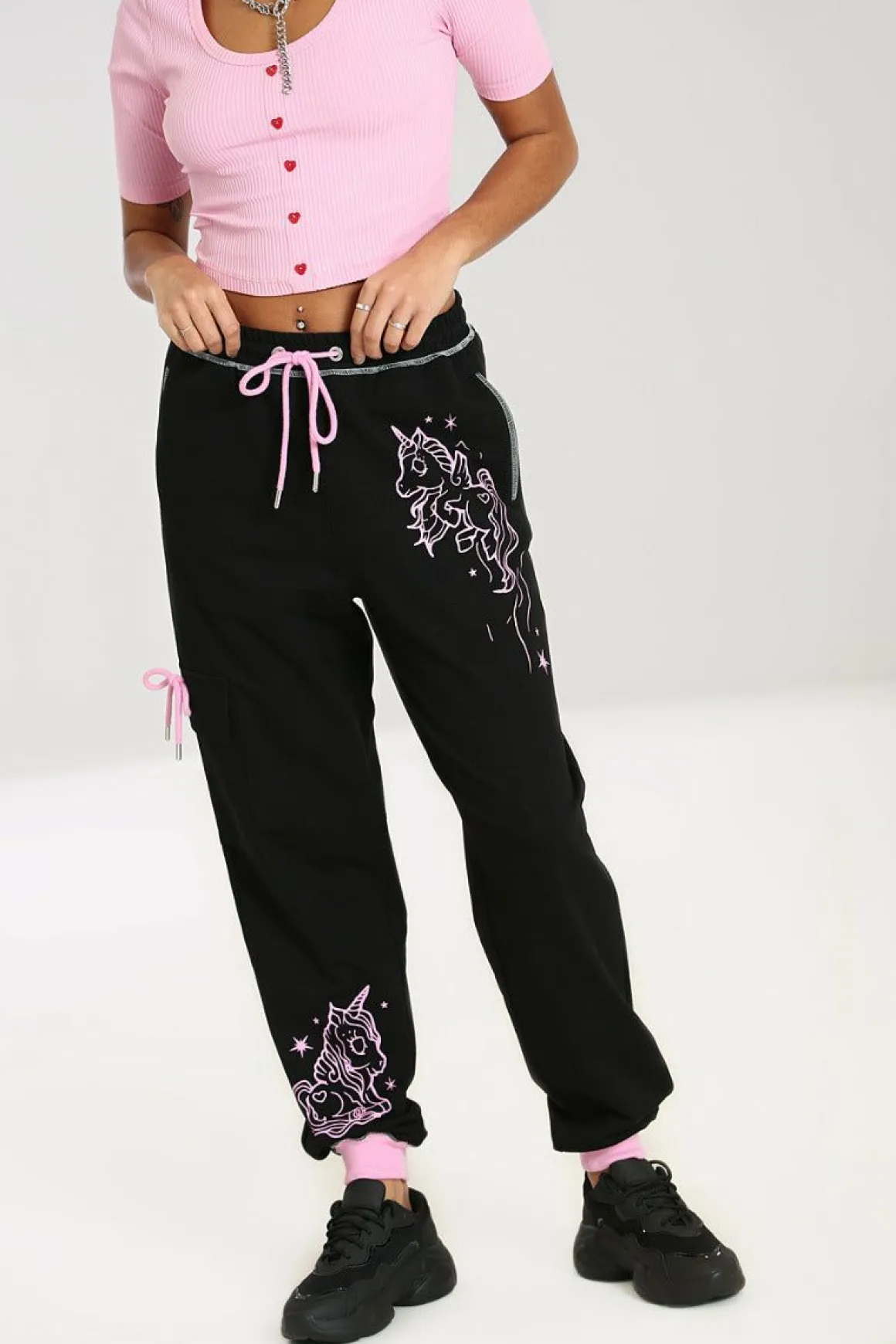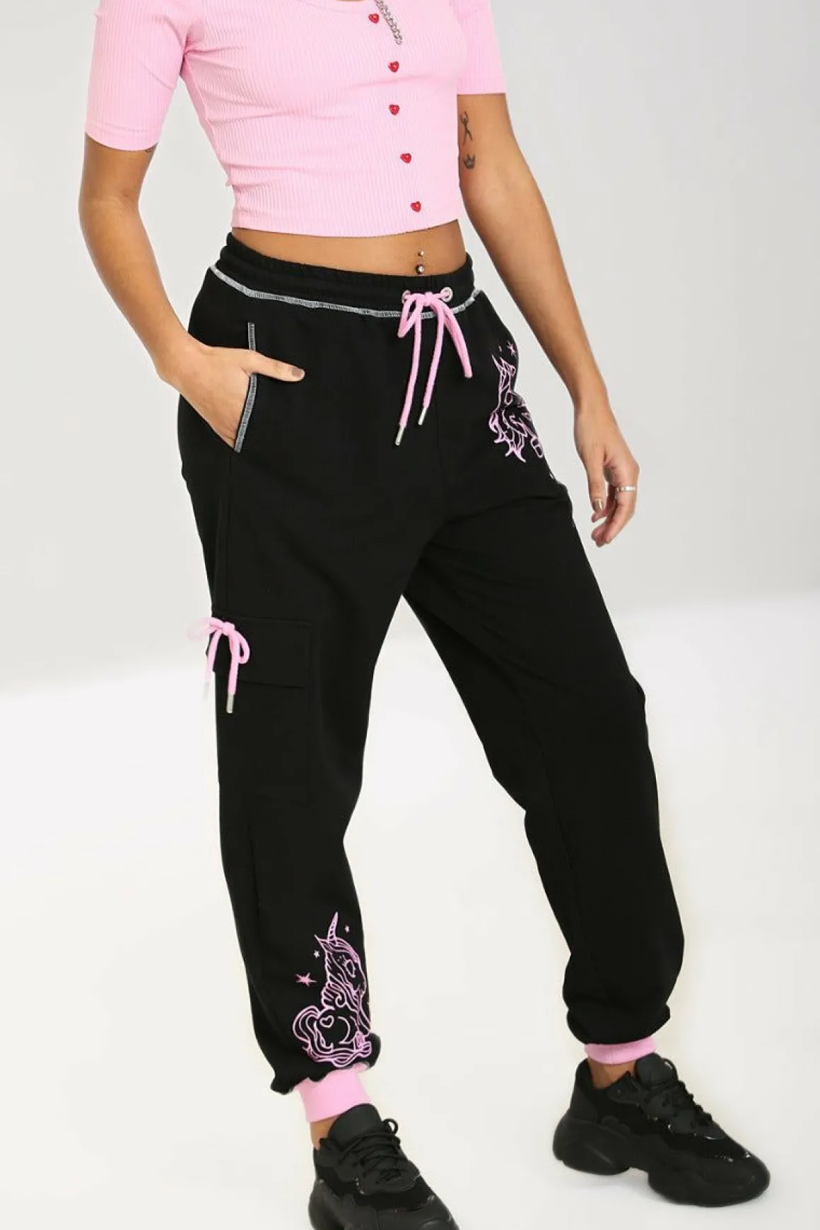 Black Jersey JoggersElasticatd Waistband With Pink Tie Pink Outline Of Unicorn Artwork On Front Of LegsPockets In Side S…