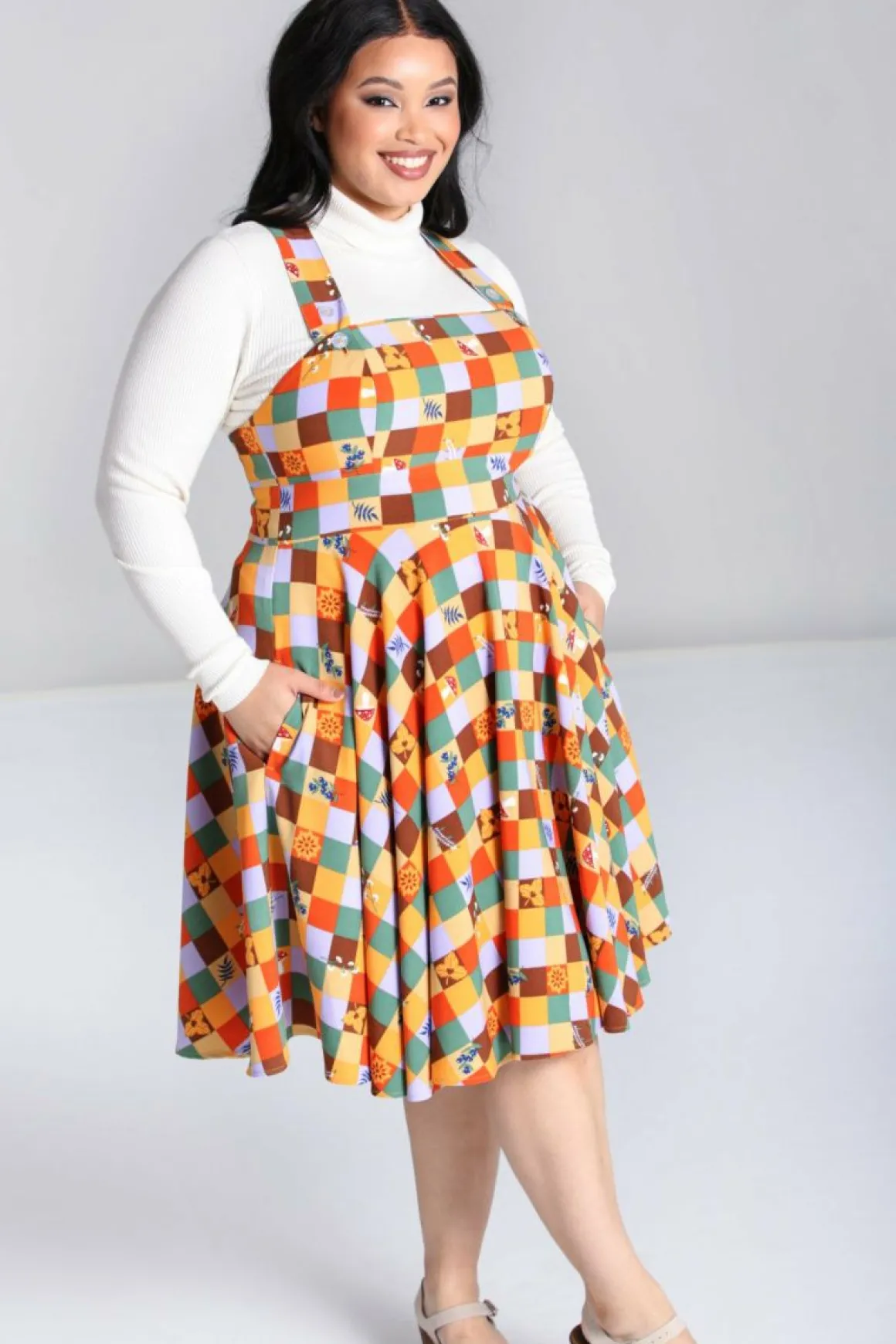 Printed Pinafore Dress Autumn Coloured Check With Scattered Nature Motifs Fitted Bodice With Straight Chestline Wide Str…