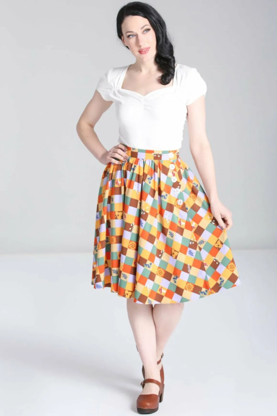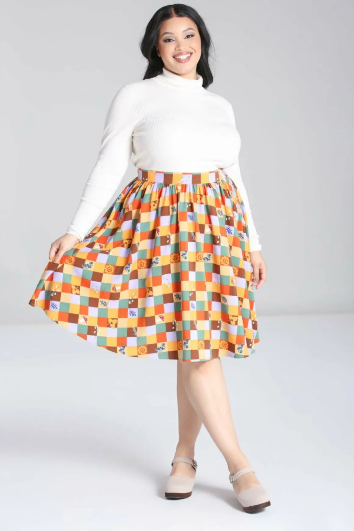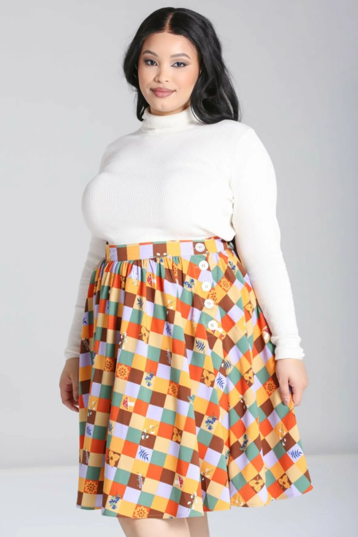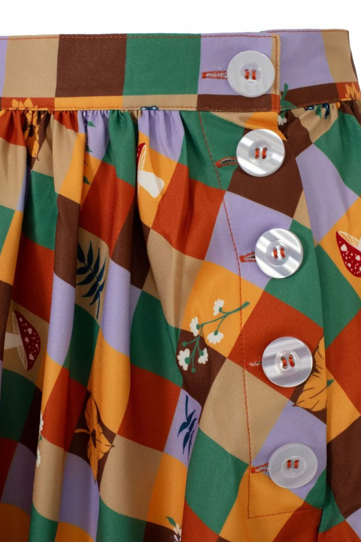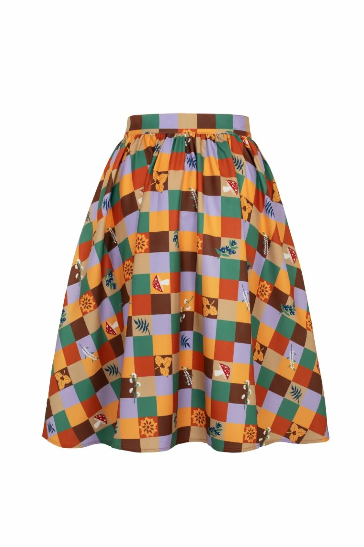 Printed Midi Skirt Autumn Coloured Check With Scattered Nature Motifs Waistband In Self Fabric Flared Skirt From Waistli…