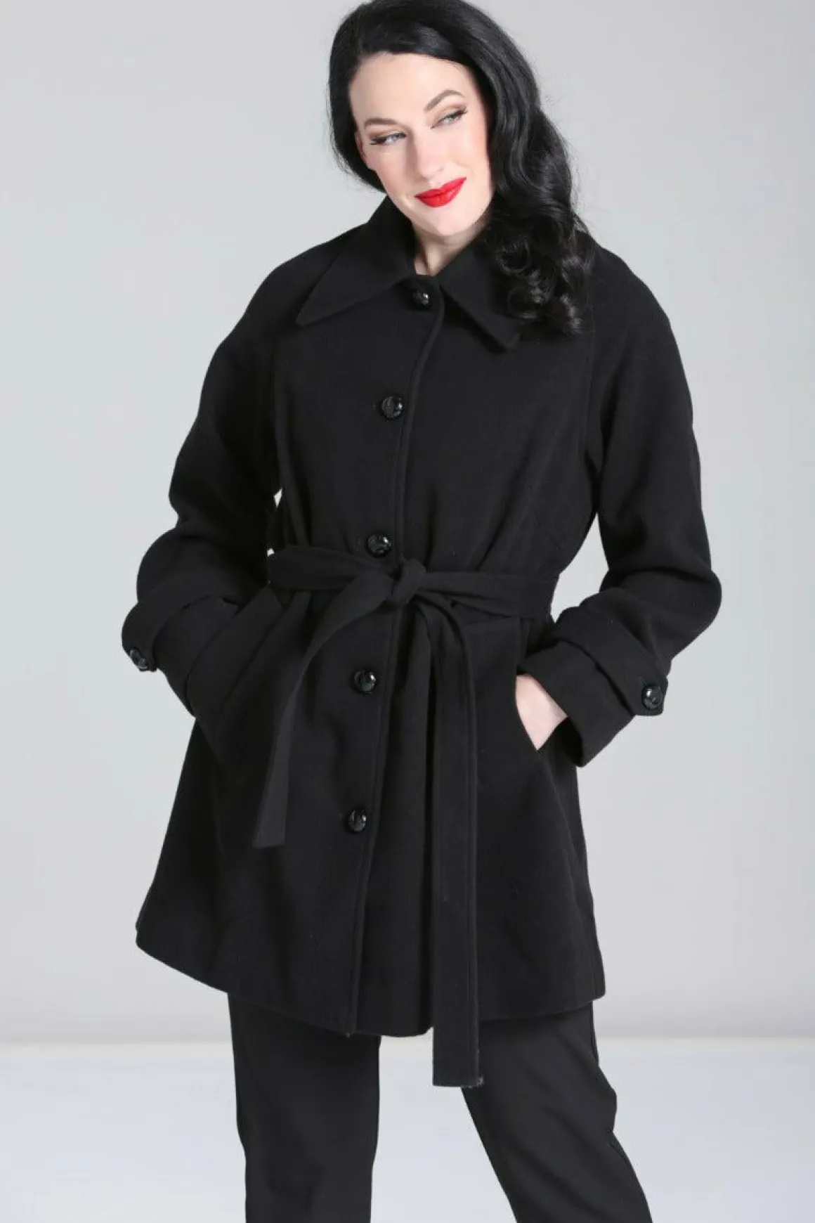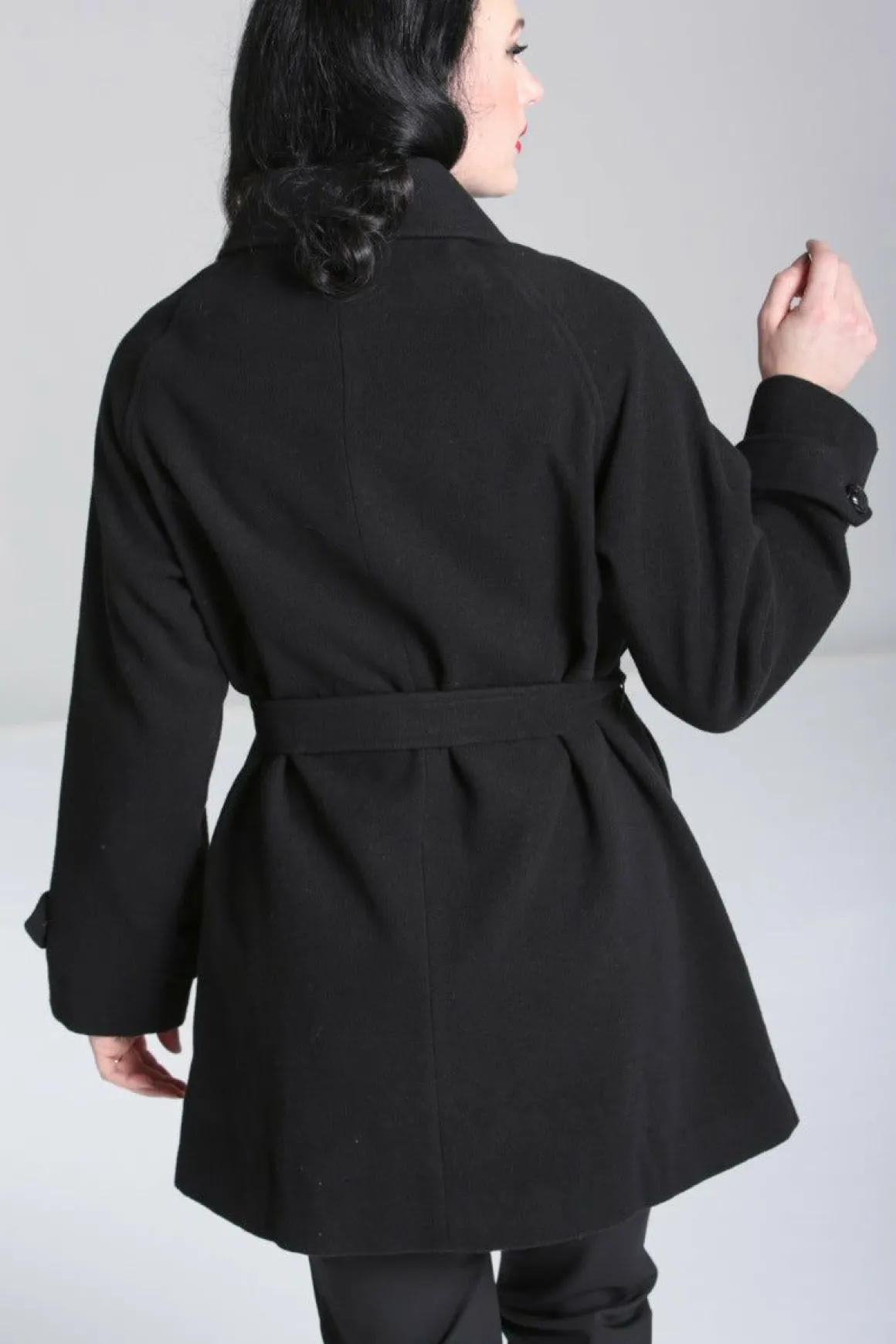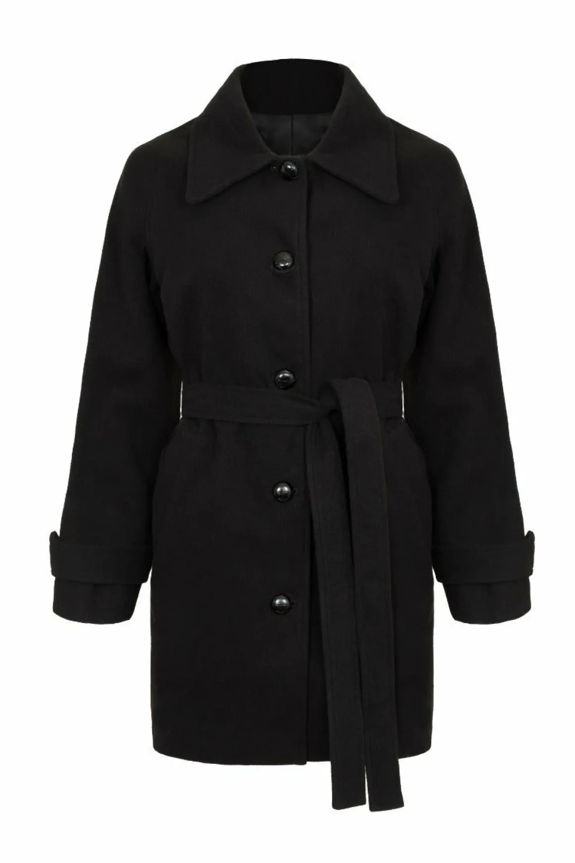 Black CoatFully Lined Large Pointed Collar In Self Fabric Black Button Up Centre Loose Fit Large Tab Detail In Self Fabr…