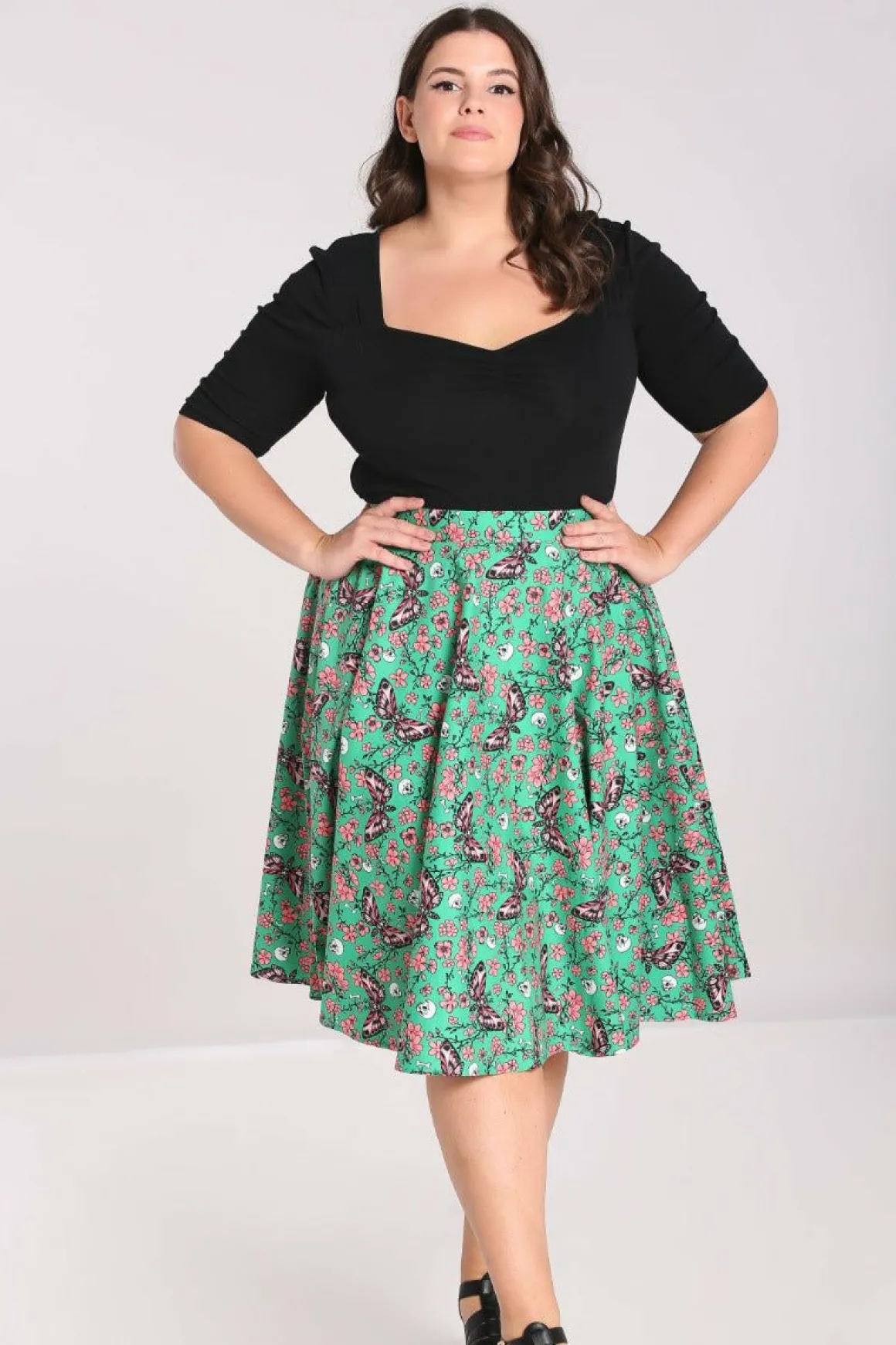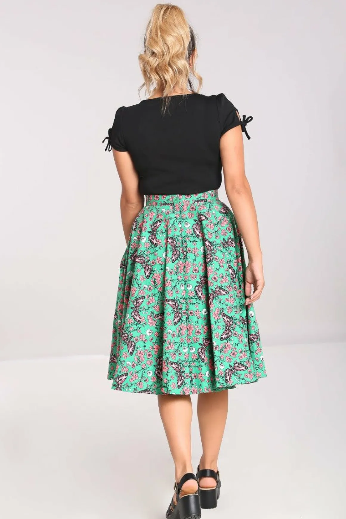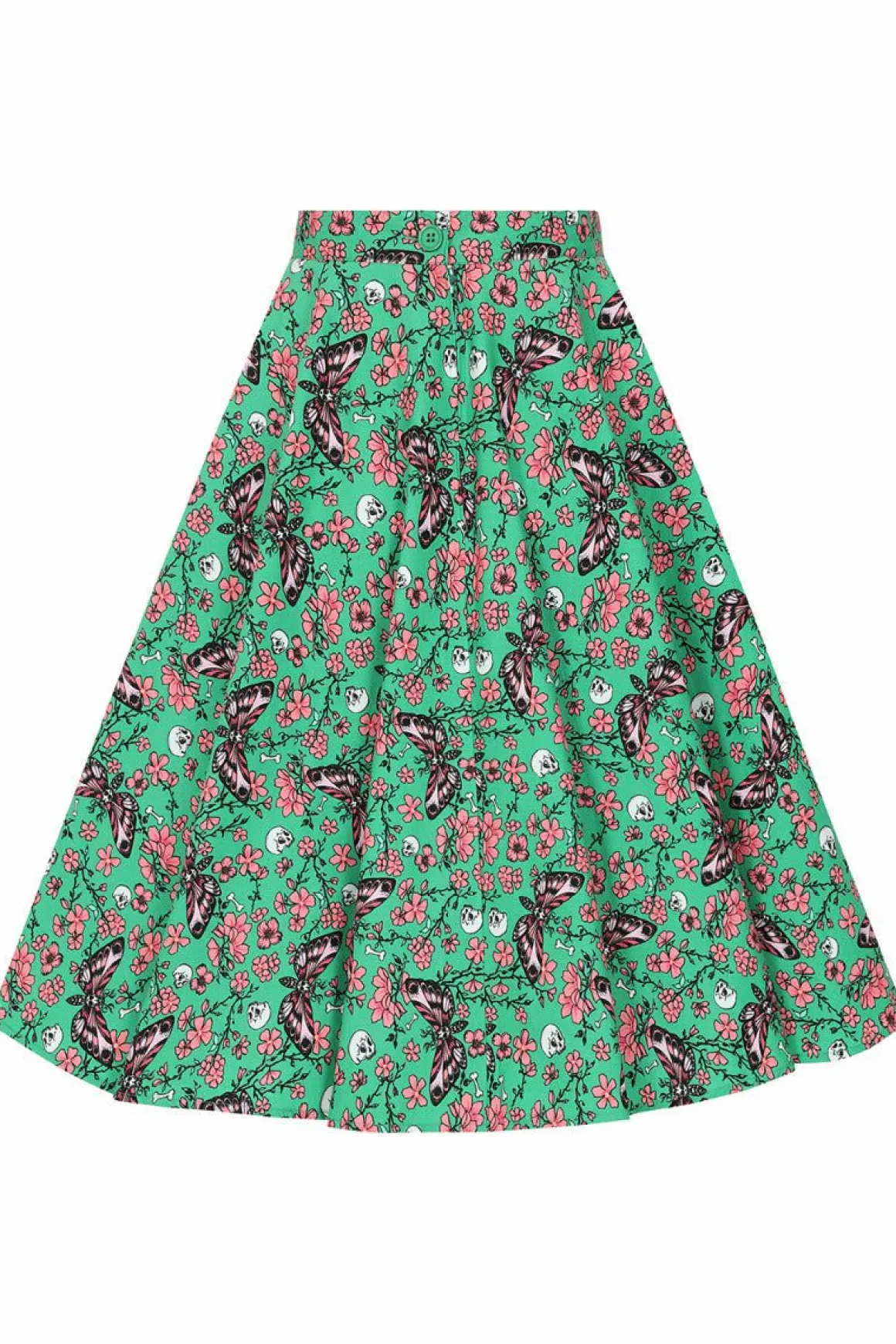 Printed Cotton 50’S SkirtPrint Is Illustrations Of Pink Moths & Flowers With Small Skulls On A Green BackgroundWaistband…