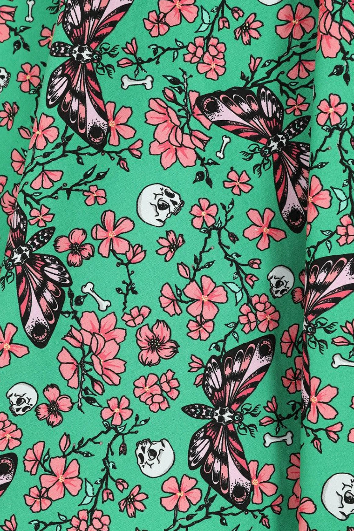 - Print Is Illustrations Of Pink Moths & Flowers With Small Skulls On A Green Background