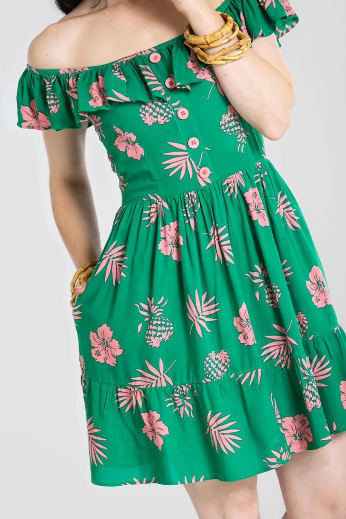 Printed Viscose Mini DressArtwork Is Of Silouettes Of Tropical Flowers And Pineapples OverContrast Buttons On Fake Plack…