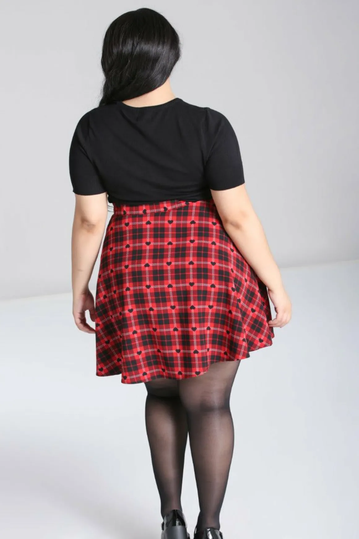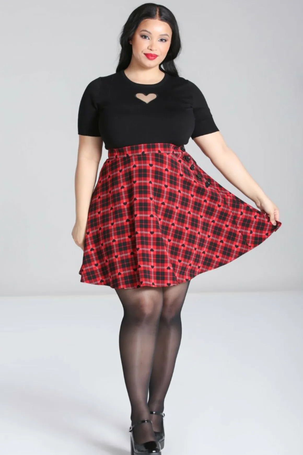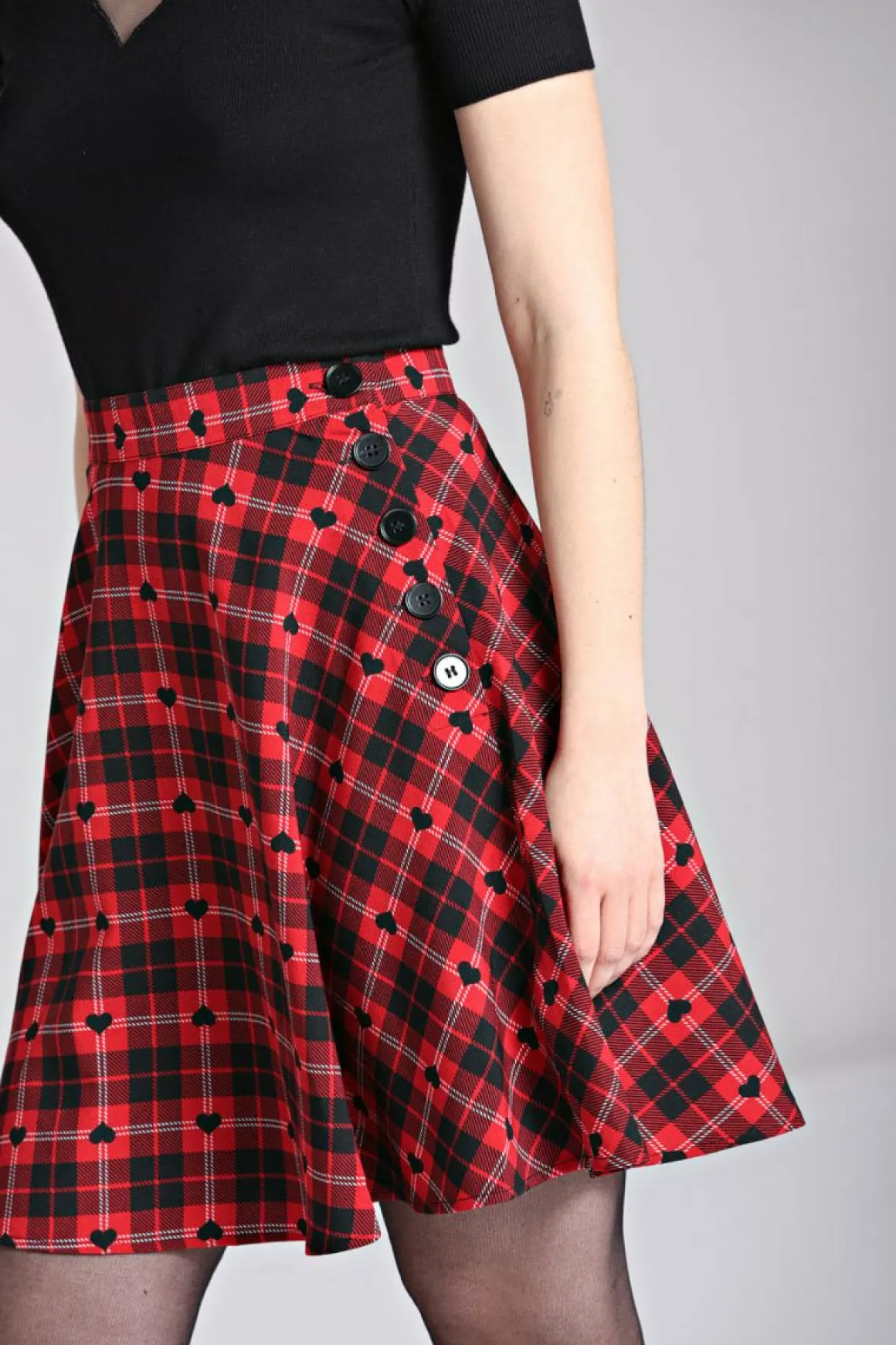 Red And Black Printed Tartan With Little Black Hearts All OverWaistband In Self FabricSkater Style SkirtBlack Button Fas…
