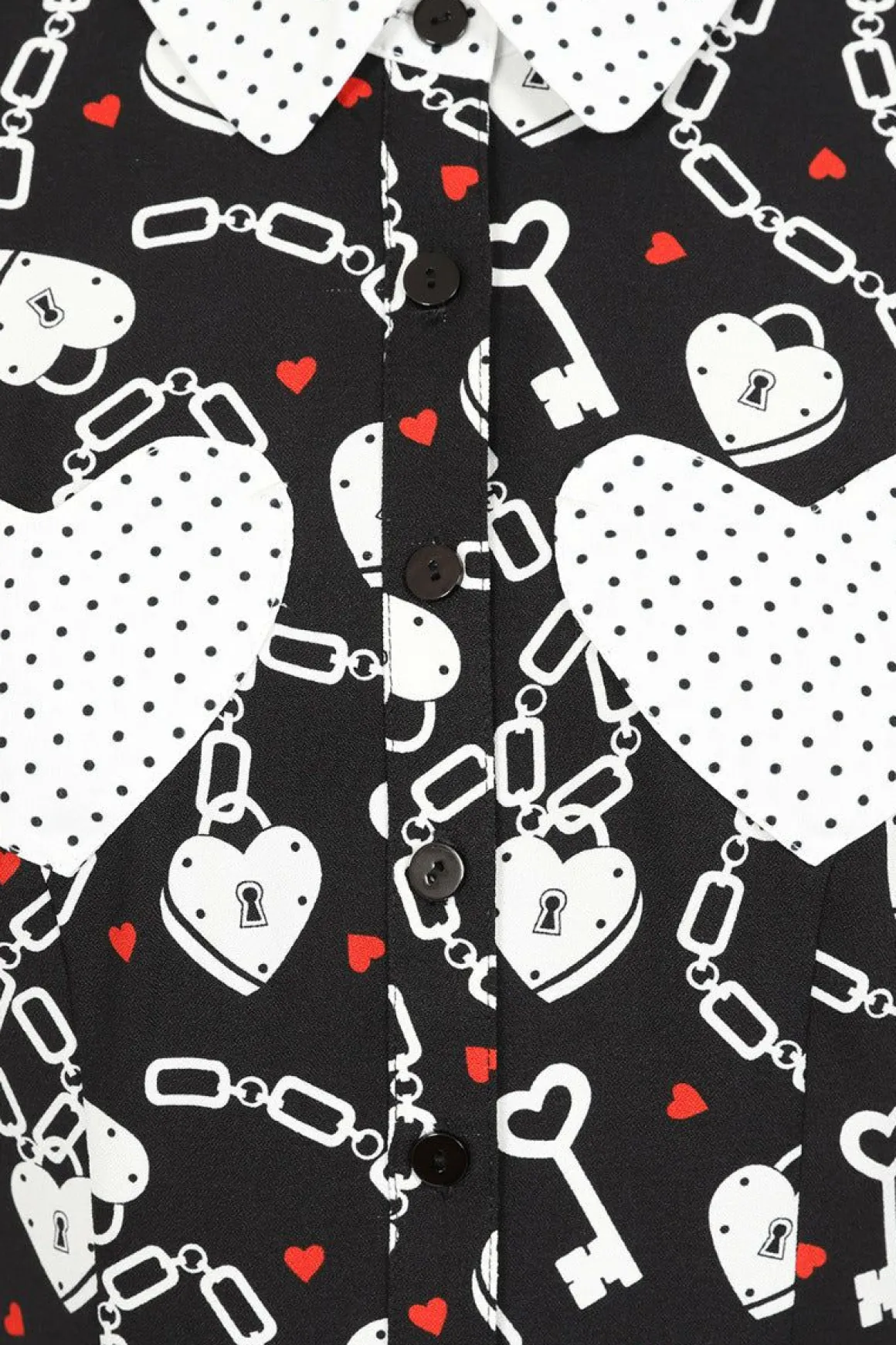 - Black Fit-And-Flare Mini Dress Printed With Red Hearts And White Chains & Padlocks