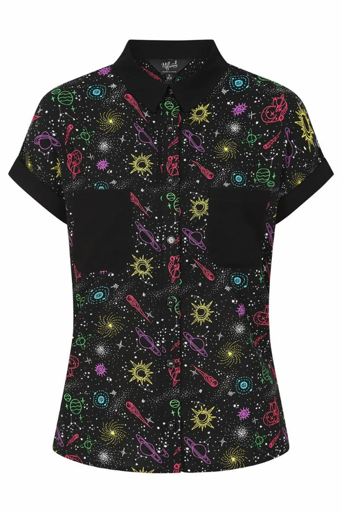 Viscose Printed ShirtBlack Base With Colourful Outlines Of Celestial MotifsPlain Black Pointed Collar Button Up Placket …