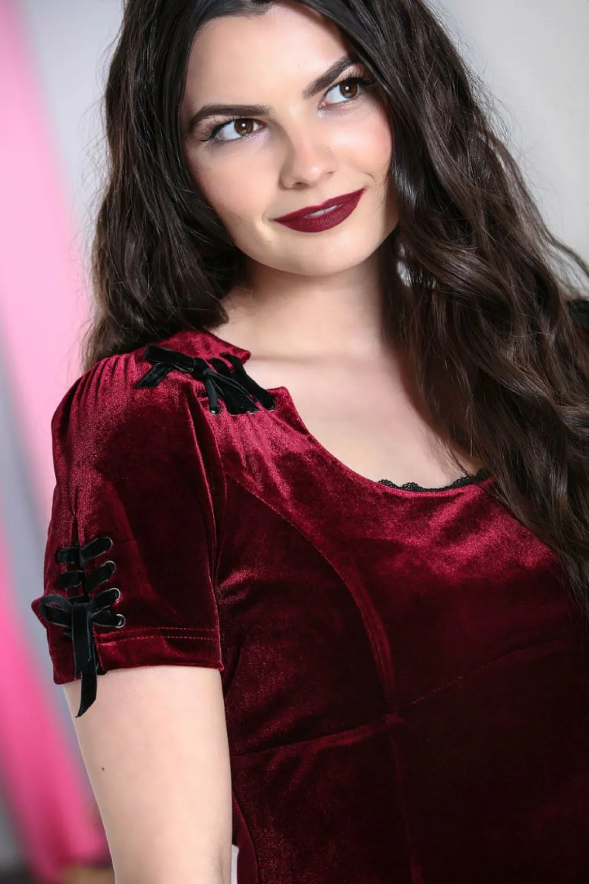 Burgundy Stretch Velvet Mini DressLow Chestline With Lace Trim Along BustCorset Detailing On Front Shoulder & On Sleeves…