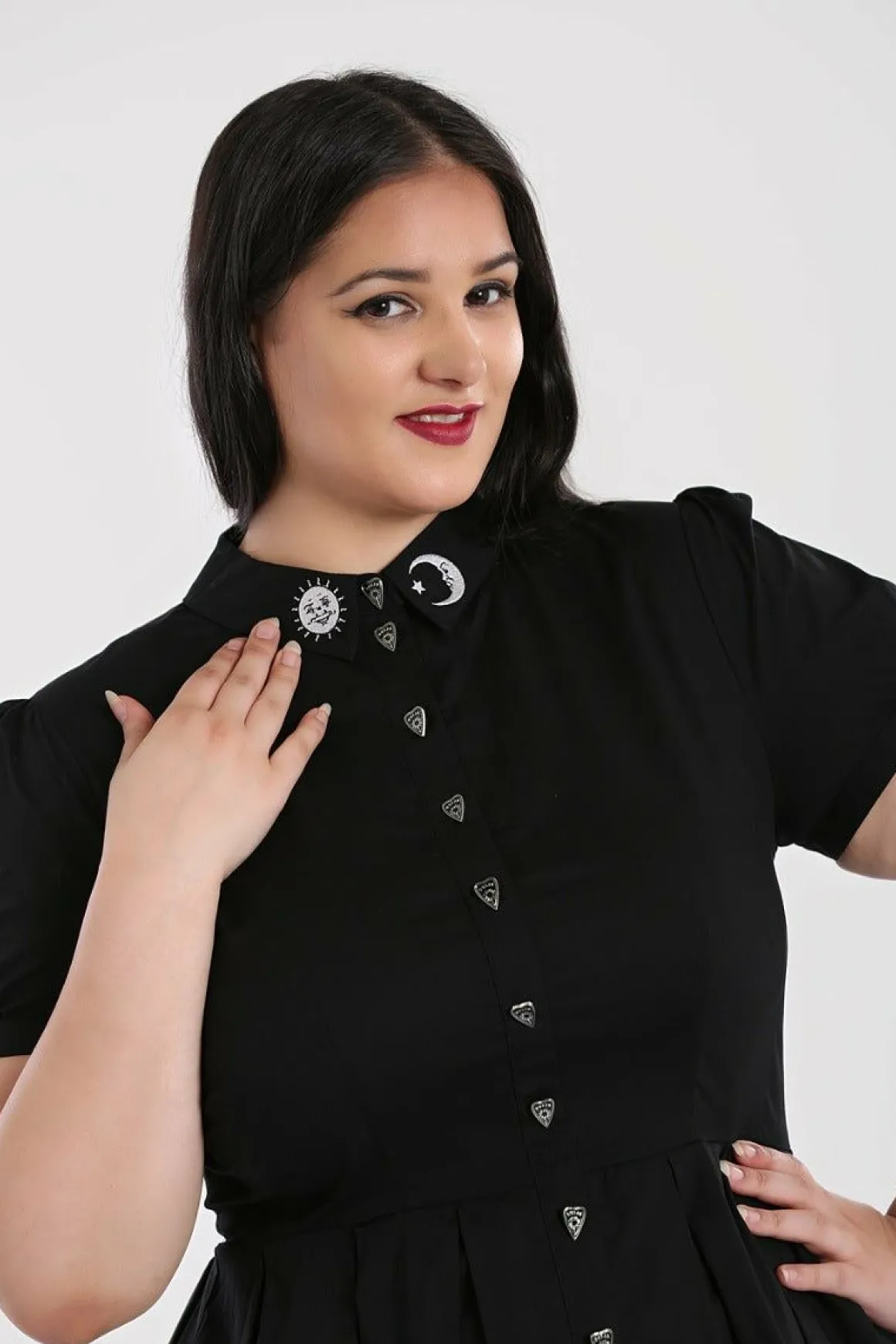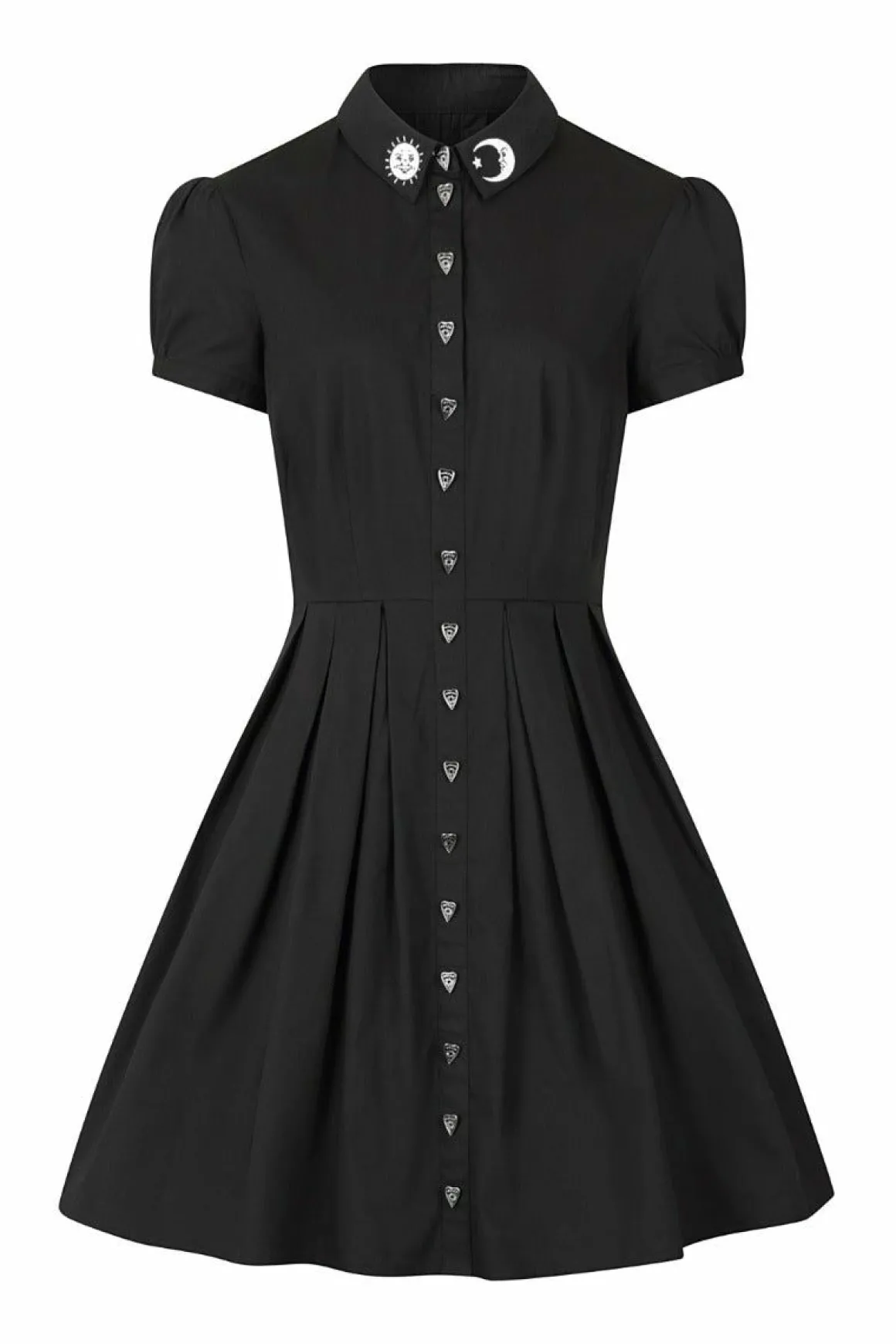 Black Dress With Embroidery Of Sun & Moon On CollarFake Placket In The Centre FrontPlacket Opens From The Chest Up, So C…