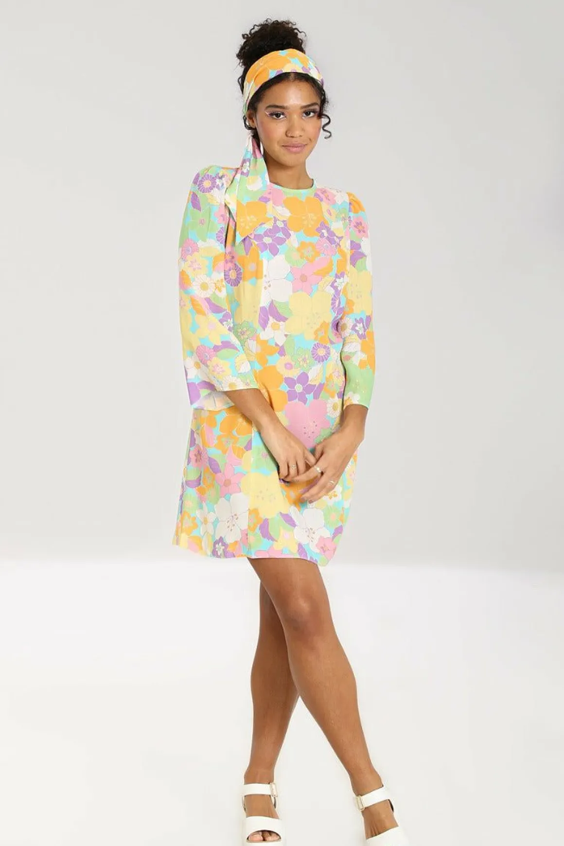 Pastel Retro Floral Mini Dress3/4 Length Sleeves With Slight Flare High NecklinePrincess Seams To Shape Length To Mid-Th…