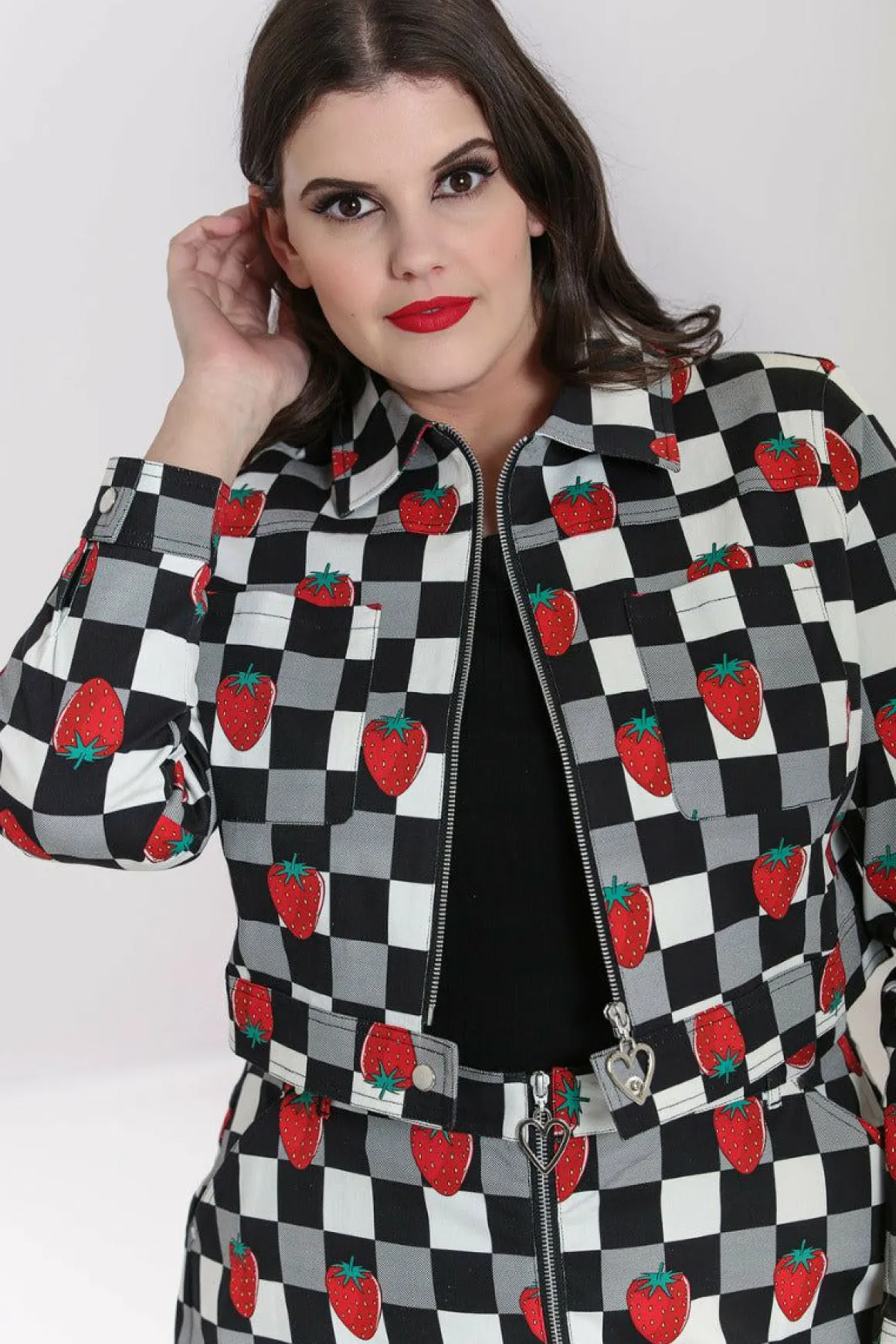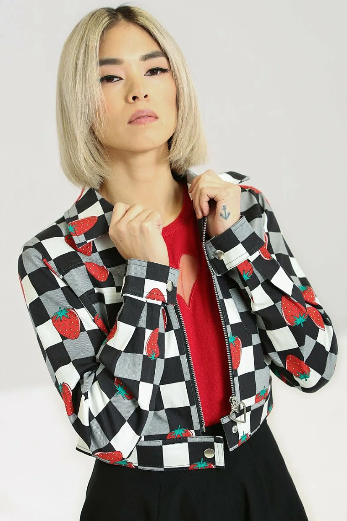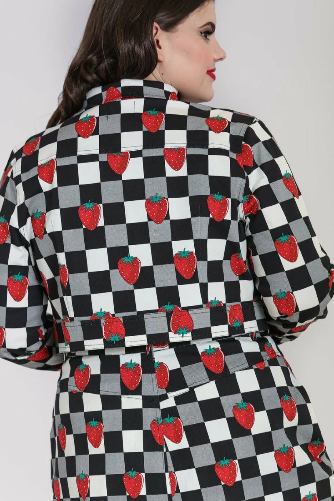 - Black And White Check Cropped Jacket Decorated With Bright Red Strawberries