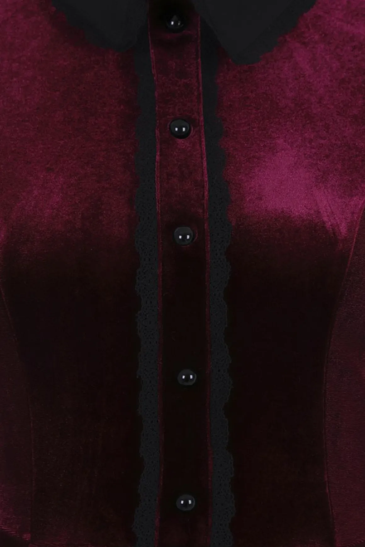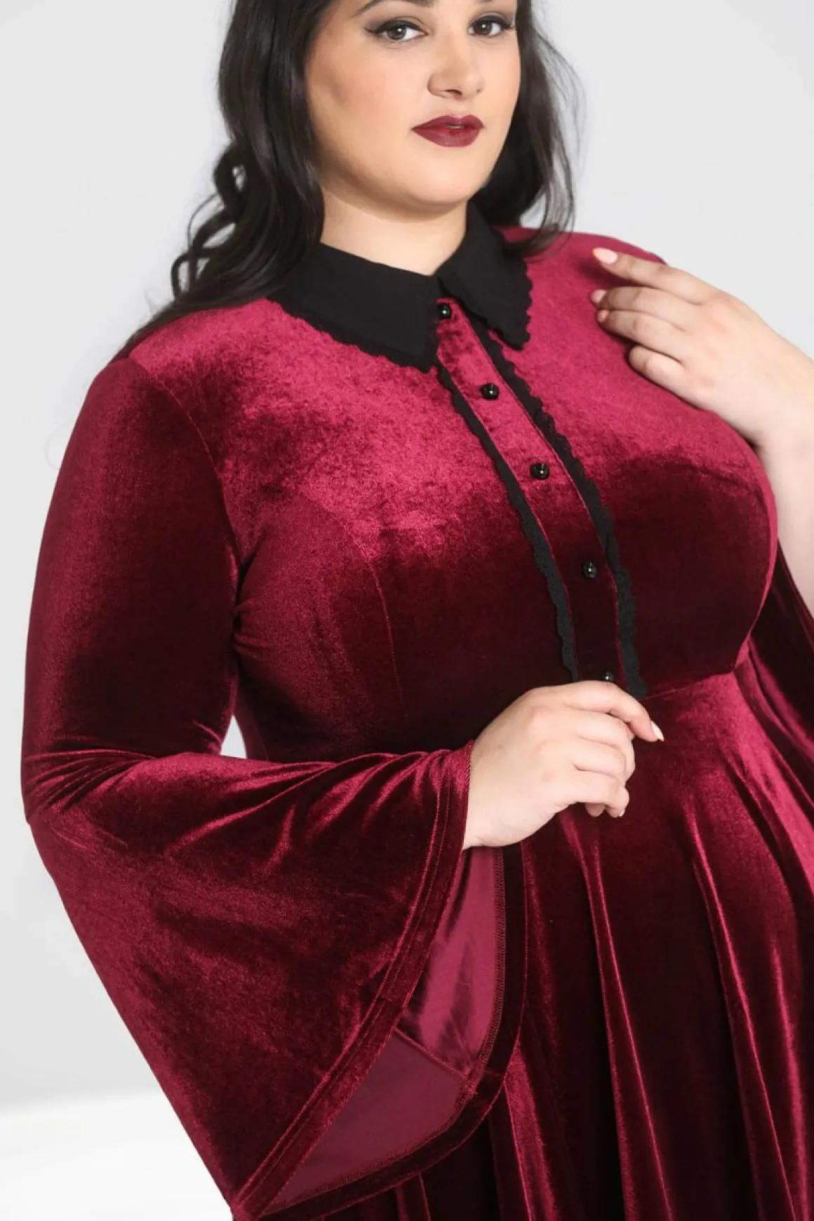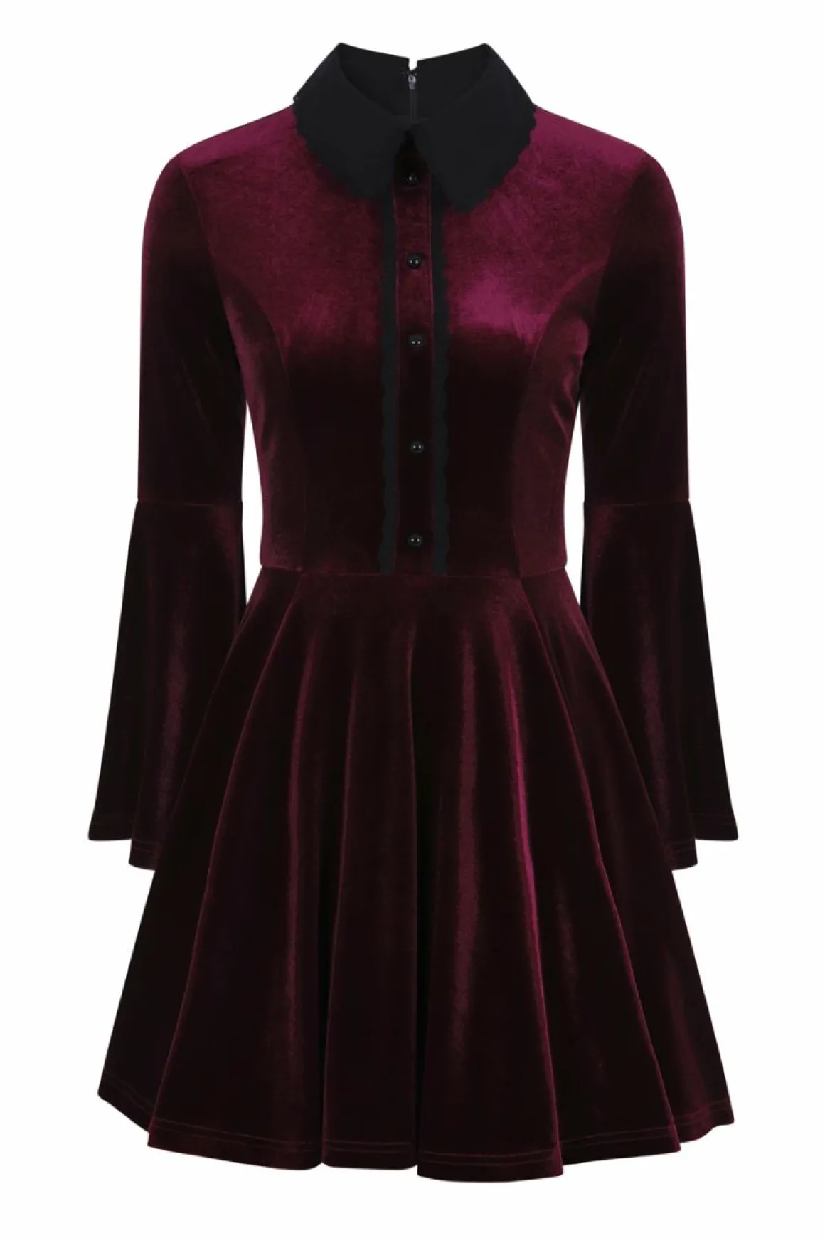 Wine Coloured Dress With Black TrimsWaist Seam.Set In Waistband In Self Fabric.Bell Sleeves In Self FabricPlacket With B…
