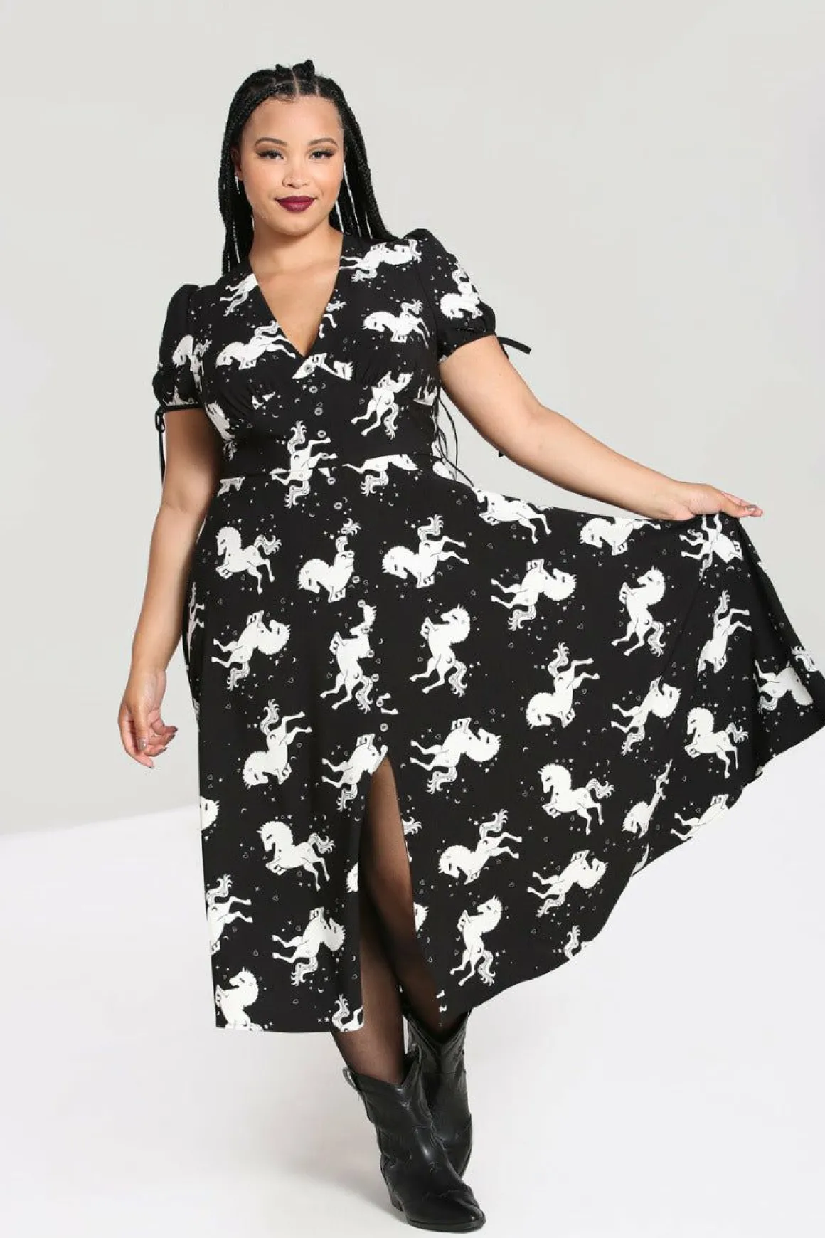 - Black A-Line Long Maxi Dress Printed With White Horses And Stars