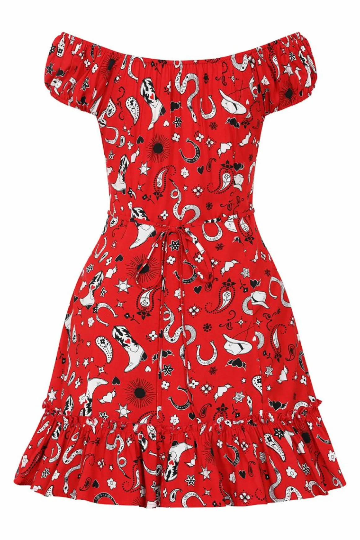 Printed Mini Viscose DressRed Base Fabric With Cowboy Hats, Boots, Snakes & Various Motifs In White Cap Sleeves With Ela…