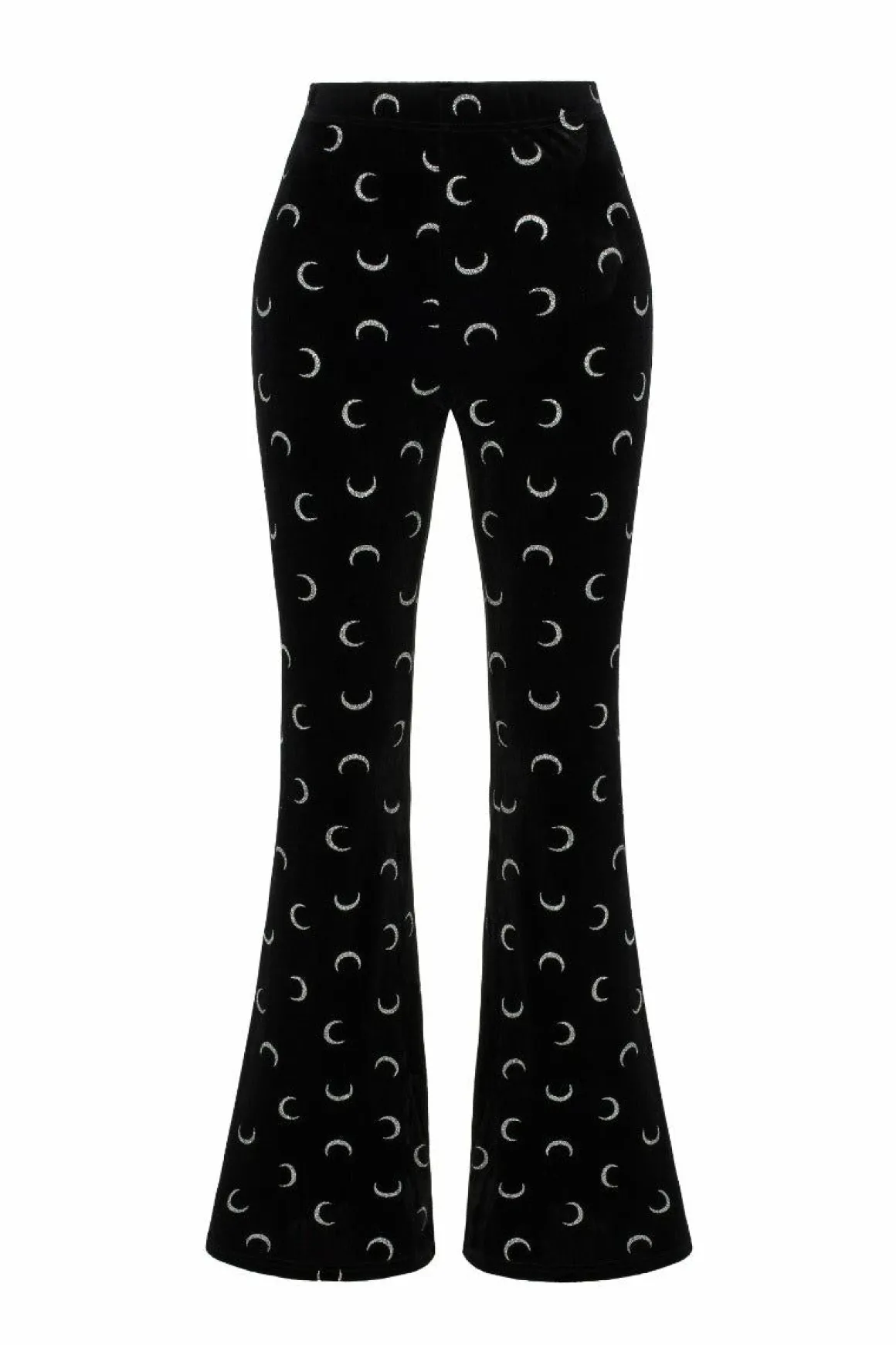 Black Velvet Stretch FlaresBlack Velvet With Silver Glittery Crescent Moons All Over Wide Elastic Waistband In Self Fabr…