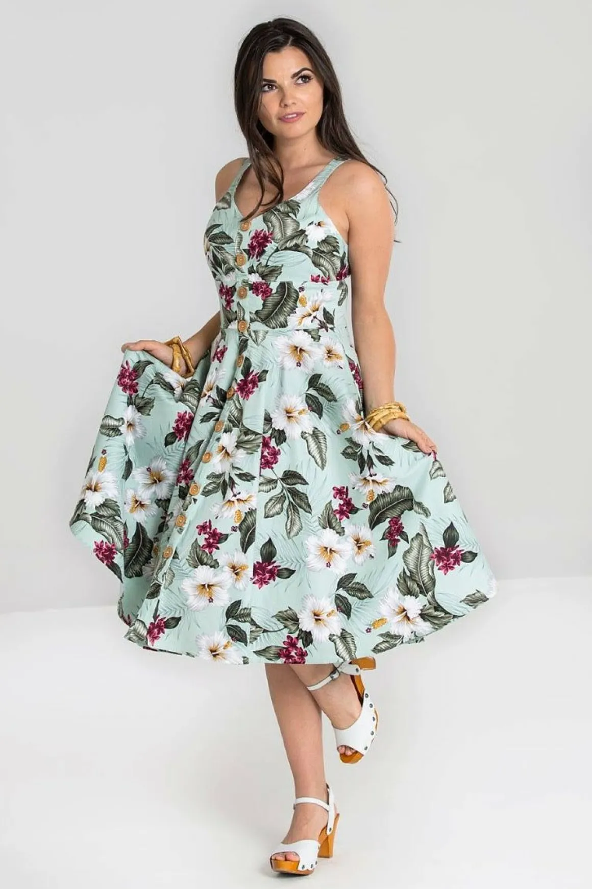 Printed 50’S Dress.Print Is Of Hibiscus Flowers On A Green Background.Mock Up Placket At Centre Front.11 Wooden Look But…