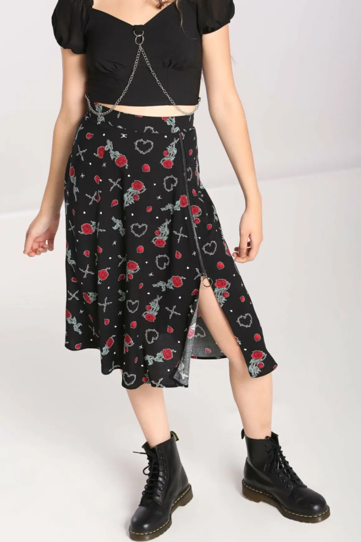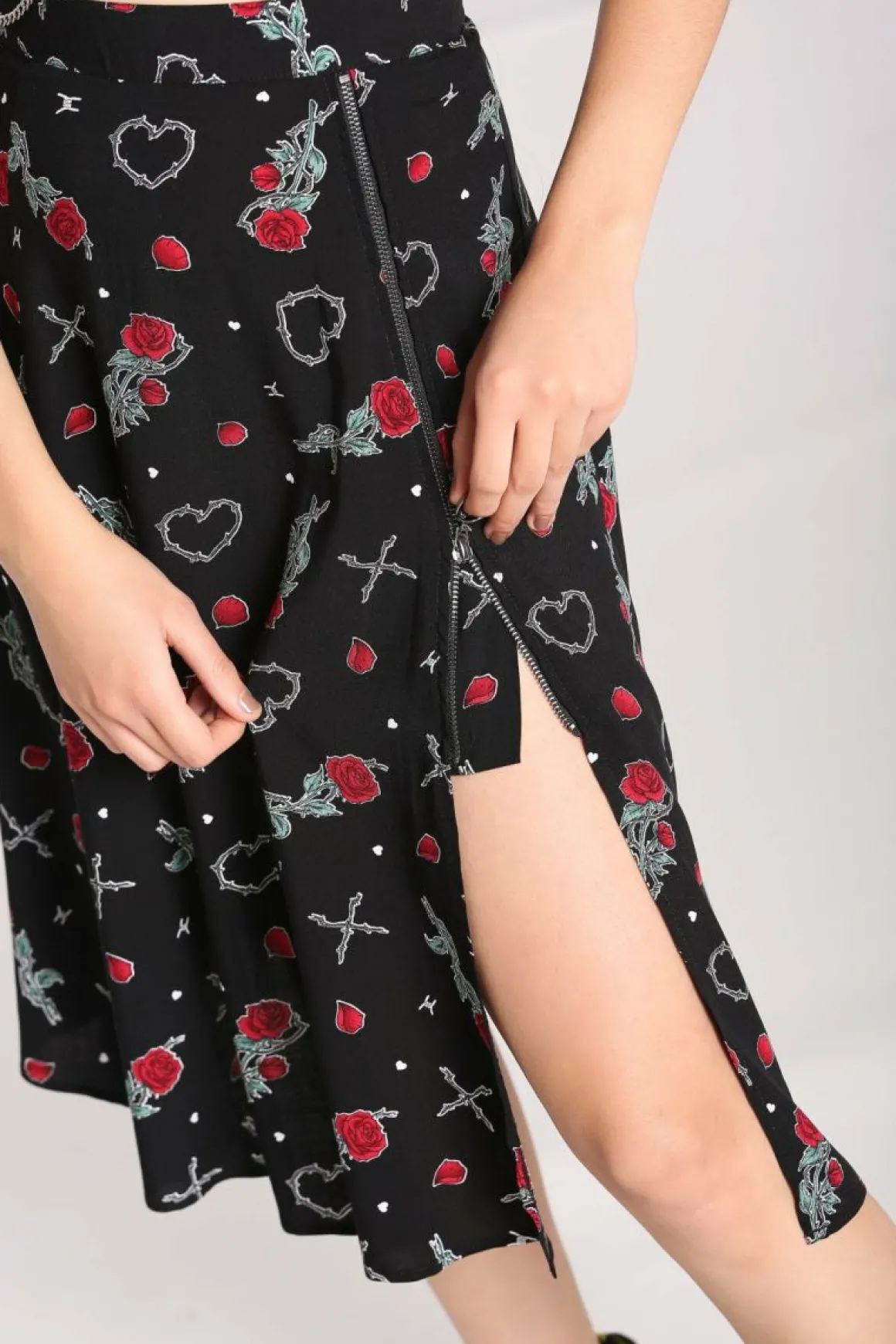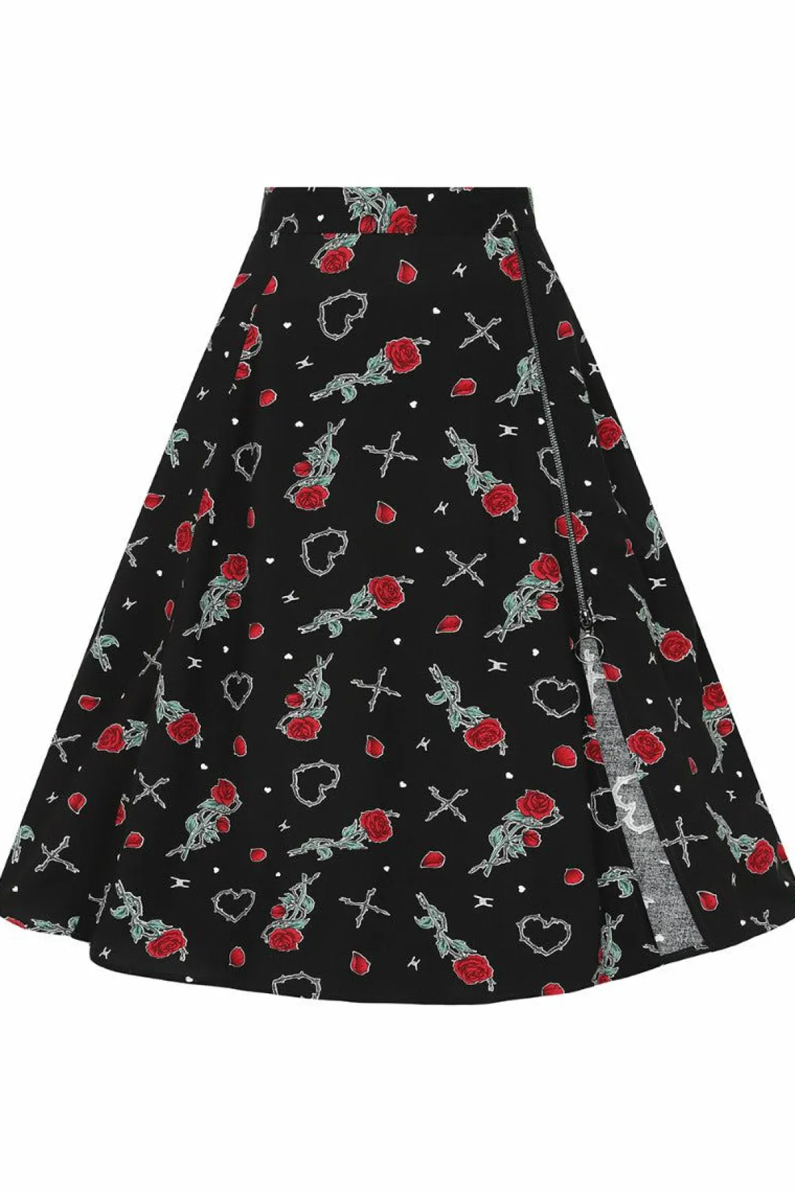 Viscose Printed Mid SkirtBlack Base With Barbed Wire Hearts & Red Roses All Over Waistband In Self Fabric2 Front SeamsEx…
