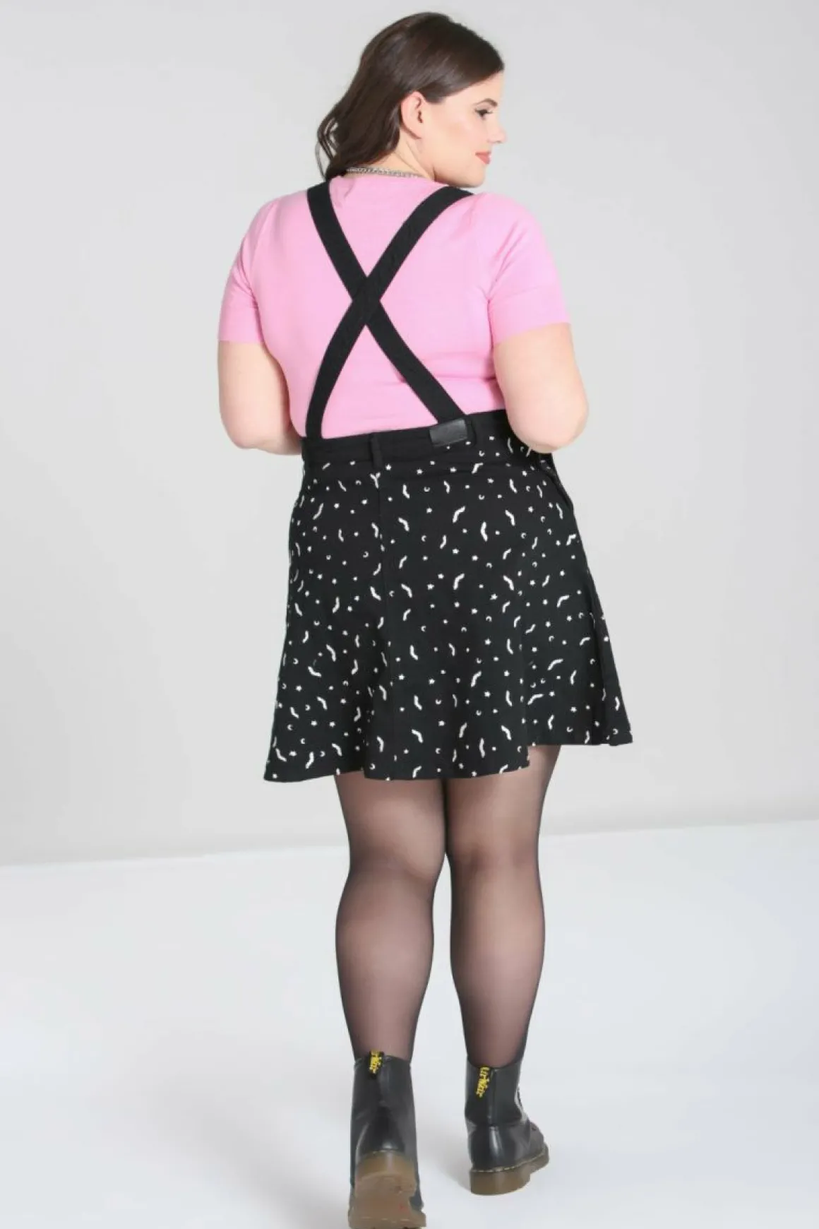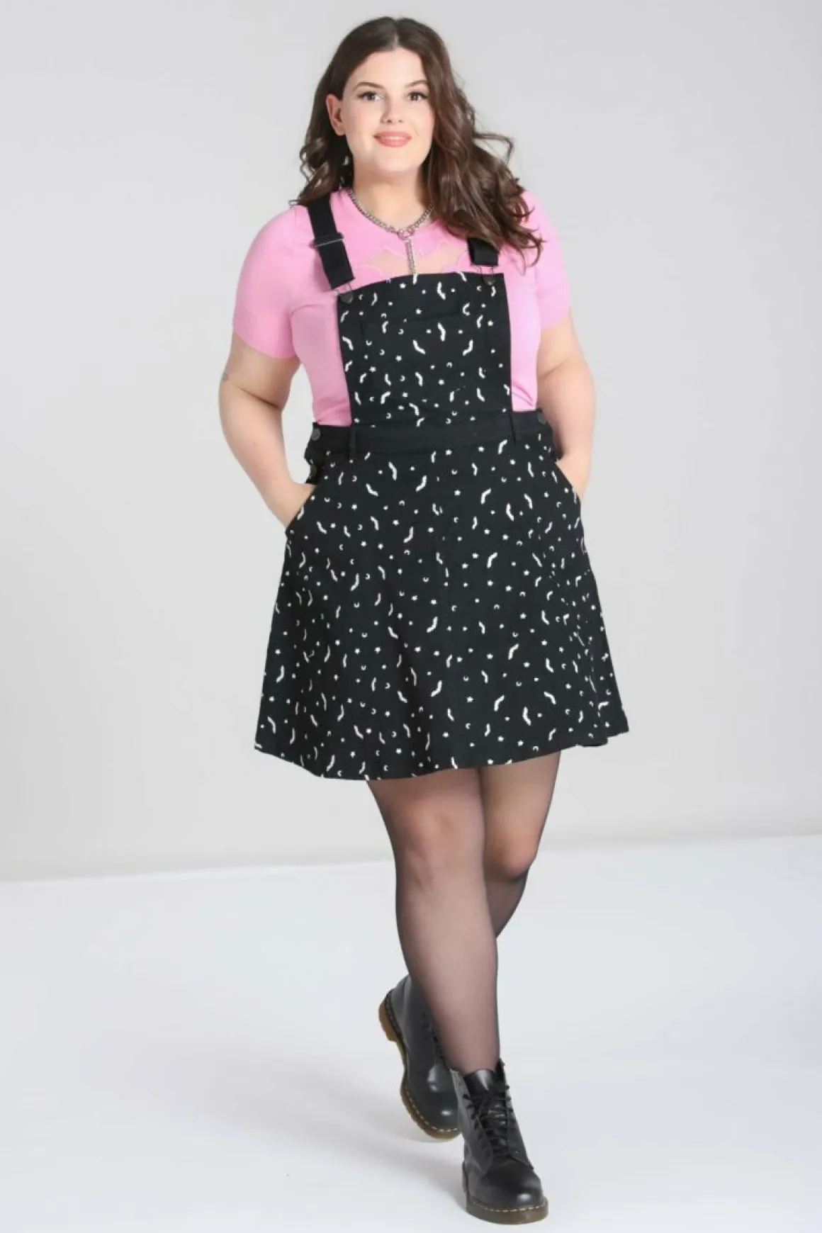 Black Pinafore DressBats & Moons Embroidery All Over In Contrasting Colour Pocket On Front PanelCross Over Adjustable St…