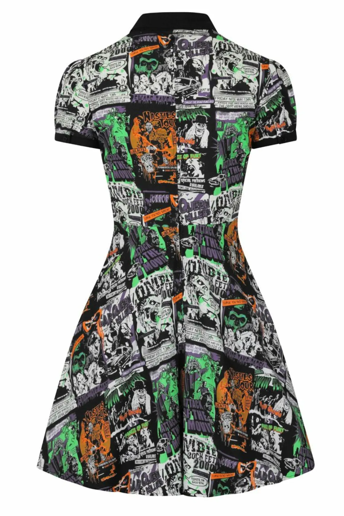 Printed Mini Dress With Black Contrasting CollarRecolour Of A Hell Bunny Classic Print, B-Movie Comic Print In Bright Pu…