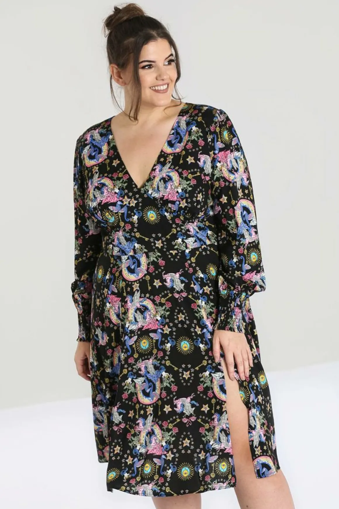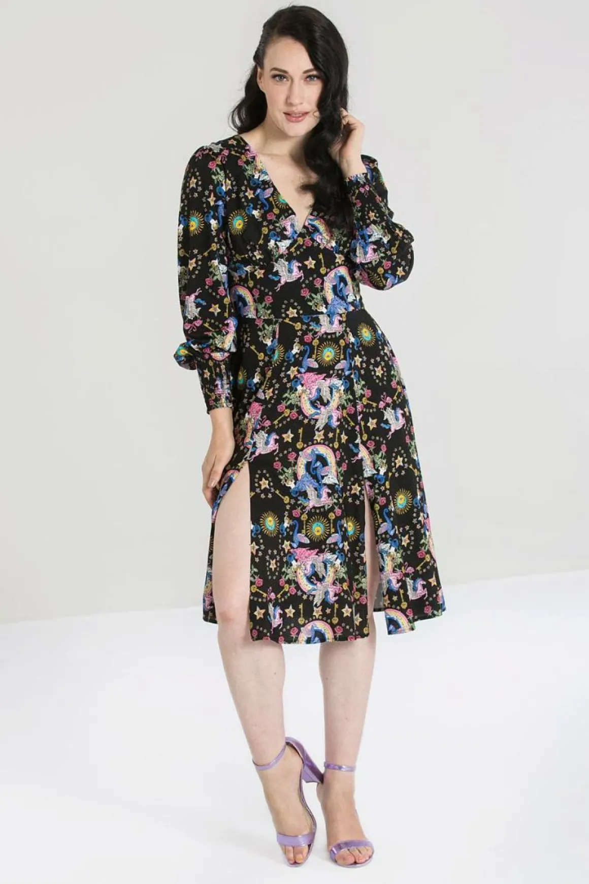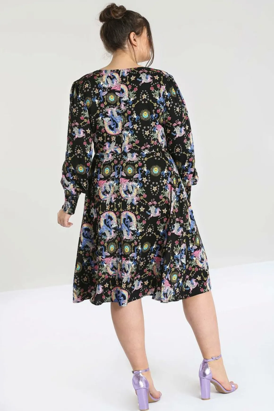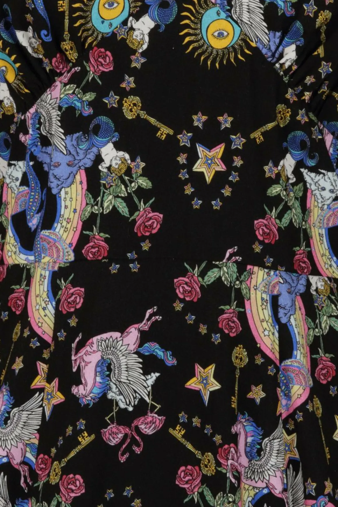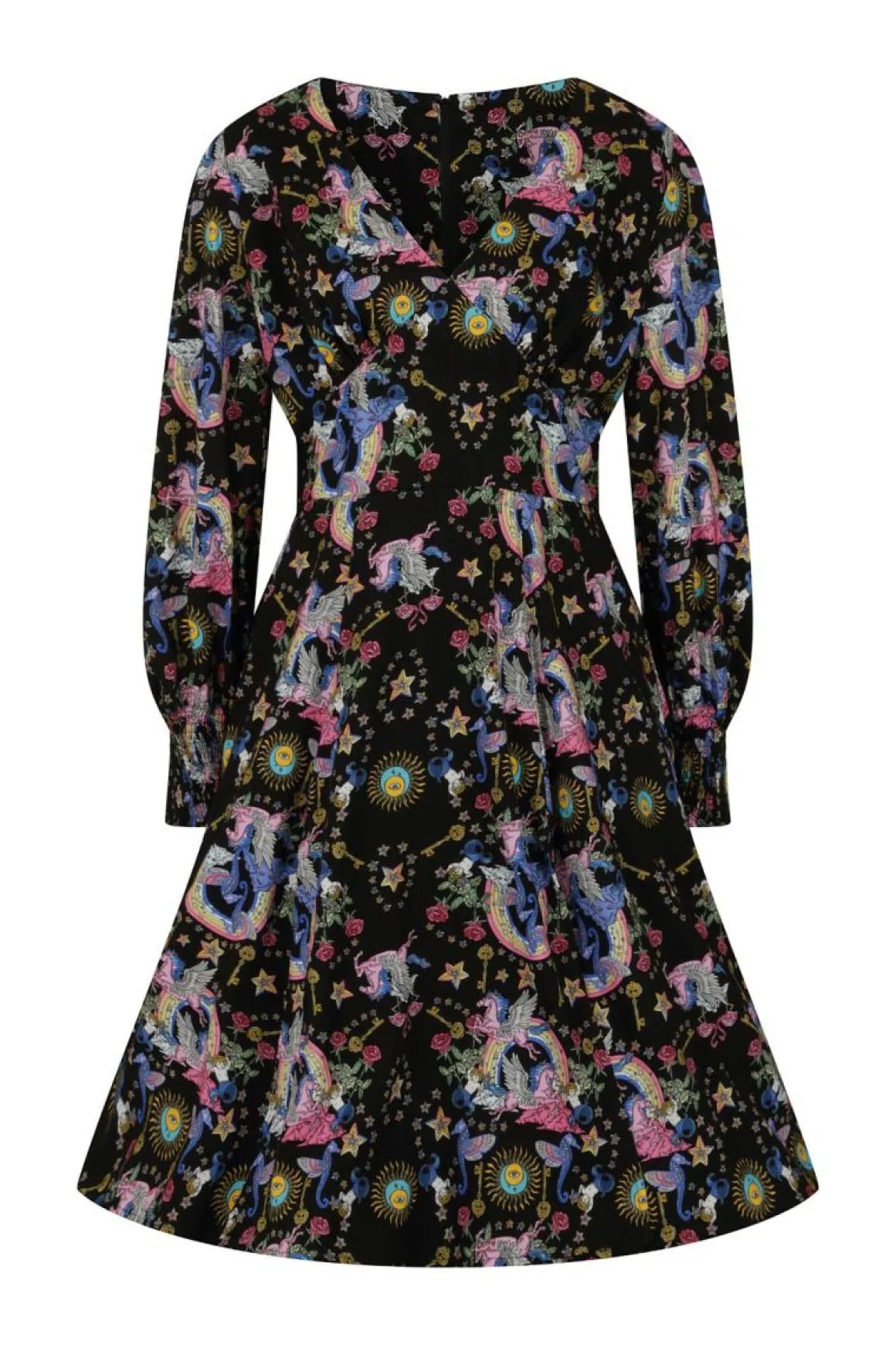 Printed Long Sleeved Dress With V NecklineRainbow Unicorn Print Ona Black BackgroundShearing Detail At CuffCentre Back Z…