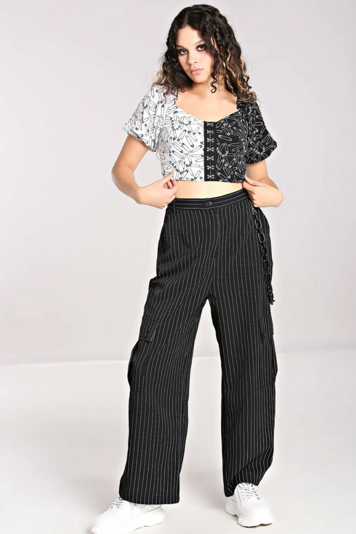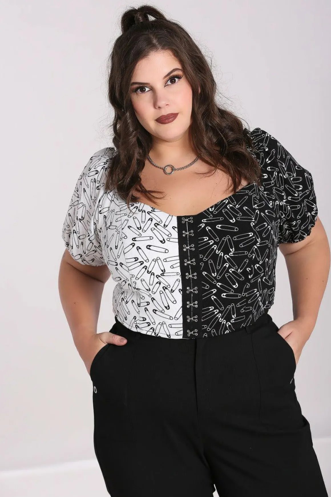 Printed Crop TopHalf Black & Half White Fabric With Contrasting Safety Pin GraphicsPuff Sleeves With Elasticated Cuff, C…